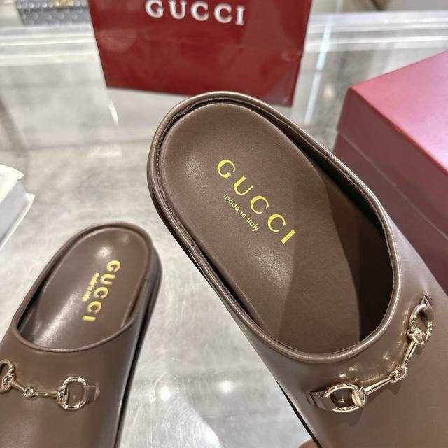 新款牛皮反绒马衔扣女士裸脚拖鞋 Gg在 2025 早秋系列中继续使用档案符号。Horsebit 硬件让人想起品牌的马术传统,出现在这双 Camel 和牛皮高周波压 Gg 穆勒鞋上。 咖啡色牛皮 马衔扣装饰 金色五金配件 皮革内里 圆头 橡胶鞋底 平底 意大利制造 码数:36~42码