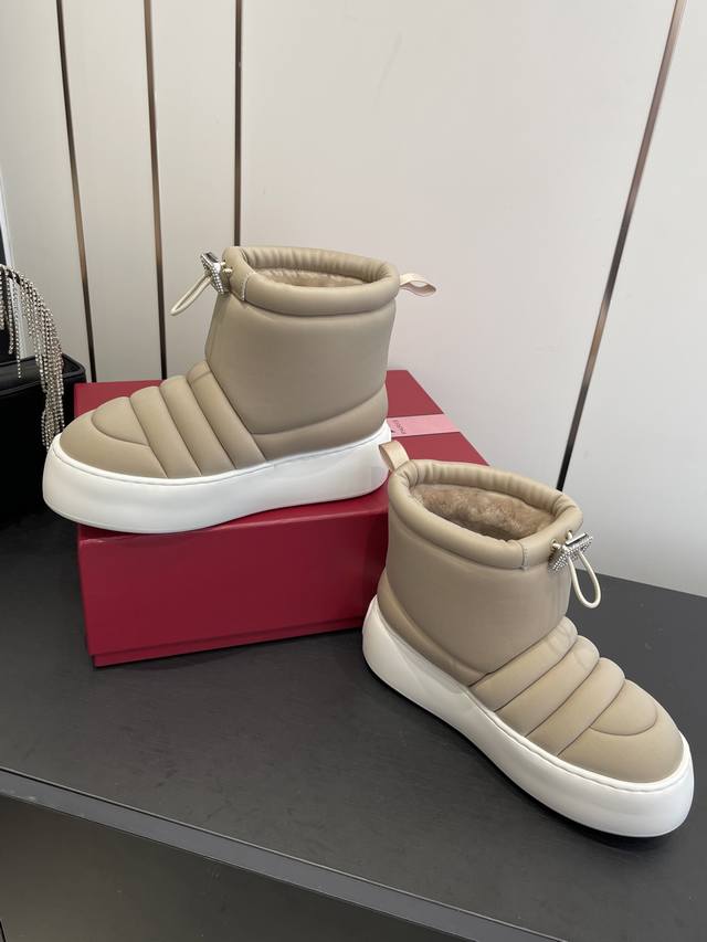 / 新款 雪地靴 蓬松织物短靴 厚底泡芙靴. DDD 鞋面以衍缝夹棉织物制成,柔软舒适,轻便的Eva材质鞋底宛如瑜伽垫,尽显挺拔身姿又保暖,配有带闪钻饰扣的抽绳,绵