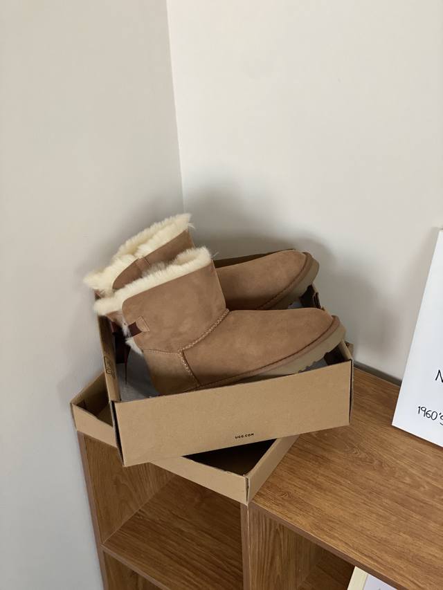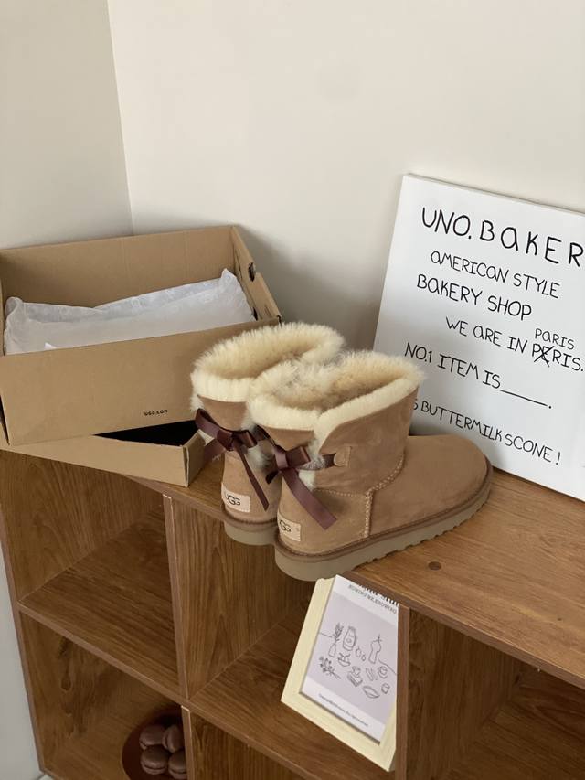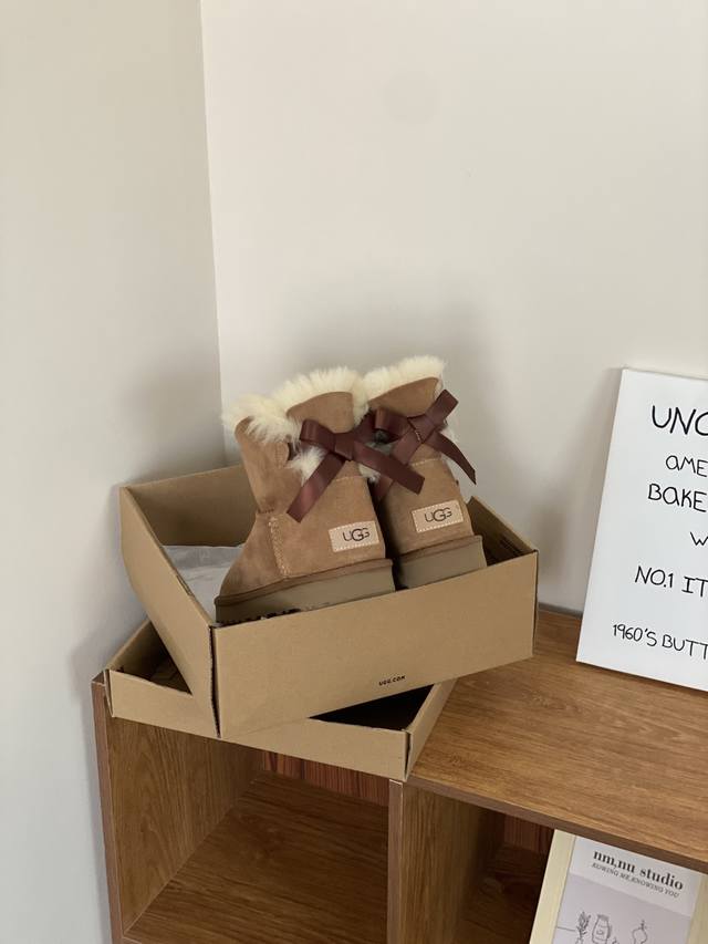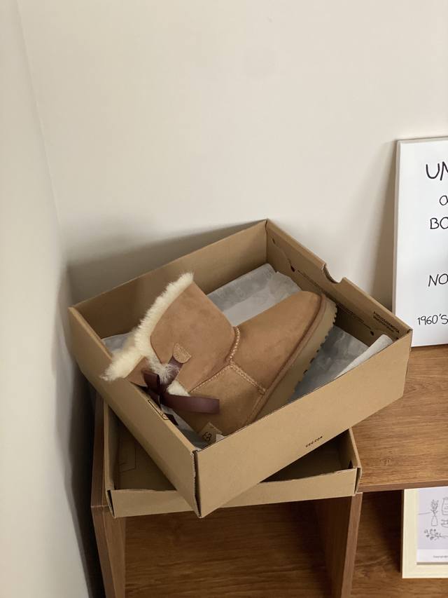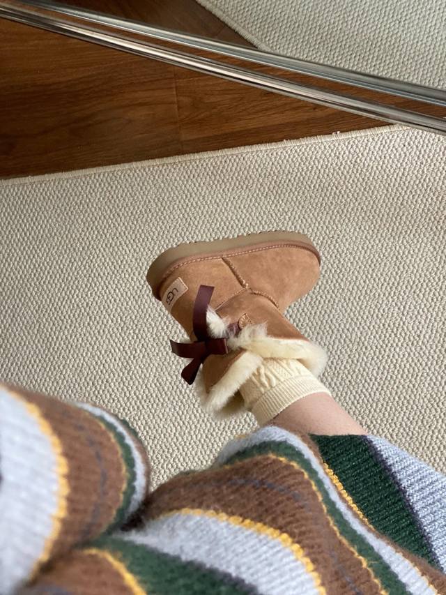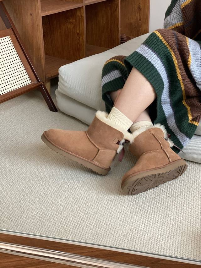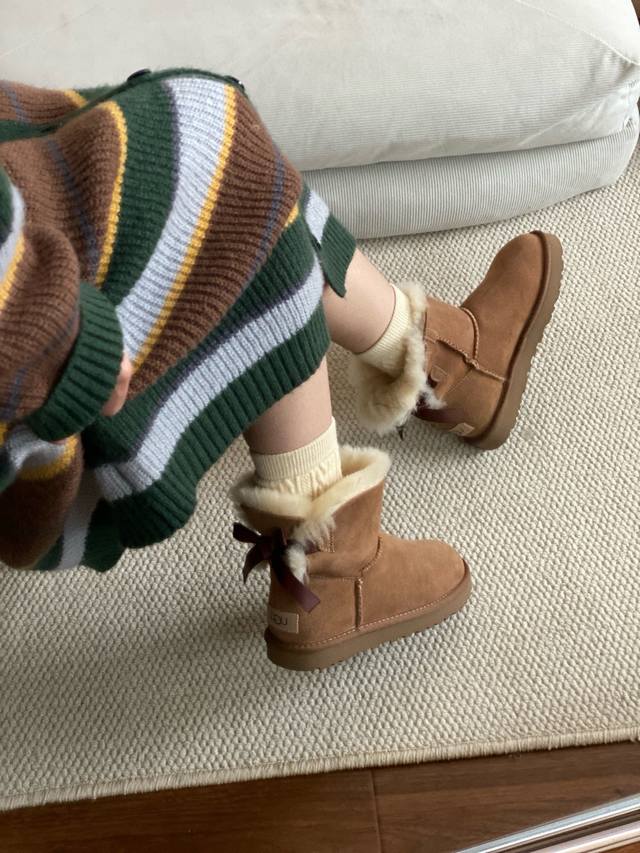 / 正码 Ugg|平底单丝带 皮毛一体 鞋面设计,采用隆丰羊皮毛一体,质感细腻。茸暖舒适,无惧严寒。 甜系蝴蝶结,沿鞋筒点缀固定的锻带蝴蝶结,时髦减龄。 鞋底材质,
