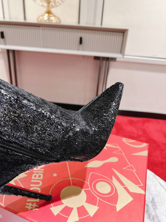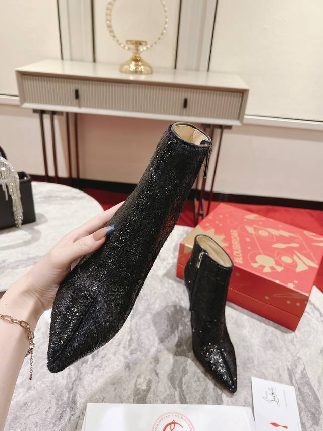 毛毛靴W. 定做不退不换 作为Maison Christian Louboutin最具标志性的设计之一,So Kate Booty是一款现代风格的踝靴,采用简洁的线条和100毫米的细高跟,内衬标志性的红色鞋底。这一季的新款式是丝绒Papillon,这是一款黑色绒面革,具有绚丽的闪光效果。讨人喜欢的脚踝高度鞋面使其成为别致造型的完美靴子。 Size:34码-42码 34.40.41.42定做不退不换。 跟高:10Cm.8.5Cm
