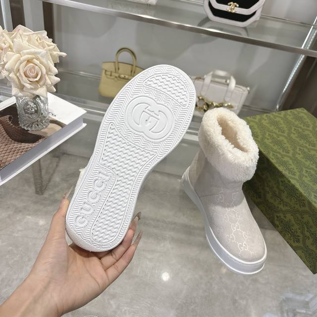/ 爆款 Gg新款女士美利奴羊毛内里靴 这款女士靴采用麂皮精制而成,兼具舒适感与经典传承。柔软的美利奴羊毛内衬带来温暖奢华的穿着体验,而标志性的Gg橡胶鞋底则以品牌