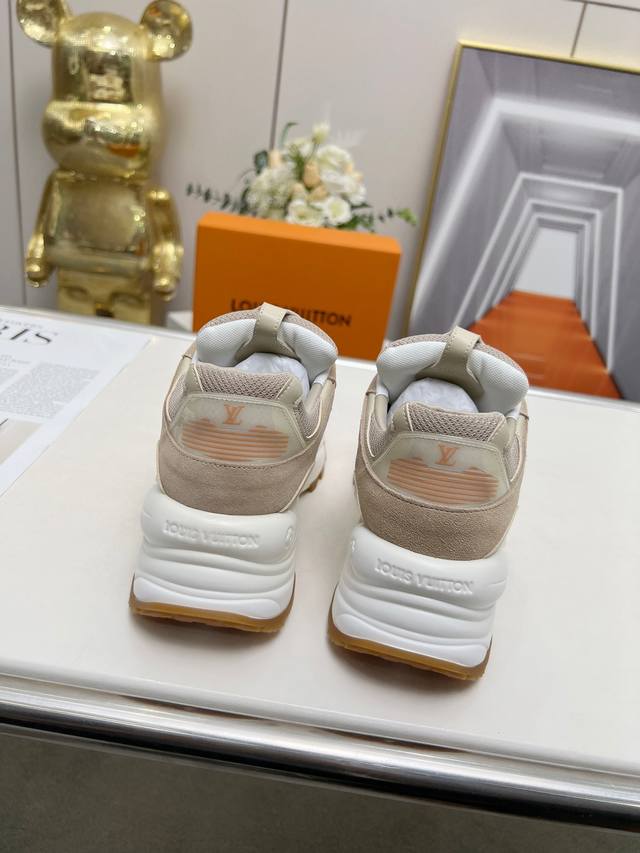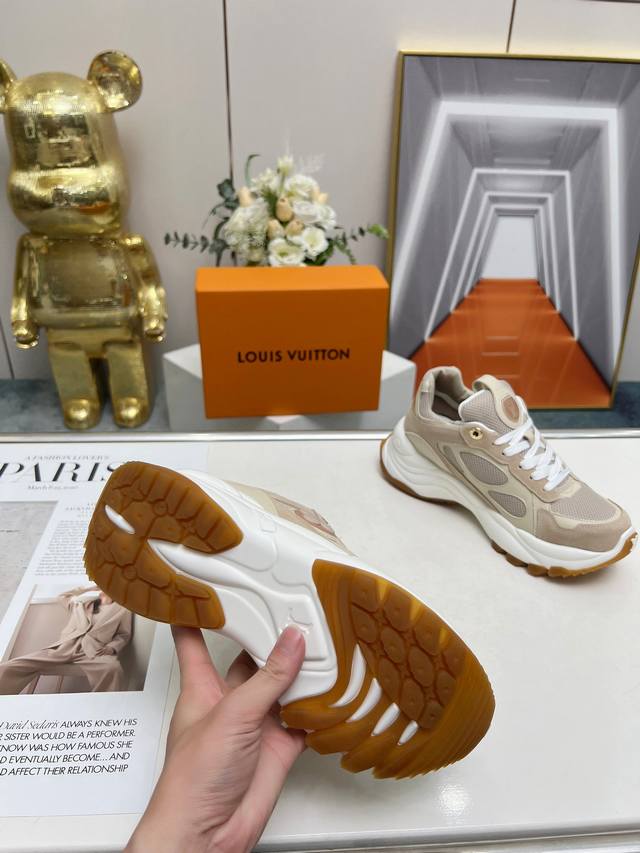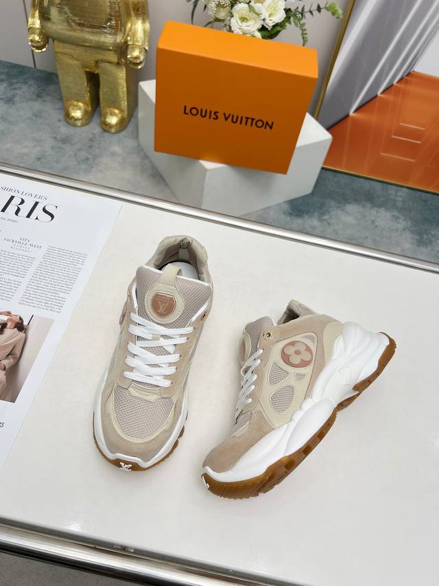 / 男女款,本款Run55 运动鞋融合皮革和科技面料,已加厚外底全是跑鞋灵动,为都市出行带来柔韧弹力和舒适体验,Monogram花卉点睛一侧。 官配颜色,粉色,白色