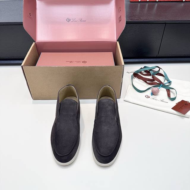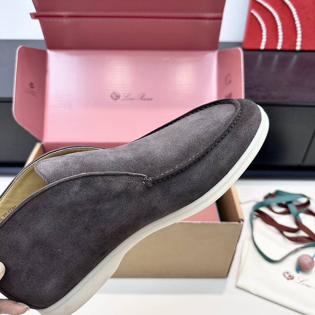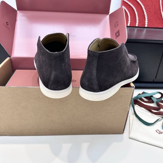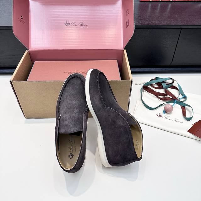 男 女 裸色 Lp 男女同款高邦单鞋 麂皮裹住秋意,一脚蹬的松弛是Loro piana的温柔注脚。鞋盒里的粉调衬里、缎带香薰球,连细节都裹着松弛的贵气 这双踝靴
