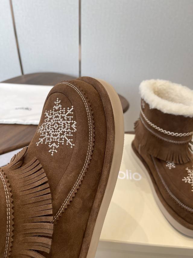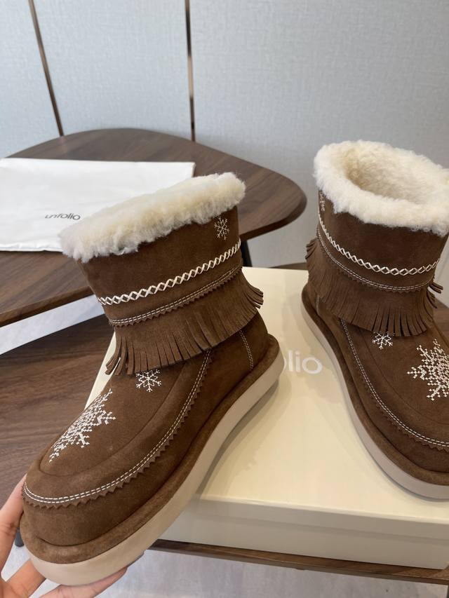 / 短靴 高靴 雪地靴 主推款 易搭配 Unfolio精品 高丝光牛反绒皮面 流苏设计 几万针刺绣雪花 图案 内里羊毛 小众设计师25发布会新款 面料选用 高丝光牛