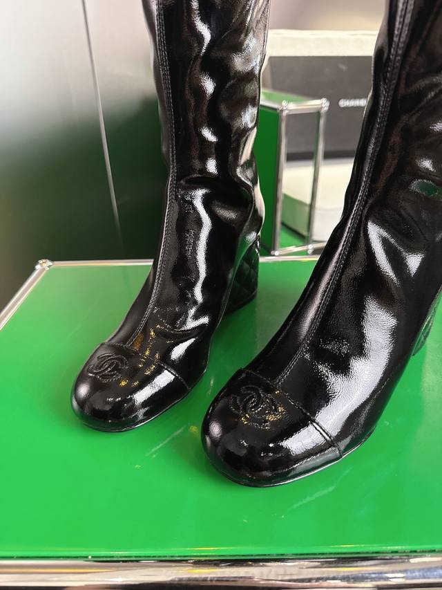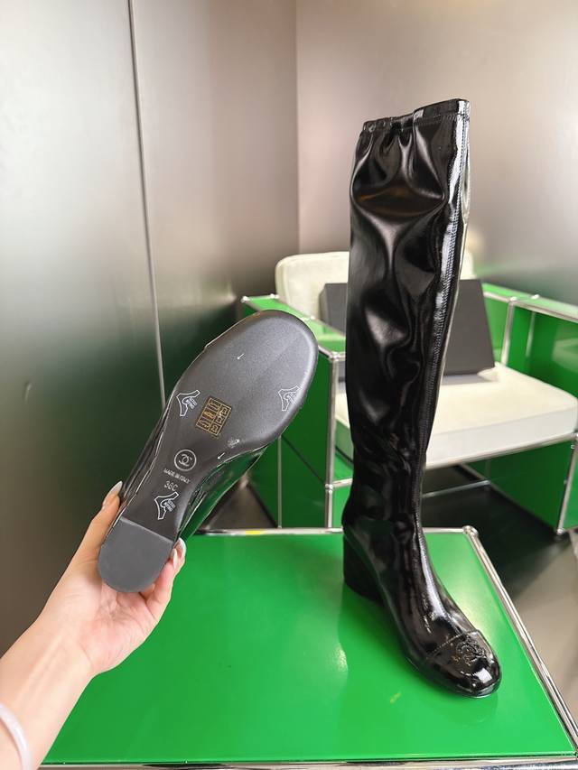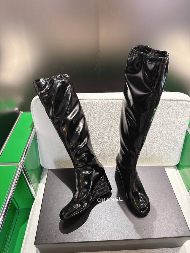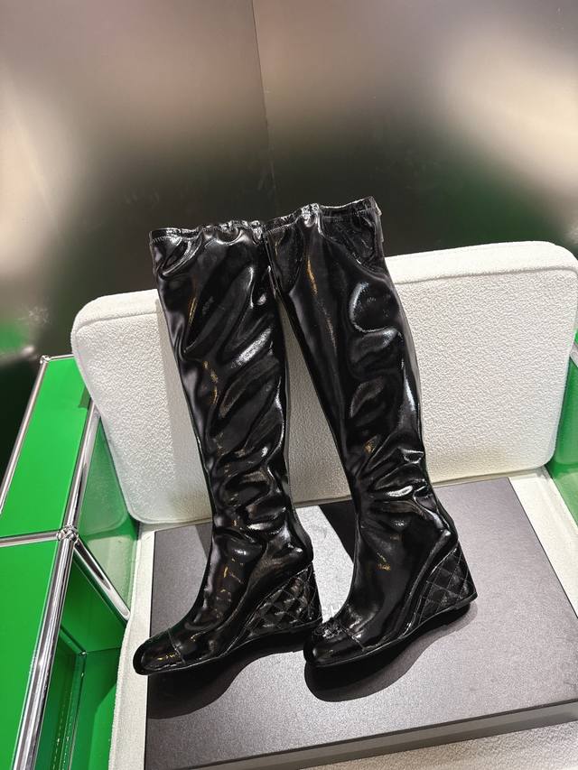 秋冬新品双C菱格 顶级品质 坡跟弹力松紧靴口高靴 弹力材质巧妙拼接 贴合腿部曲线 既保证活动自如 又增添几分随性灵动。 7Cm坡跟设计精妙 18寸高度恰到好处 面料采用原版漆皮材质 内里垫脚均为丝绸羊皮 意大利原版进口真皮大底 尺码34-42 [34.40.41.42定制]