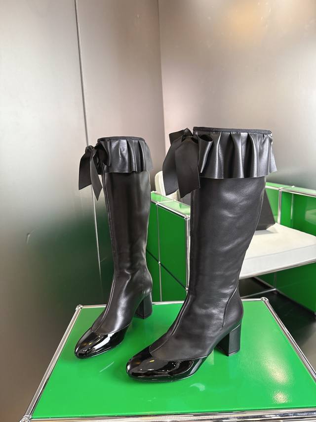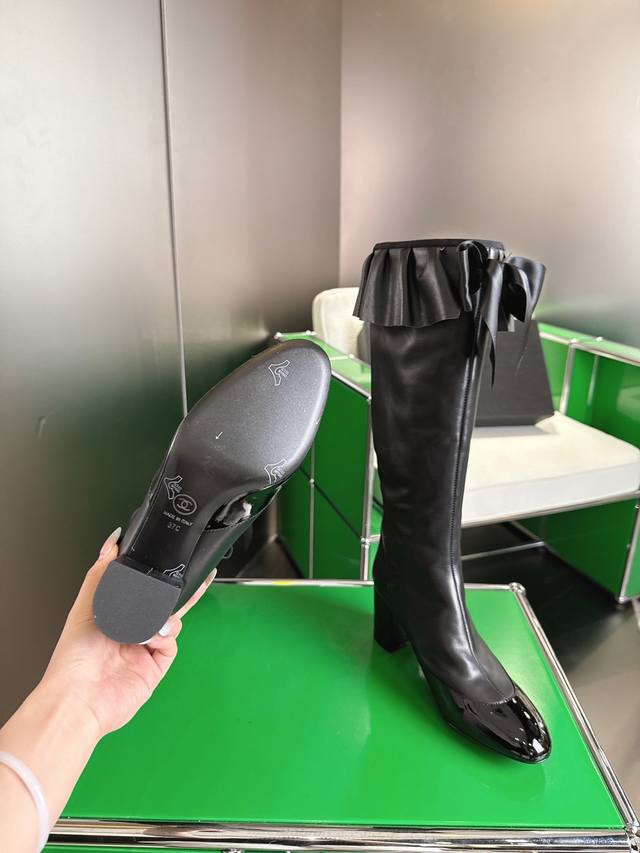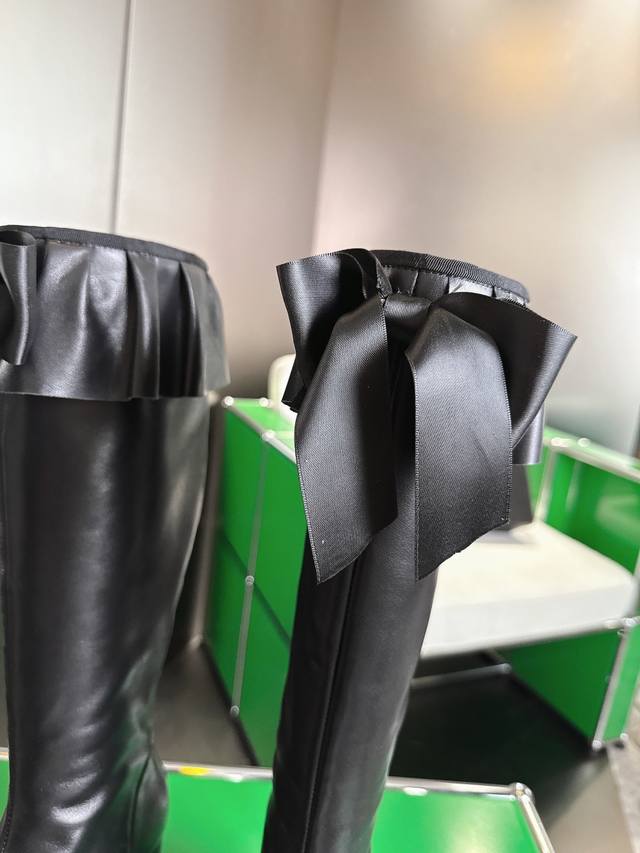 / 秋冬新品蝴蝶结高靴 顶级品质 6.5Cm粗跟设计 中筒靴长靴 褶皱靴口是这双靴子的神来之笔 层层叠叠的褶皱宛如海浪轻涌 充满立体感 不经意间就为整体造型增添了几