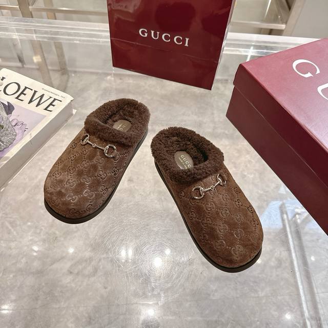 秋冬新款反绒牛皮马衔扣女士羊毛拖鞋 Gg在 2025 秋冬系列中继续使用档案符号。Horsebit 硬件让人想起品牌的马术传统,出现在这双 Camel 和牛皮高周波压 Gg 穆勒鞋上。 咖啡色牛皮反绒Gg压花 马衔扣装饰 金色五金配件 羊毛内里 圆头 橡胶鞋底 平底 意大利制造 码数:36~42码