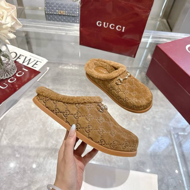 秋冬新款反绒牛皮马衔扣女士羊毛拖鞋 Gg在 2025 秋冬系列中继续使用档案符号。Horsebit 硬件让人想起品牌的马术传统,出现在这双 Camel 和牛皮高周波压 Gg 穆勒鞋上。 棕色牛皮反绒Gg压花 马衔扣装饰 金色五金配件 羊毛内里 圆头 橡胶鞋底 平底 意大利制造 码数:36~42码