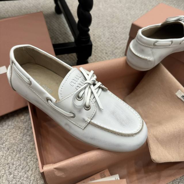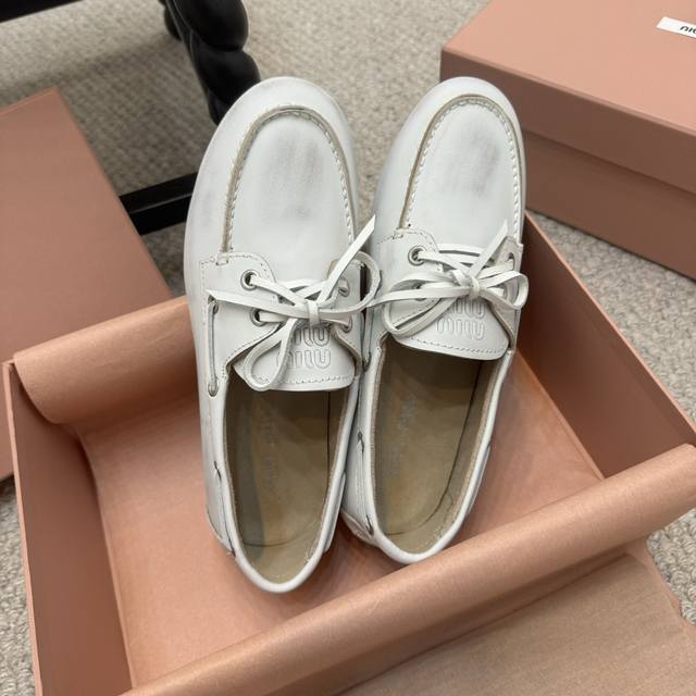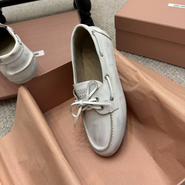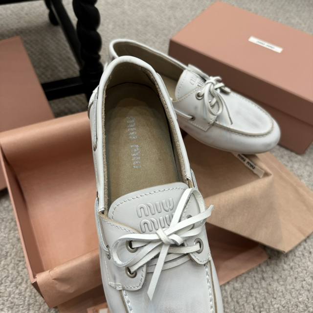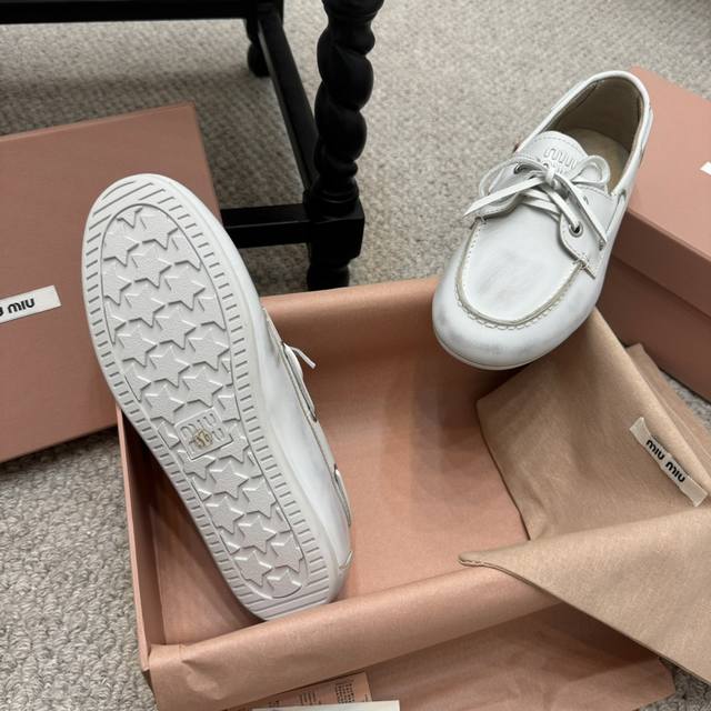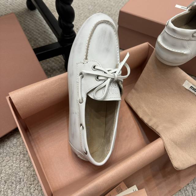 / 舒适款 Miu Miu25春夏系列帆船皮鞋 新一季系带帆船皮鞋,灵感来源于经典帆船鞋,将精致的牛皮注入松弛感的做旧细节处理。经典的卡其色以及白色配色,搭配有蝴蝶