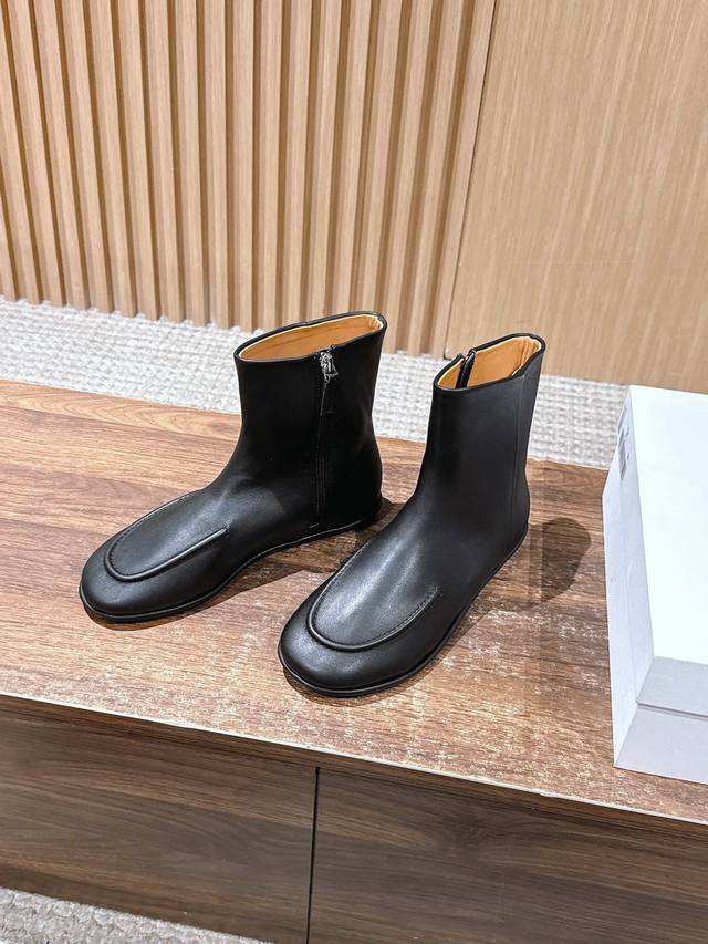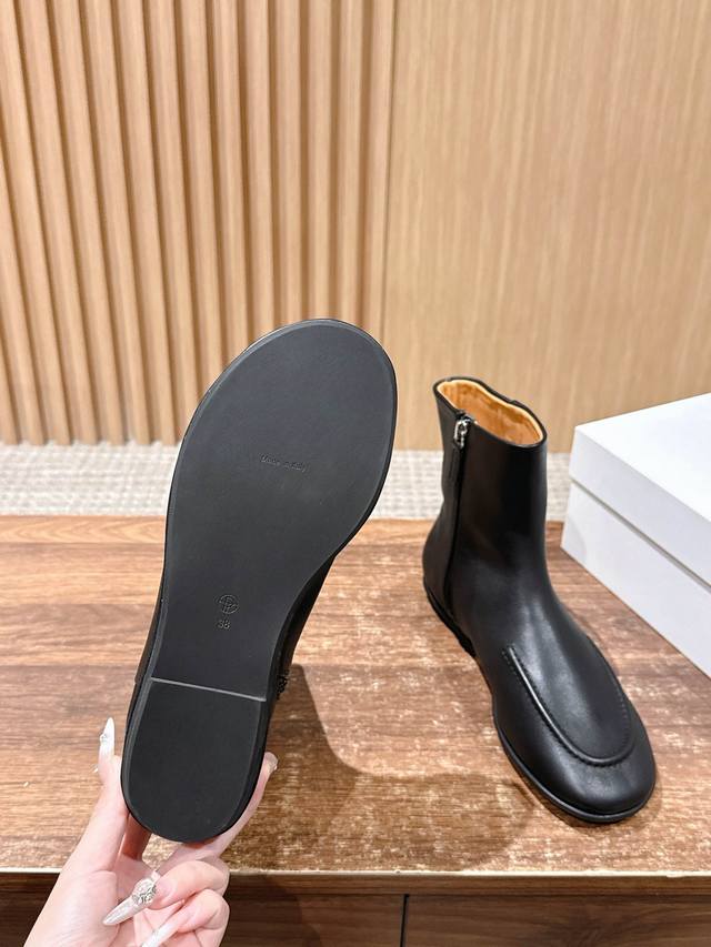 莞产 #中筒靴 极简高级平底靴 简单更新一下 The Row 单靴 这个款更像一个春秋款 整体自重很轻穿上柔软舒适亲肤 很适合日常走路比较多的朋友 依旧Row家一贯的极简高级风 憋憋的圆头加上立体的一圈包边设计 既有层次感又可以在视觉上有种显瘦的效果 极简干练帅气 侧拉链的设计让穿脱更方便 内里一整个羊皮透气又舒适 这个季节穿刚刚好 跟高2Cm 进口羊皮 内里水染羊皮 橡胶大底 尺码:35 36 37 38 39 40 40不退换