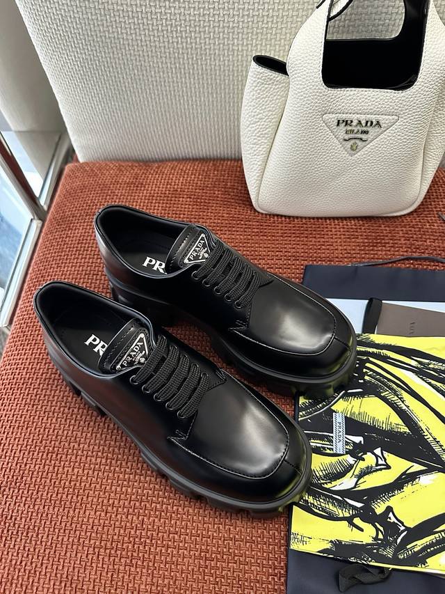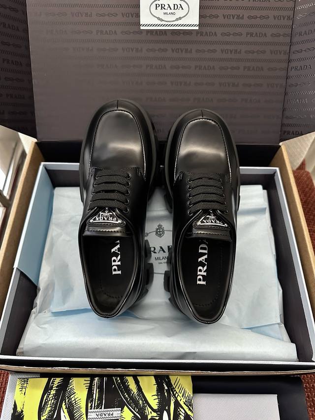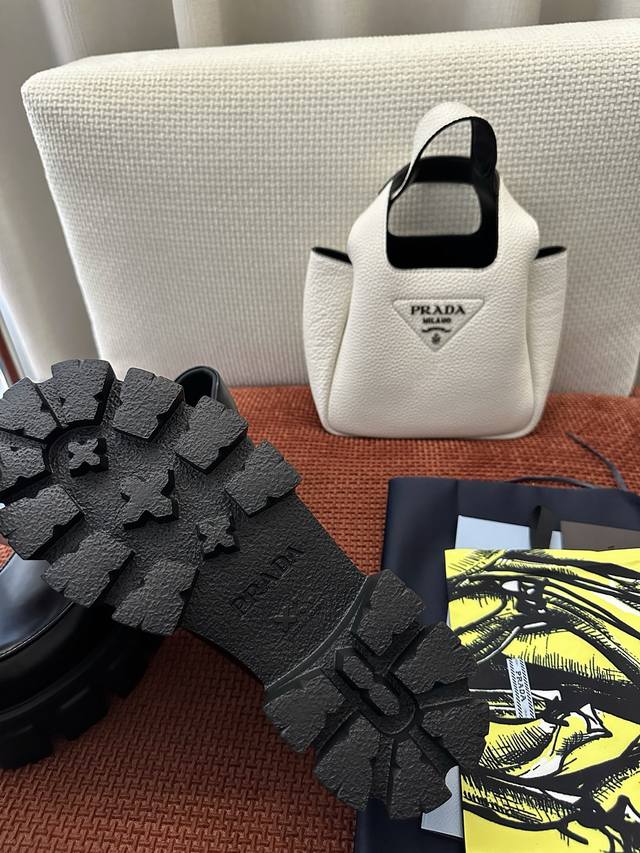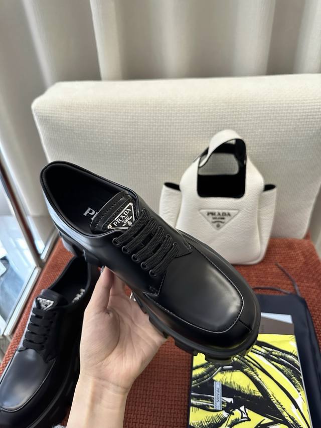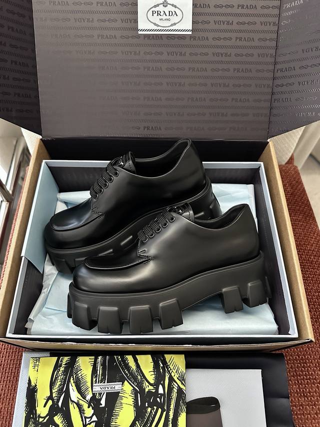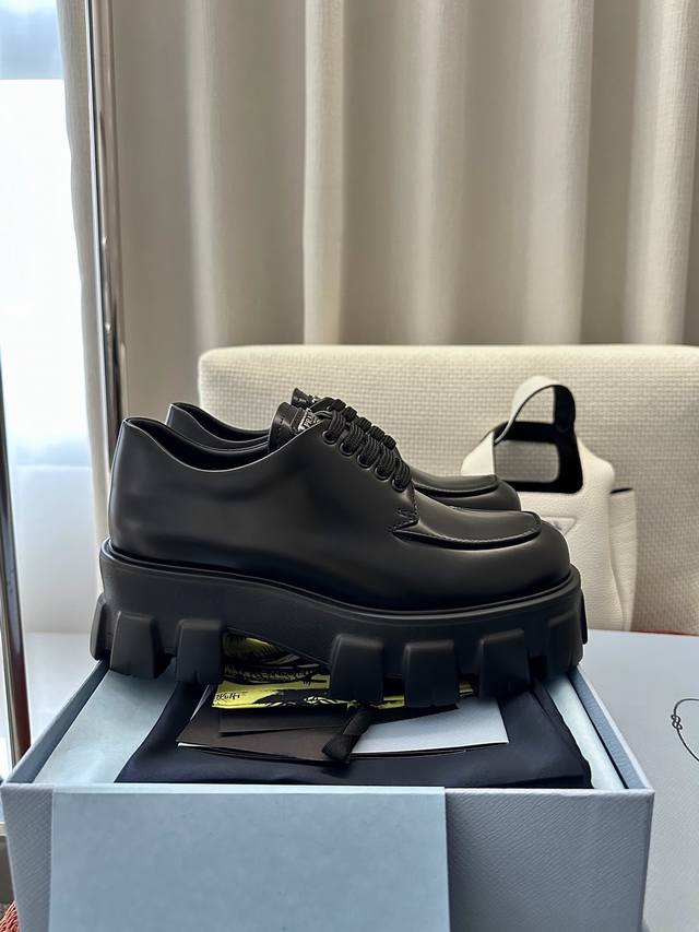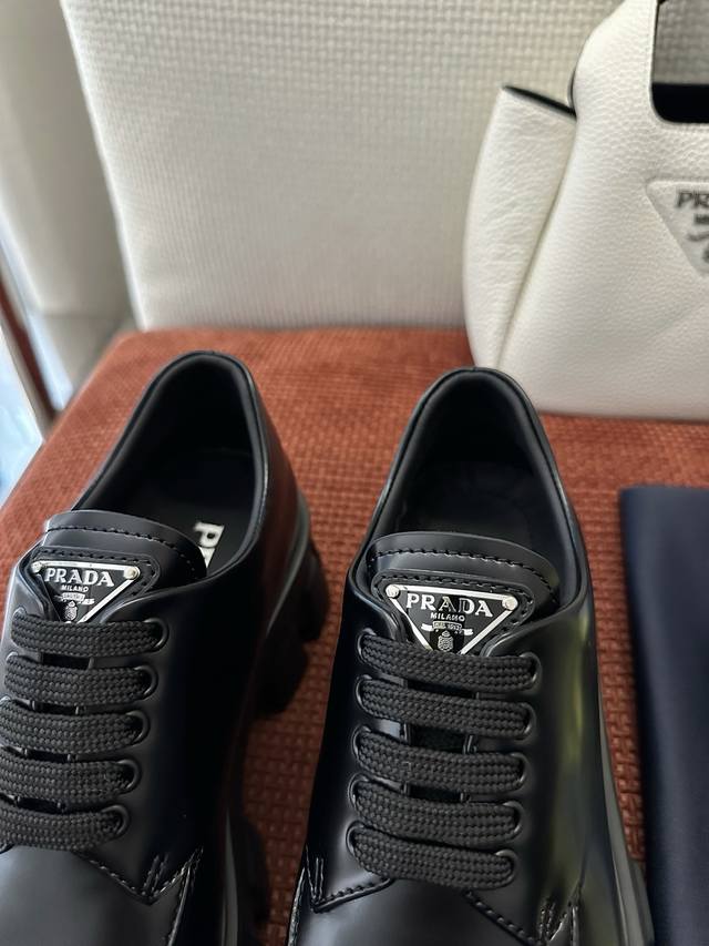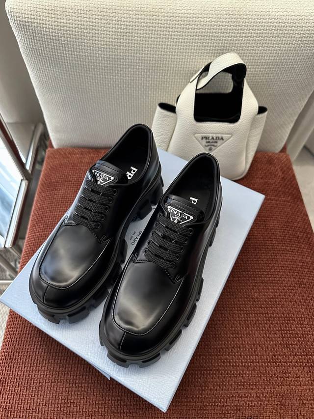 莞产 DDD * 新款Monolith系列齿轮系带三角标厚底鞋 |原版购入代购级别 DDD -开边珠 DDD 材质与工艺: DDD 原版牛皮革 漆皮面料 DDD 定制牛皮里衬 DDD 涂珐琅金属三角徽标 DDD 5.5Cm凹凸纹橡胶大底 DDD Size:35-40 DDD