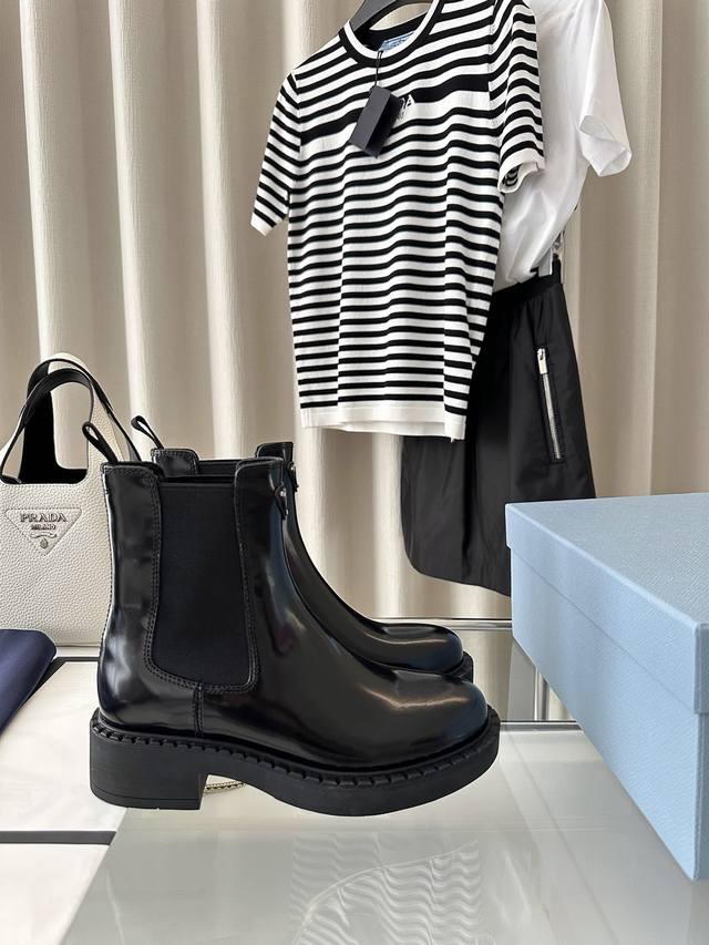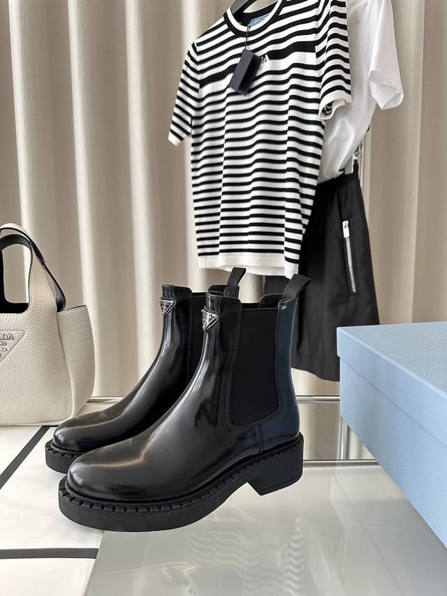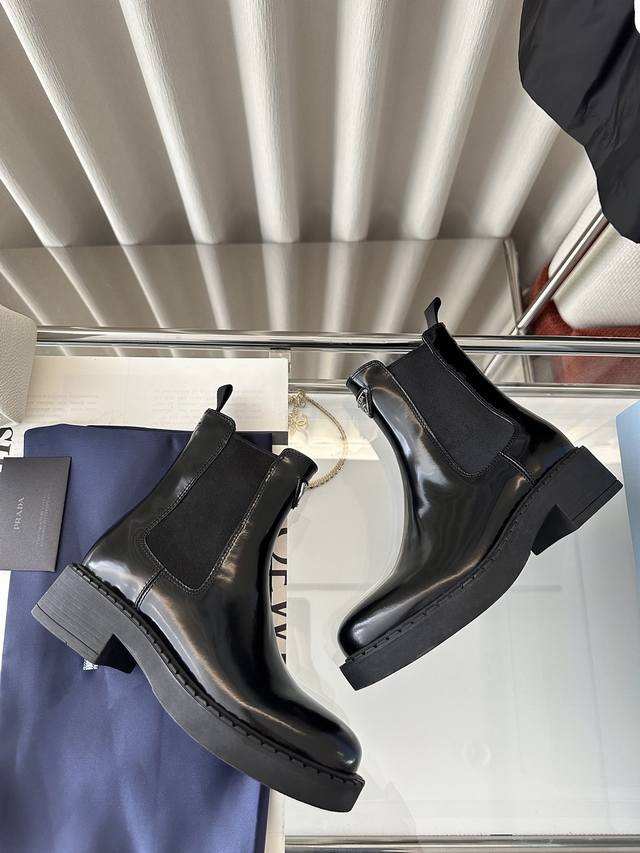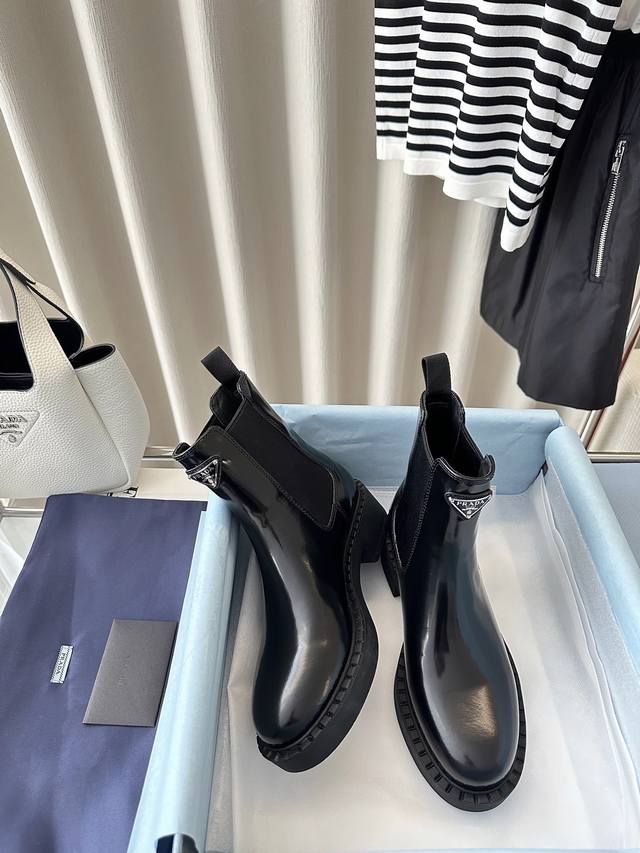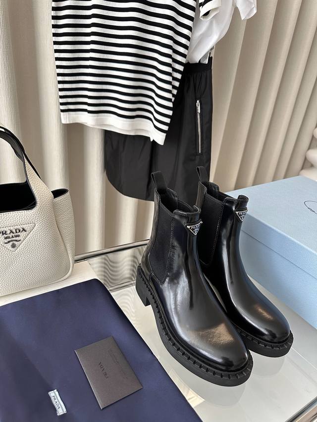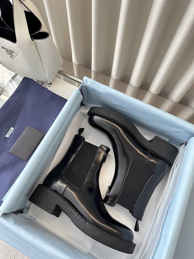 莞产 * 秋冬新品三角徽标松紧带短靴|原版购入代购级别 材质与工艺: 原版牛皮革面料 皮革里衬 鞋面配弹力侧围和拉袢 涂珐琅金属三角形徽标 锯齿状橡胶沿条 4.