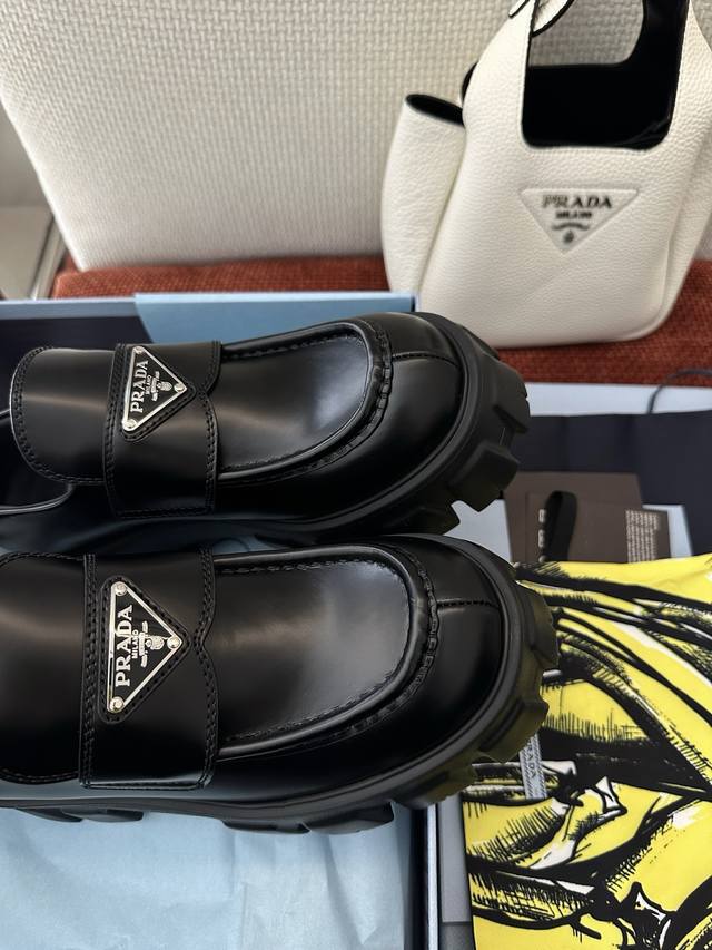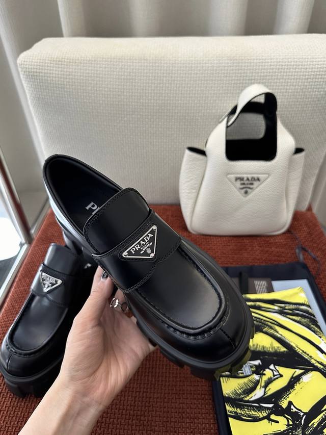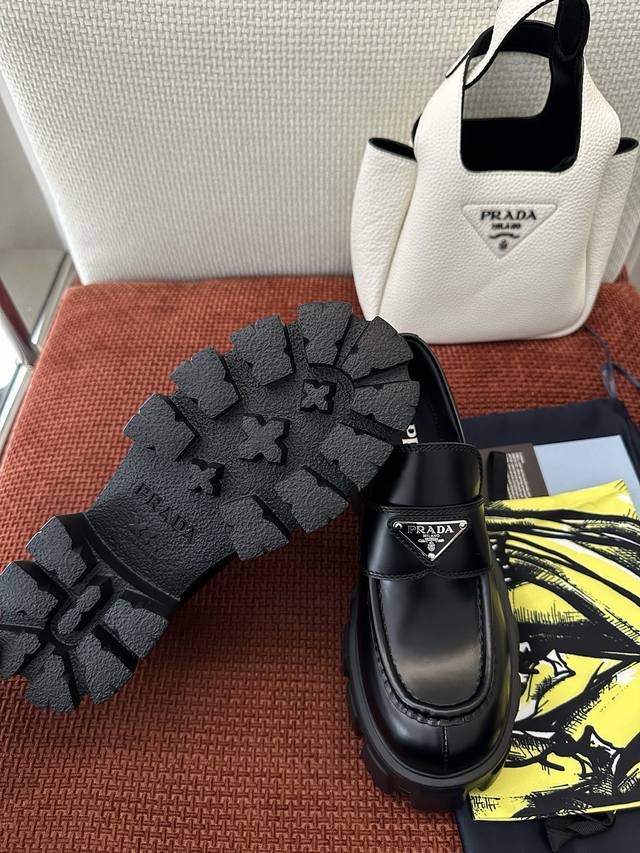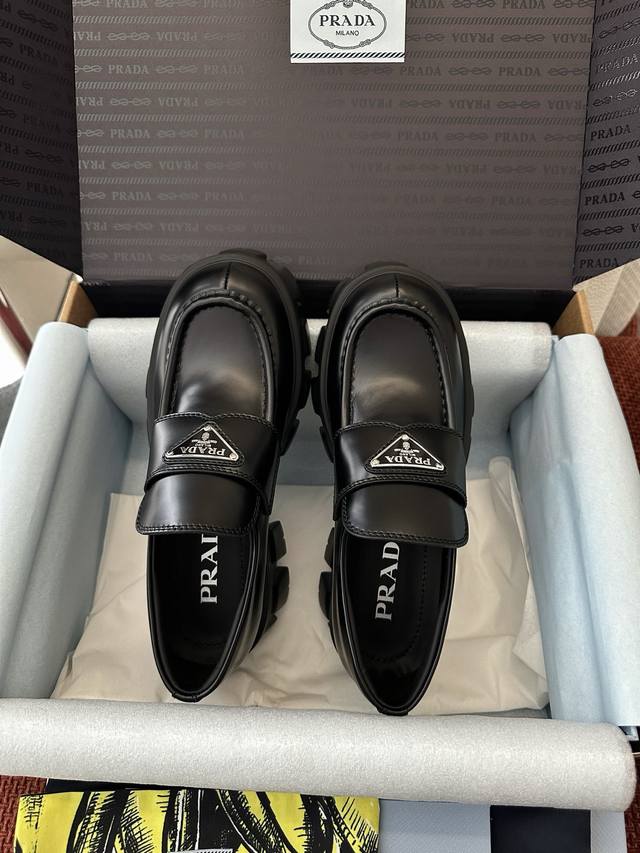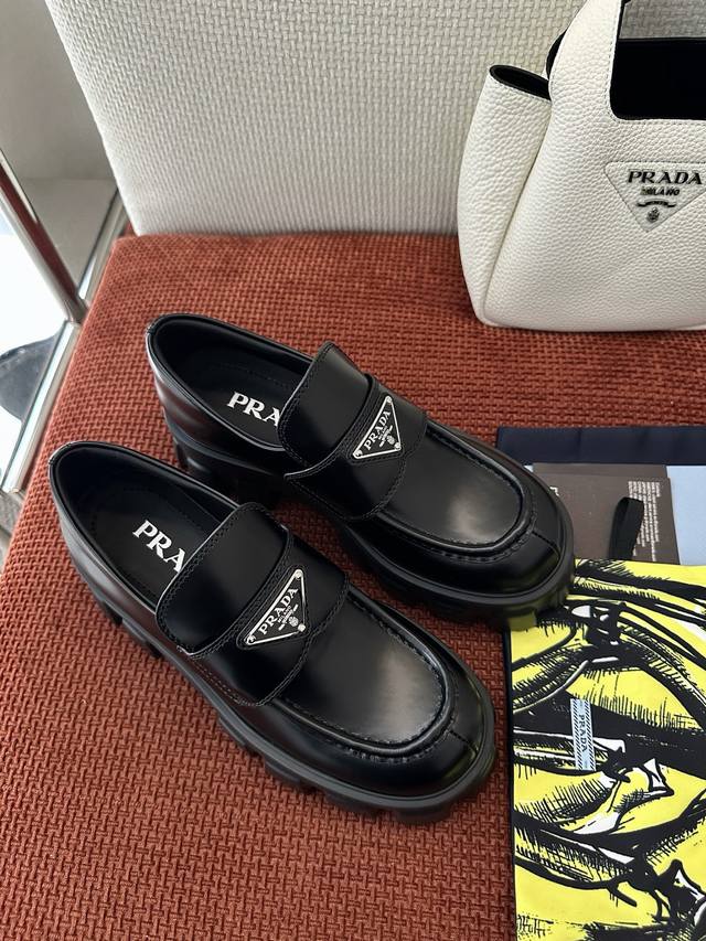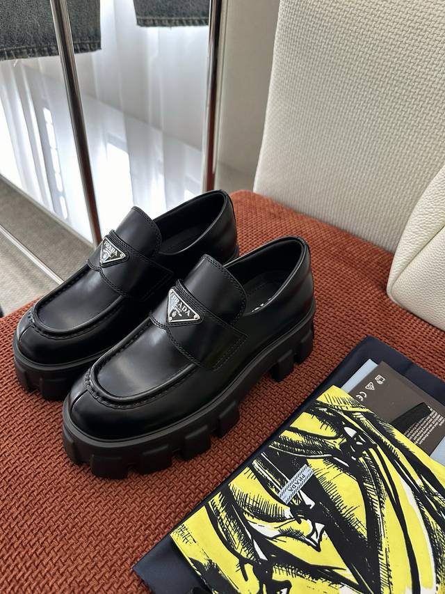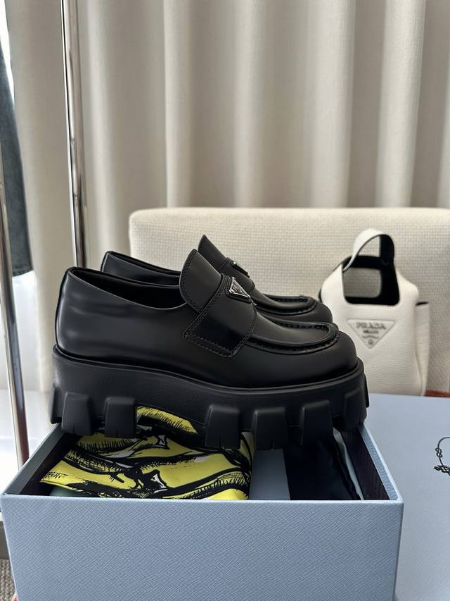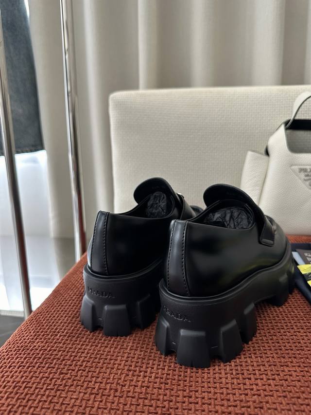 莞产 *经典Monolith系列齿轮厚底三角标乐福鞋 |原版购入代购级别 -开边珠 材质与工艺: 原版牛皮革面料 皮革饰带和金属三角形徽标 鞋头盖配凸起式缝线饰