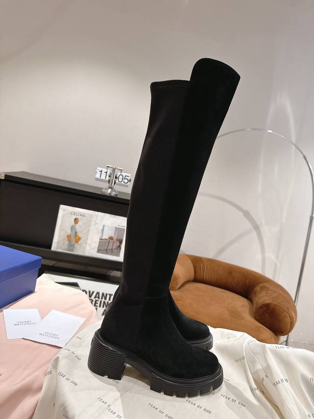 莞产 Stuart Weitzman Soho及膝靴加入抢眼的Soho沟纹鞋底 为经典及膝靴增添一抹现代的都市风范。60毫米的沟纹鞋底符合当下的时尚潮流,同时又保持轻便与耐穿结构,兼具时尚风格与舒适感。侧面拉链 设计,方便穿脱。这款随性前卫的及膝靴是您打造冬季造型的潮流时尚单品!跟高7.5 面料:牛皮面羊皮里 Size:35 36 37 38 39