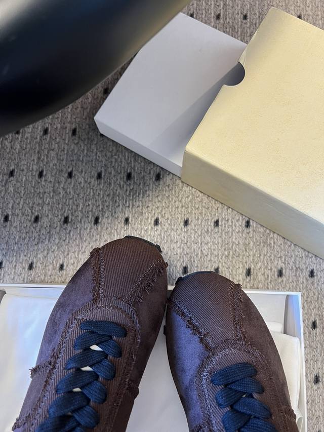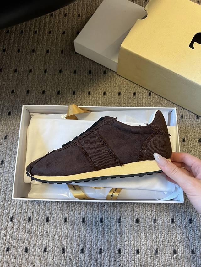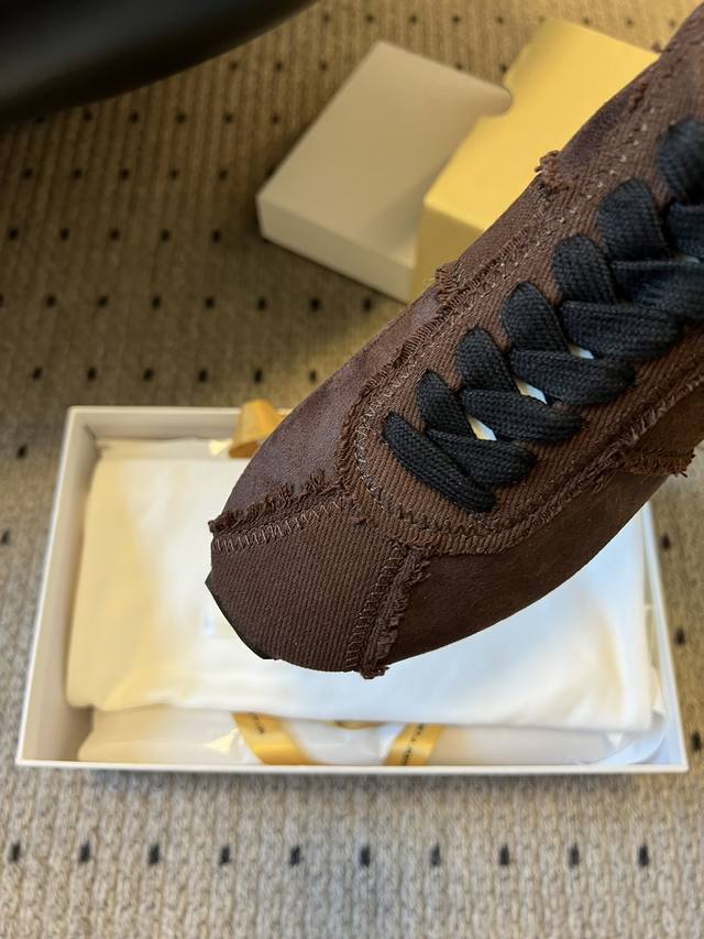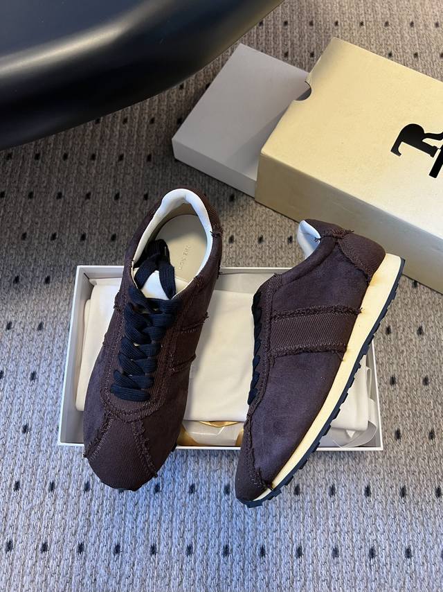 莞产 The Ro* 小众复古布面运动阿甘鞋 鞋面用拼接材质:黑色款是哑光尼龙 帆布,棕色款是绒面革+帆布拼接,表面带有做旧缝线 毛边细节,营造“轻复古”的松弛