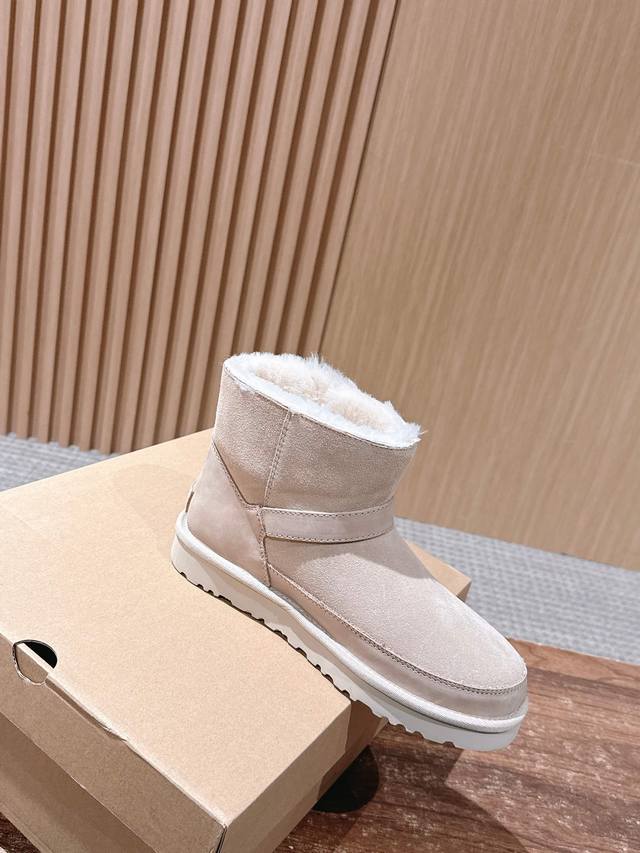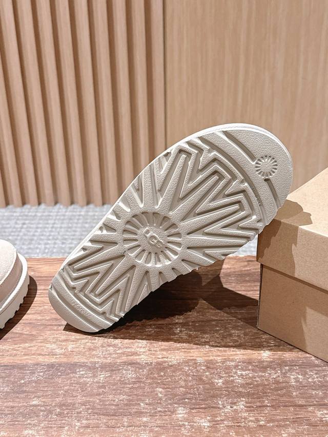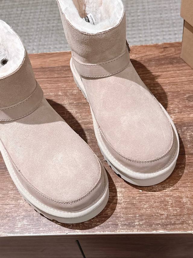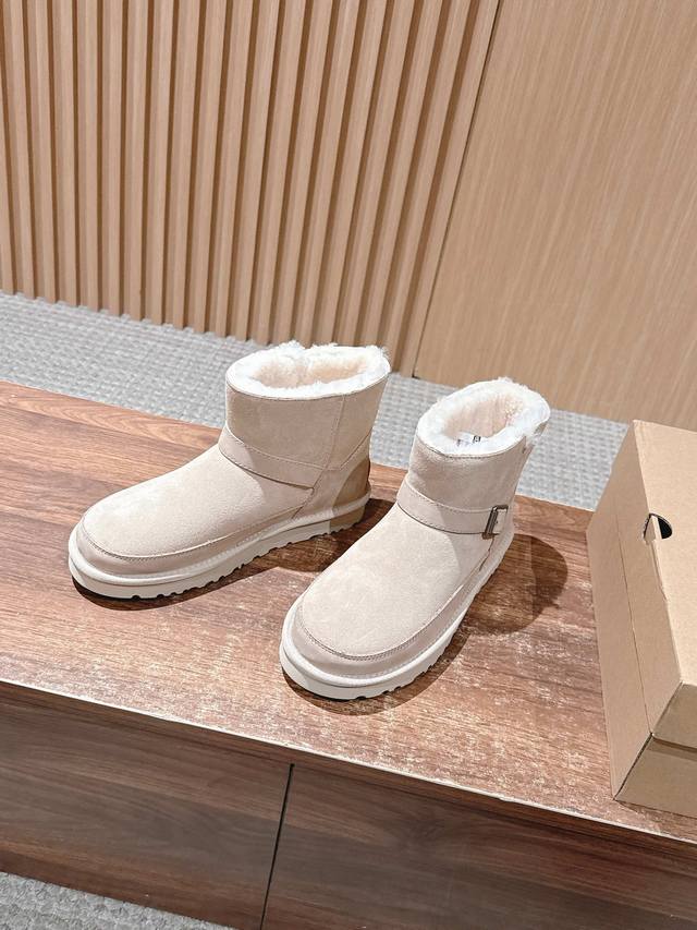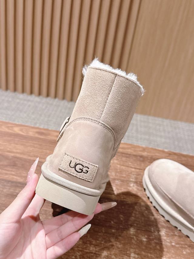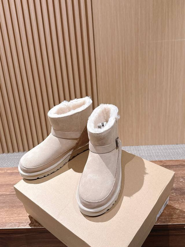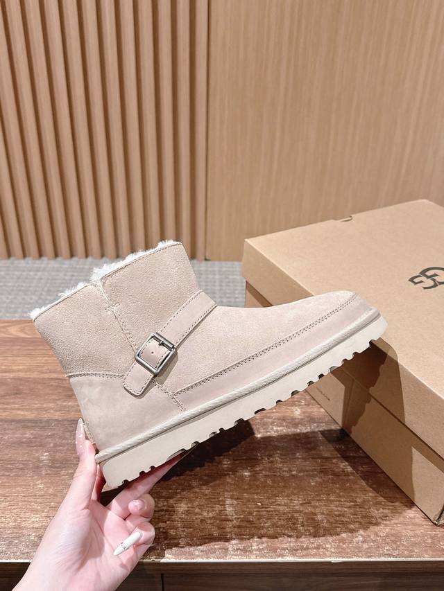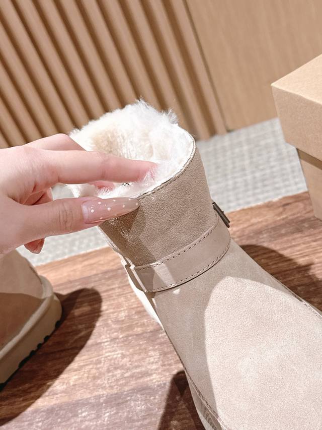 莞产 Ugg 油叽叽蓓琳娜搭扣短筒靴系列重磅来袭 DDD 从材质到版型全是顶配,秋冬氛围感直接拉满,一眼沦陷的奢级质感,藏在细节里 鞋面顶级羊皮毛一体拼接礳沙牛皮挡泥板,雨天踩水、日常蹭脏都不怕,锁边缝线像精致刺绣般工整,每一针都是大牌工艺缩影。 DDD 可盐可甜双穿法,靴筒轻轻一翻,瞬间切换利落短靴与毛绒边饰款,搭配可调节金属搭扣,瘦脚宽脚都能贴肤适配,比普通雪地靴多了三分时髦小心机 DDD 暴走无压力的实用主义 Eva 发泡大底藏着隐形黑科技!高密度回弹材质比普通鞋底轻 逛街半天脚不酸,防滑纹路让雨天