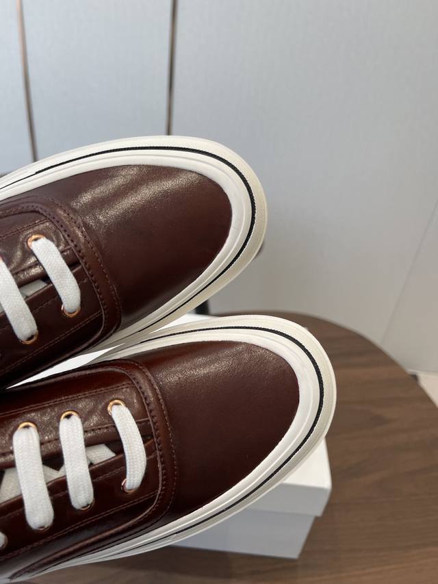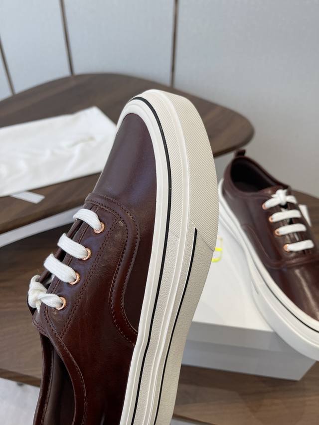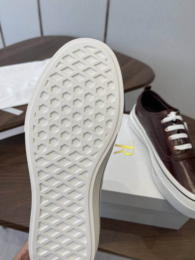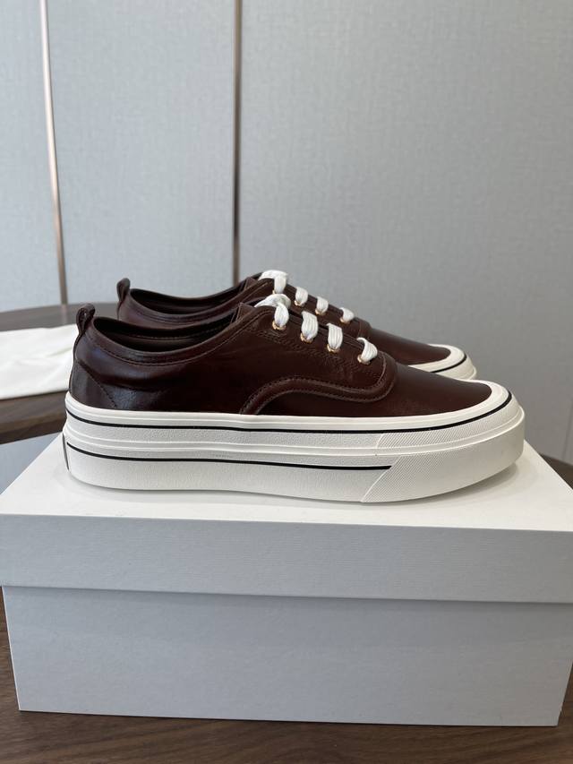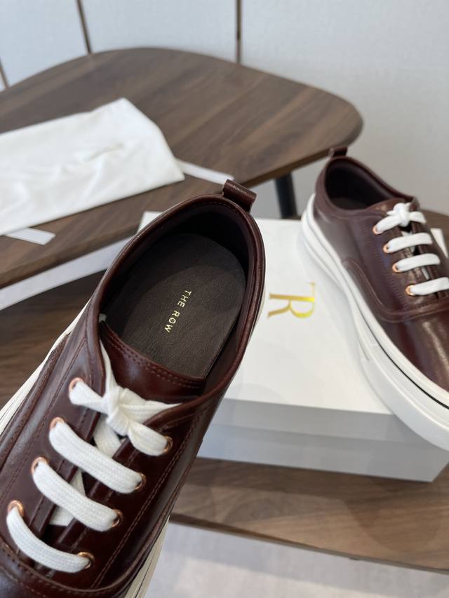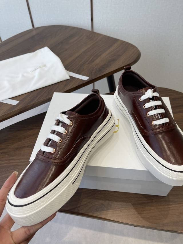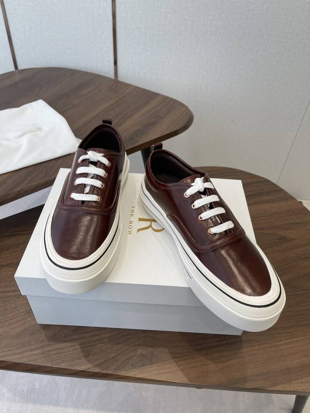 FFF 莞产The Row26Ss厚底低帮系带板鞋休闲鞋 DDD 融合经典板鞋与穆勒拖的设计,黑色款为系带低帮板鞋,红色款为无后跟穆勒板鞋;整体走极简轻奢风,线条利落,兼具休闲感与高级感。 DDD 鞋身是简约的低帮版型,搭配白色扁平鞋带,鞋舌与后跟处无多余装饰,贯彻品牌极简理念;鞋底为厚底橡胶材质,提升脚感的同时增加了造型的层次感,鞋盒印有品牌标识,细节处彰显品牌调性。 DDD 鞋面:进口皱漆牛皮 DDD 内里:羊皮 DDD 大底:原版开模大底 DDD 增高:4Cm DDD Size:35-40码 40码