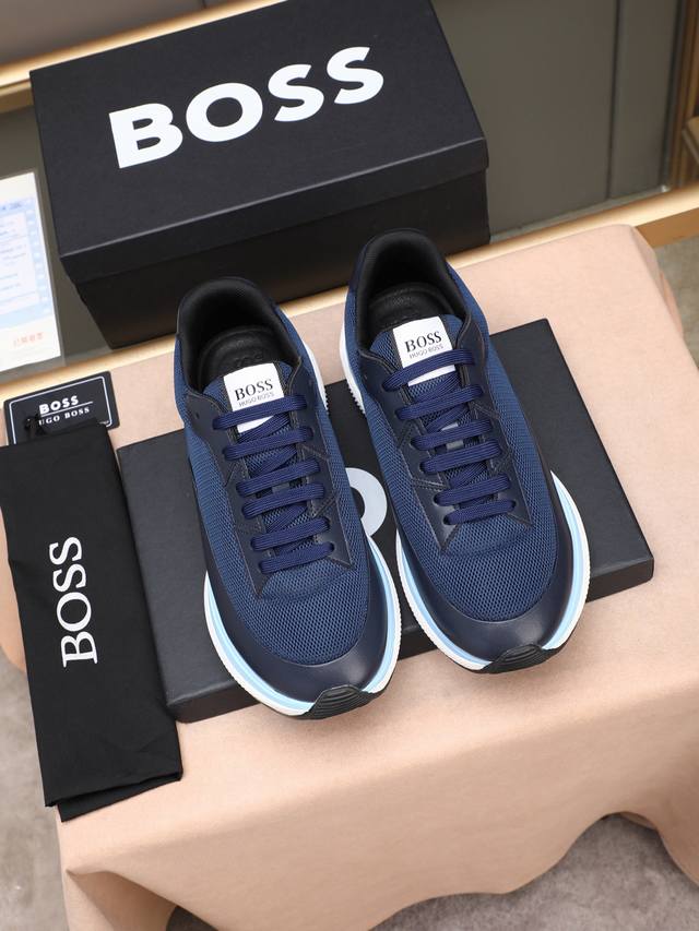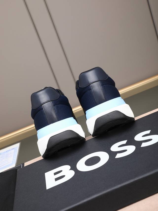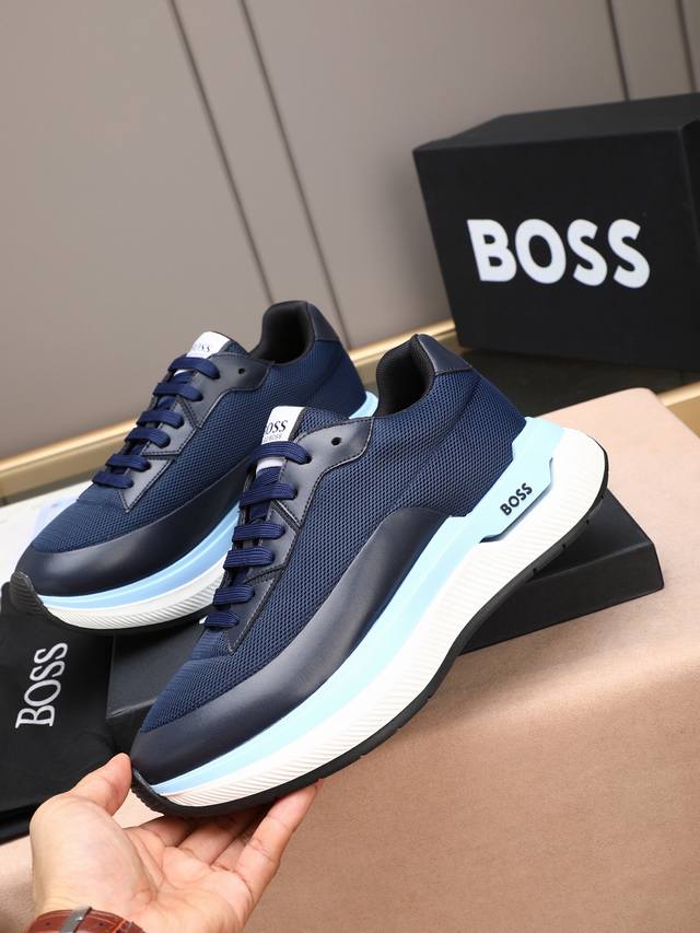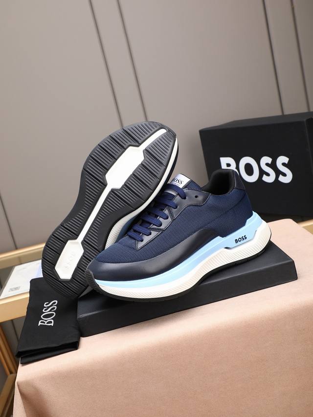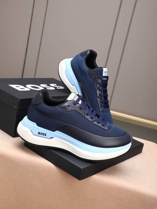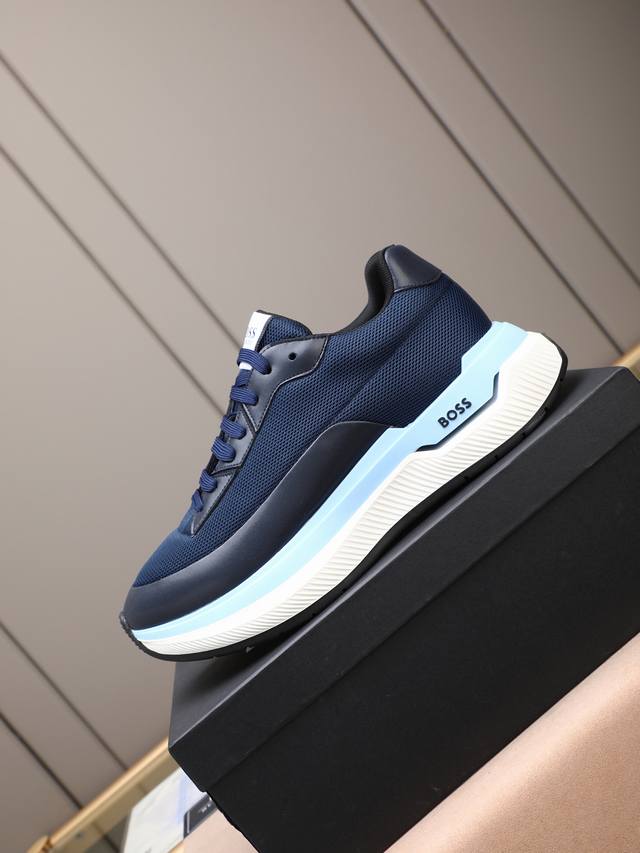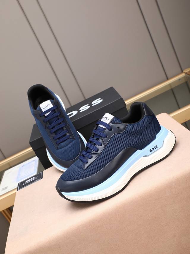 跑量 Boss动感男款厚底运动鞋,优雅低调而又蕴藏轻盈活力。精选牛皮拼接!饰有品牌标识,前卫厚鞋底设计。层次感和科技感十足,让人眼前一亮的时尚单品。 Size: