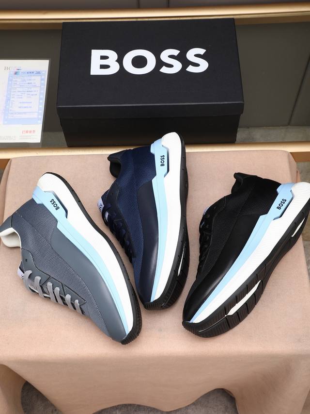 / 跑量 Boss动感男款厚底运动鞋,优雅低调而又蕴藏轻盈活力。精选牛皮拼接!饰有品牌标识,前卫厚鞋底设计。层次感和科技感十足,让人眼前一亮的时尚单品。 Size: