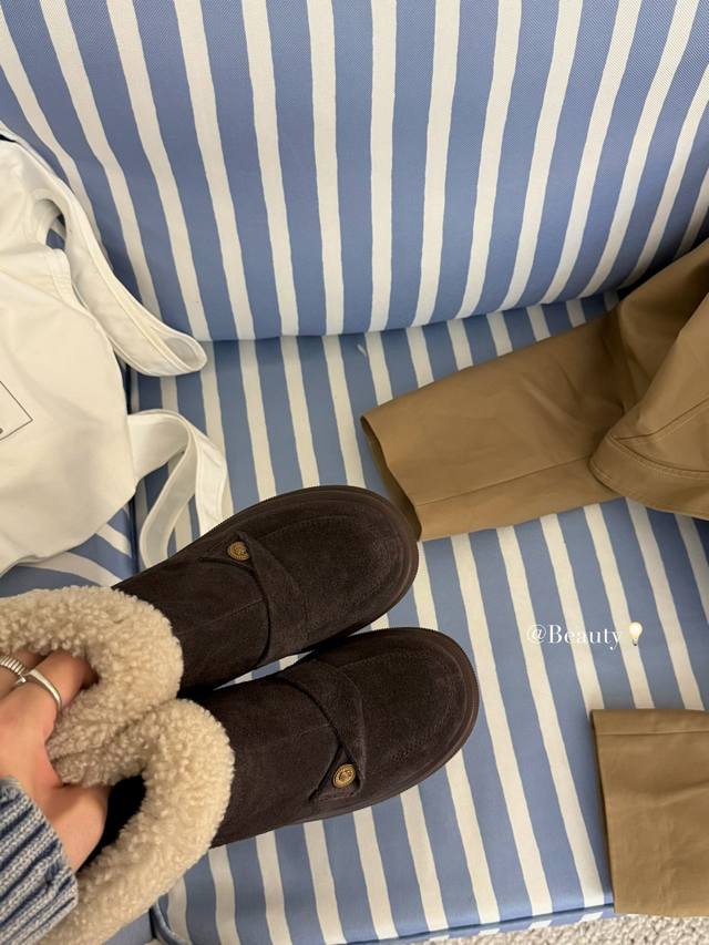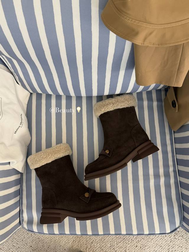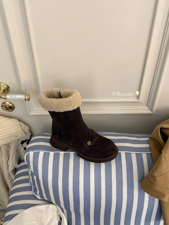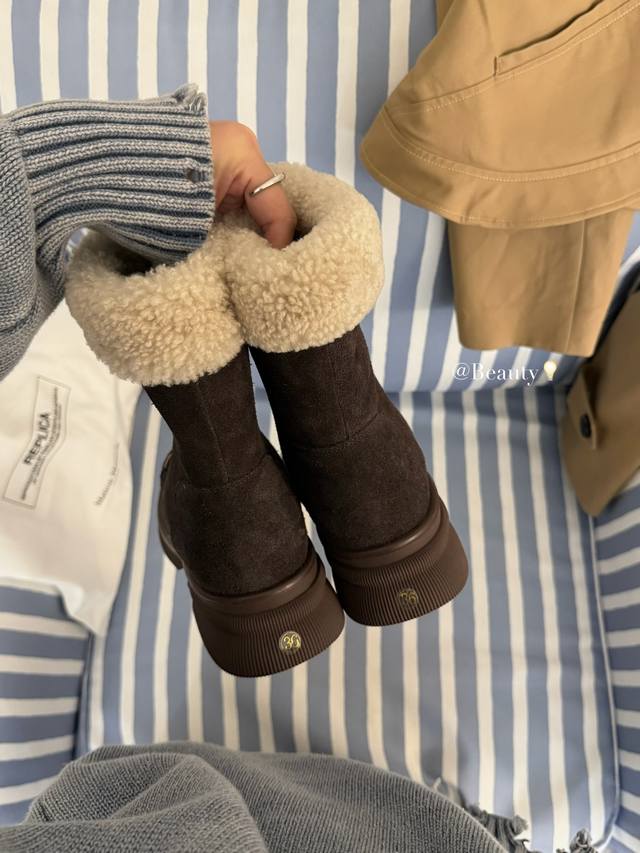 / 金币卷毛靴 “秋冬氛围感被这双靴拿捏住了~ 牛绒的质感+羊羔毛领口,暖呼呼又显质感,配纱裙或牛仔裤都很绝 踩在复古地毯上,像是把秋日的温柔都穿在了脚上 尺码:3