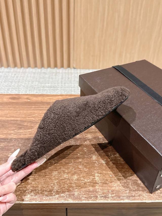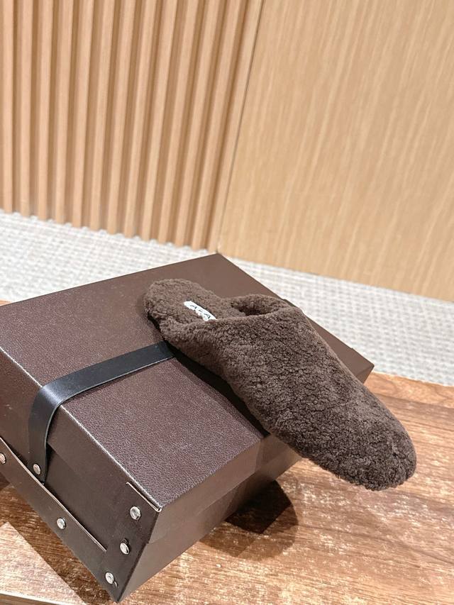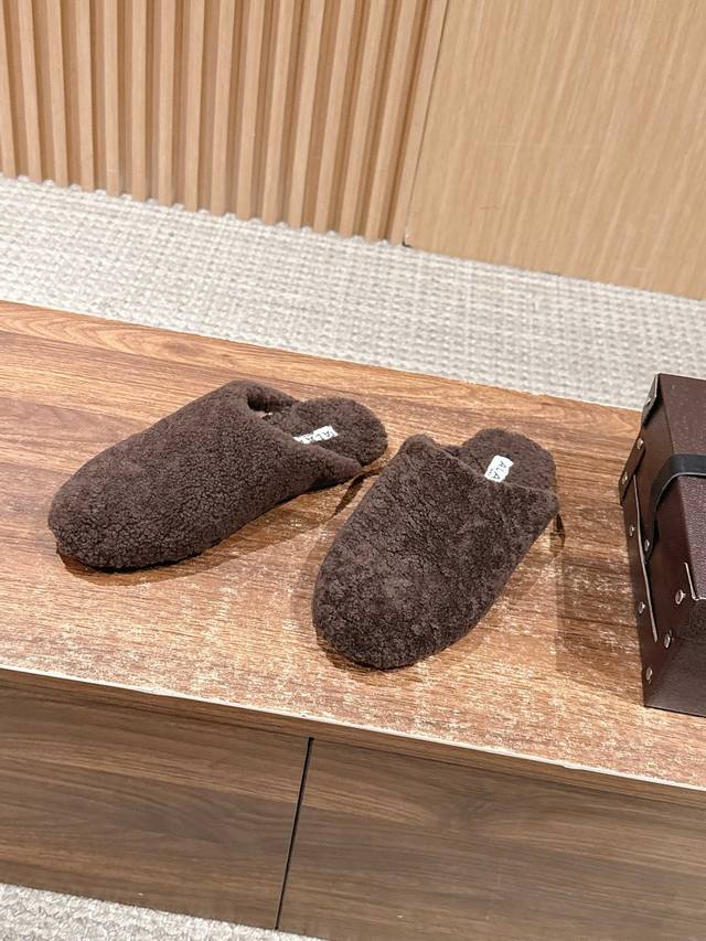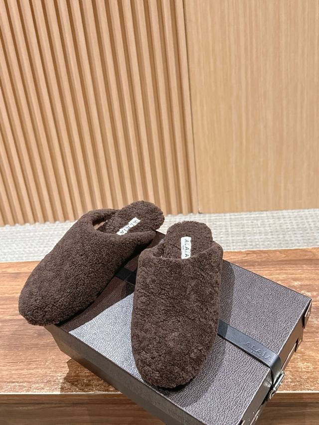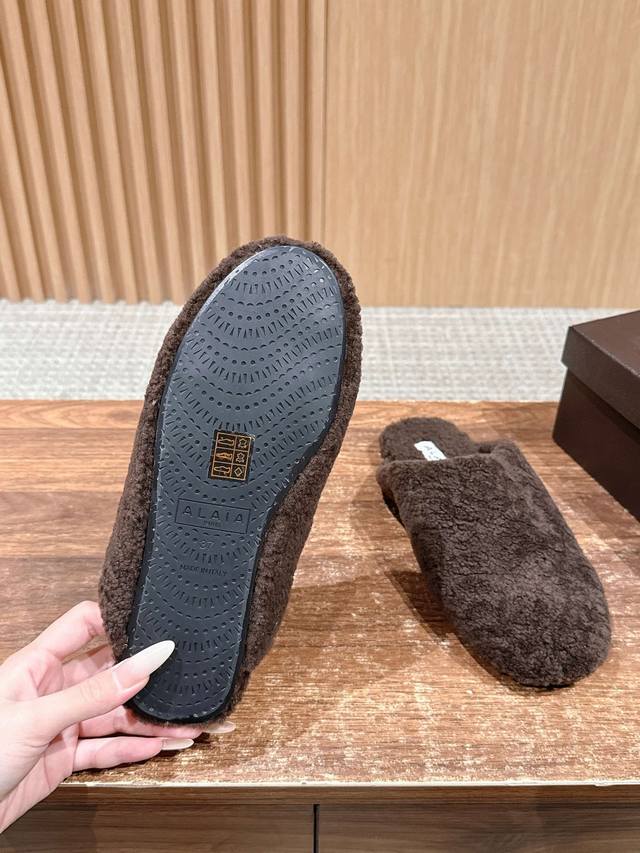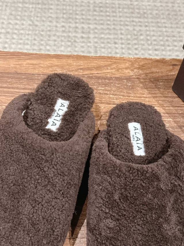 阿莱亚秋冬新款毛毛穆勒鞋毛绒拖鞋 DDD 采用进口羊羔毛,触感蓬松柔软,保暖性强,同时内里多搭配细腻皮革,兼顾舒适与高级感。鞋型是圆头穆勒拖,无多余装饰,仅靠品牌标签点缀,适配多种风格,颜色以低饱和色系为主,质感低调显贵。 DDD 品牌标志性的小标签标识,搭配简洁鞋型,延续了Alaa一贯的“极简奢华”调性;鞋型对脚型包容度高,贴合舒适。既可以当居家拖鞋,也能作为轻出门的“懒人鞋”,兼顾保暖与时尚感,是秋冬季节的舒适型单品。 DDD 鞋面:羊毛 DDD 内里:羊毛 DDD 大底:原版开模大底 DDD 增高:
