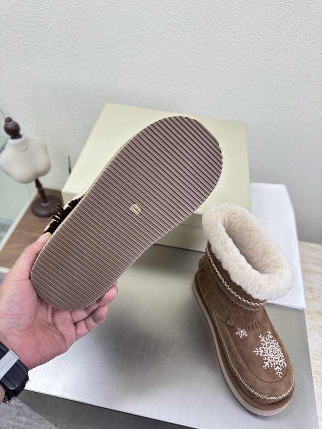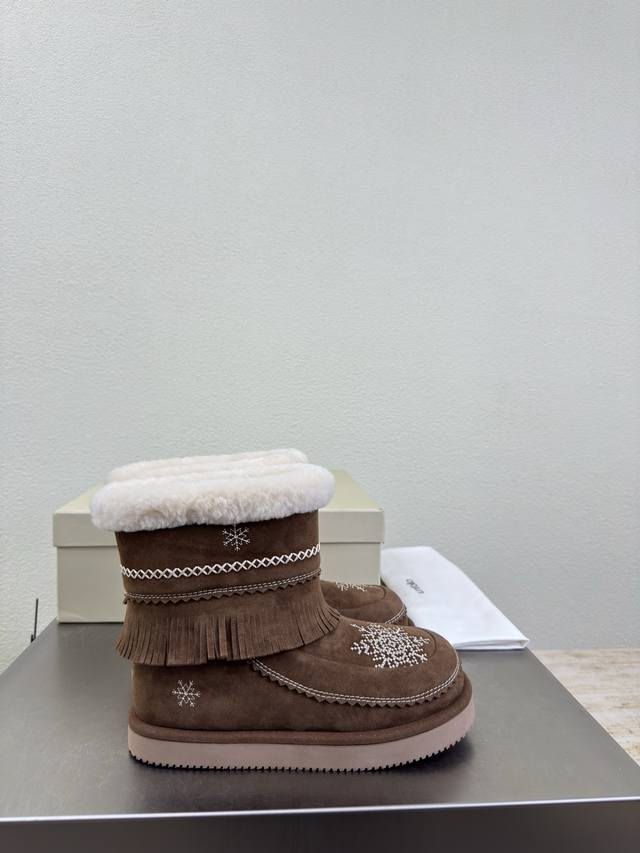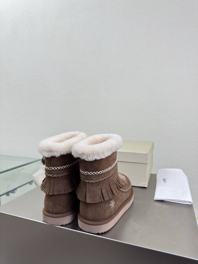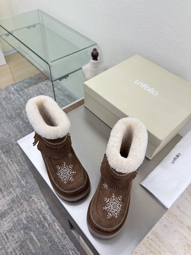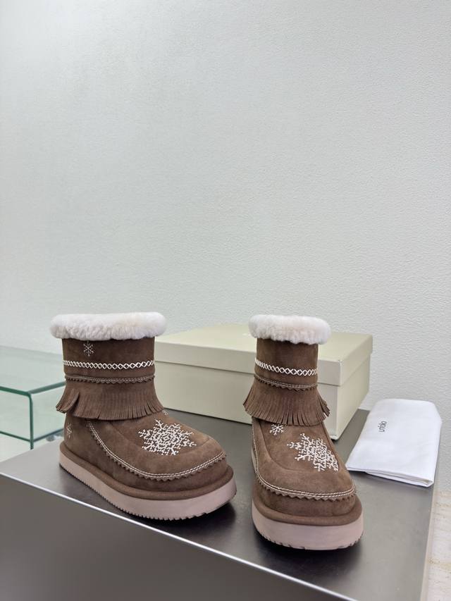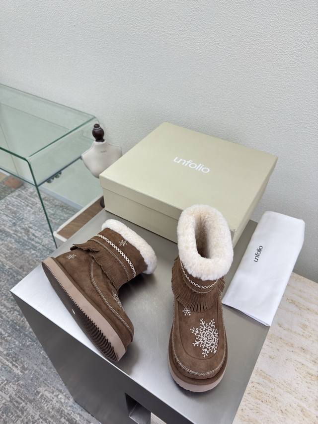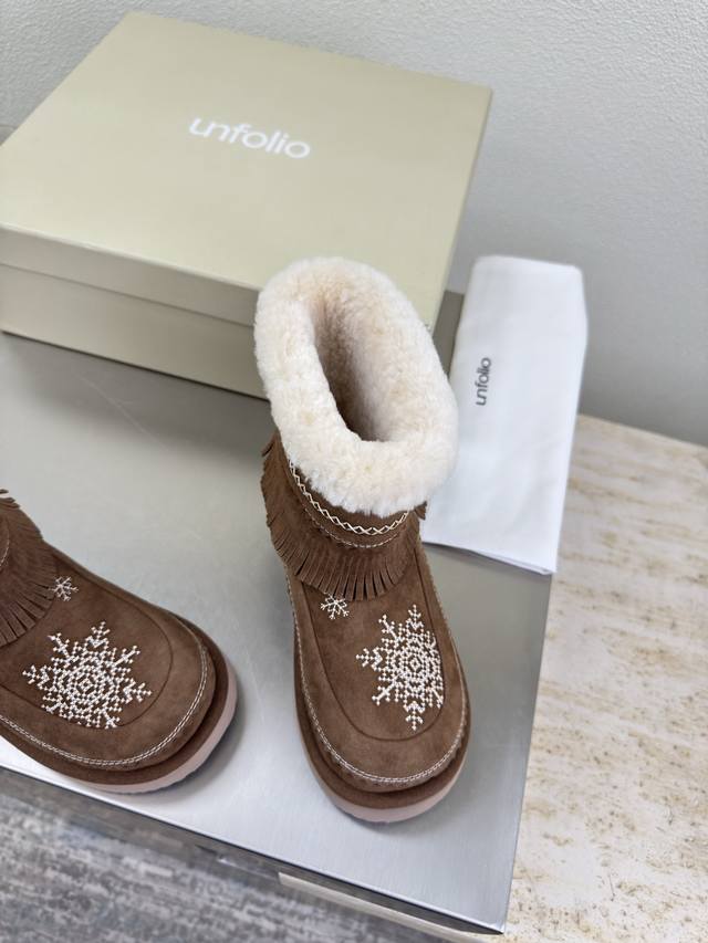 雪地靴 主推款 易搭配 Unfolio精品 DDD 高丝光牛反绒皮面 DDD 流苏设计 DDD 几万针刺绣雪花图案 DDD 内里羊毛 DDD 小众设计师25发布会新款 DDD 咖啡色 DDD 面料选用 高丝光牛反绒皮 DDD 内里舒适羊毛里 DDD 原版可回收材质收腰流线型橡胶大底 DDD 码数 35 36 37 38 39 40 41 40 41定制 DDD 原版包装 DDD