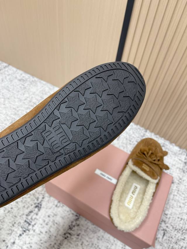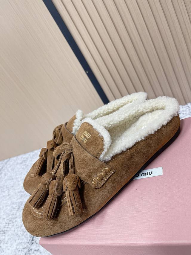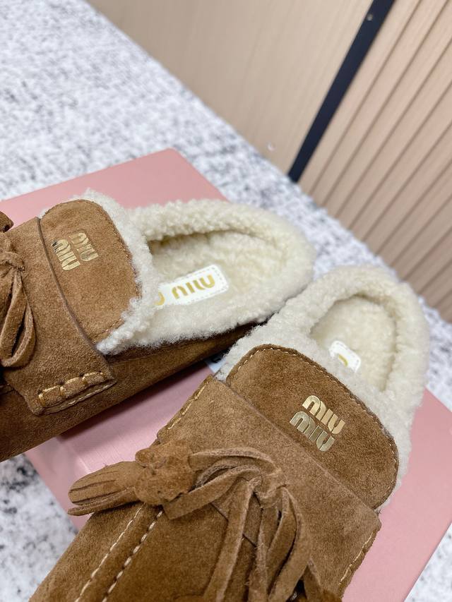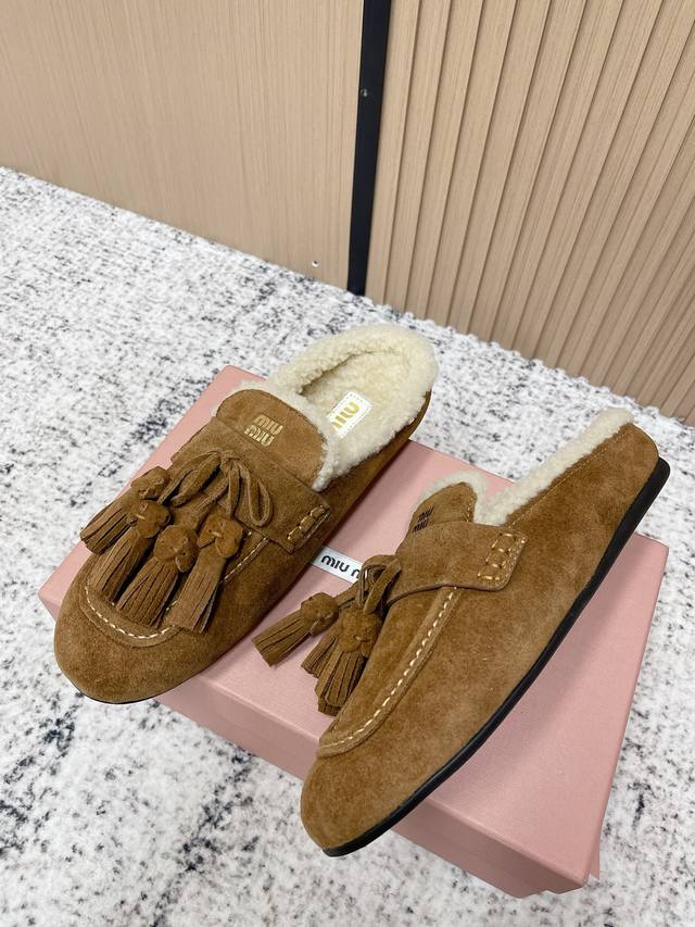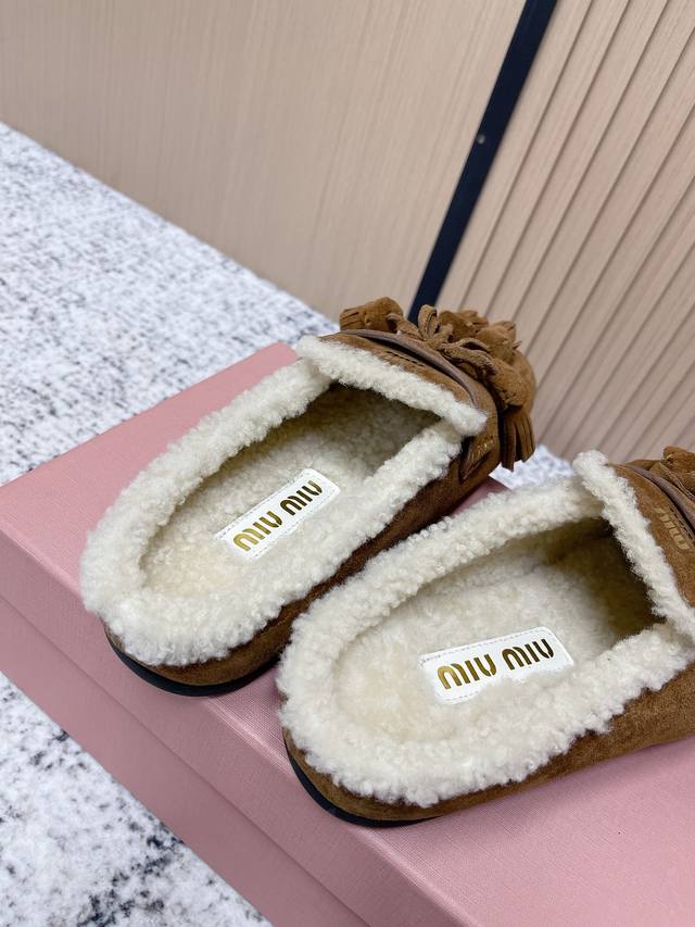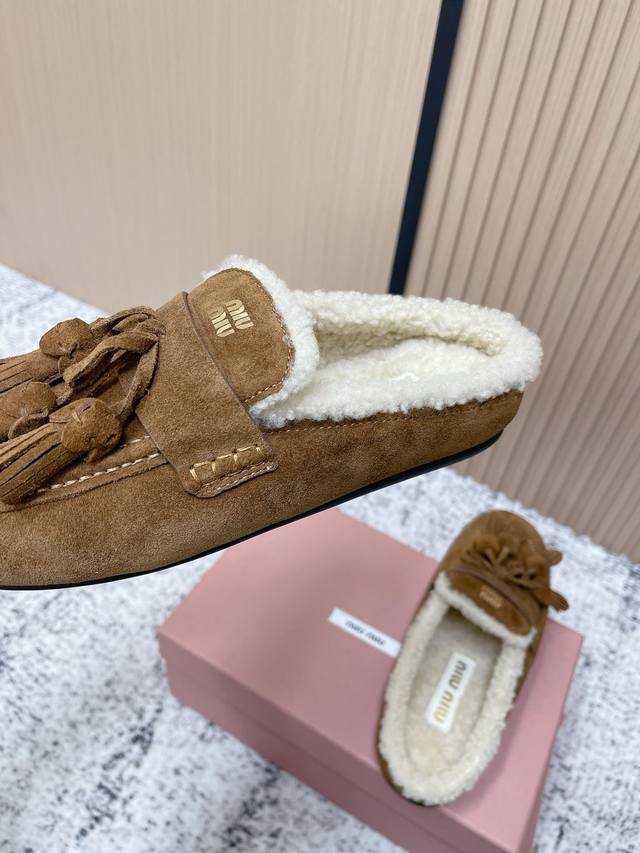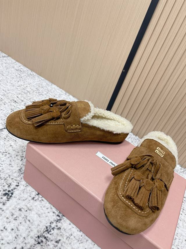/ 顶级品质: 飞机盒 Miumiu 缪缪2025Ss秋冬 流苏 时尚羊毛懒人半拖 秋上新 麂皮流苏乐福鞋 中古美感 新版型麂皮乐福鞋不基础 流苏设计带着一点复古的