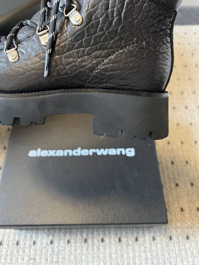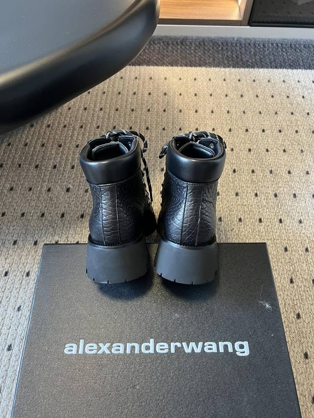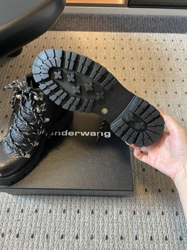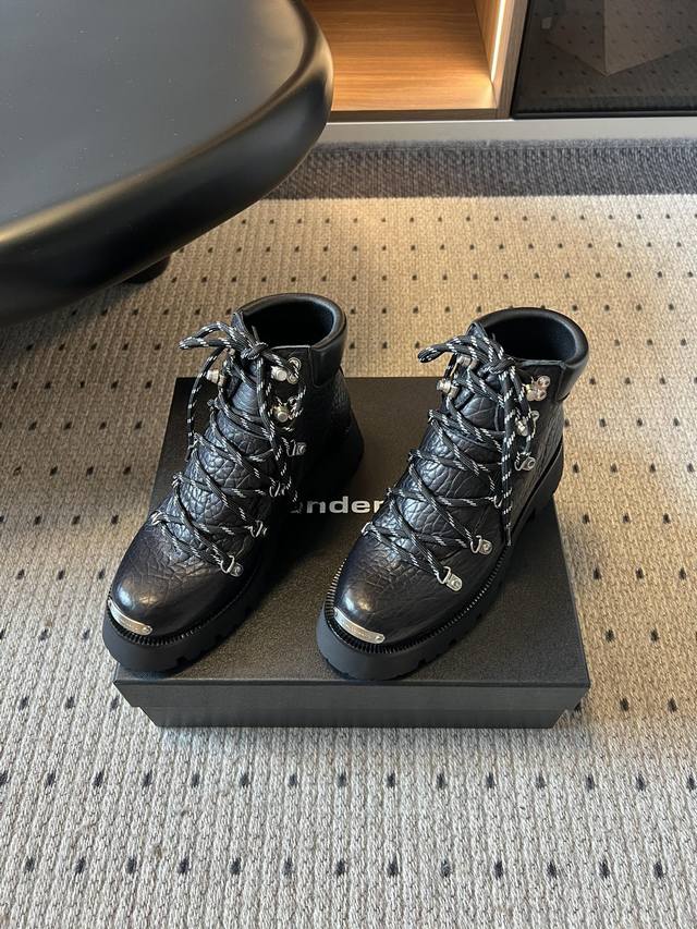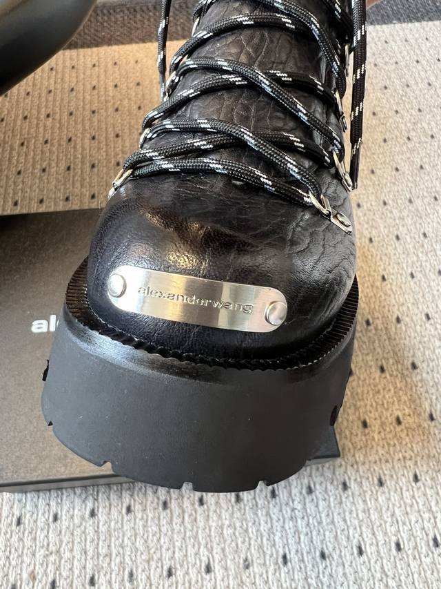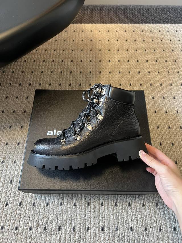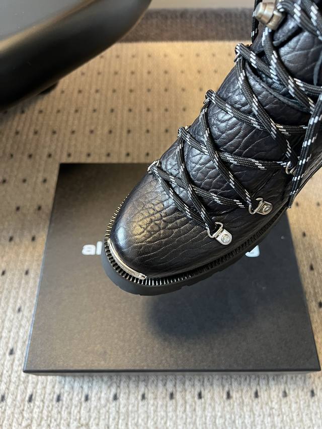 顶级品质 Alexander Wan*登山风系带短靴 融合户外登山靴的功能性与时尚品牌的先锋设计,以粗狂系带系统为核心亮点,搭配金属鞋头装饰与厚底廓形,兼具街头