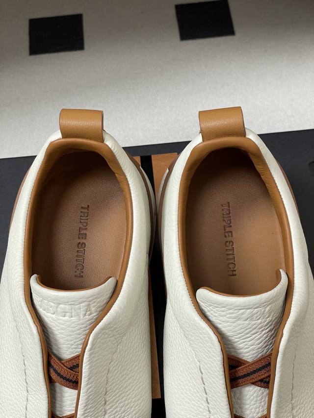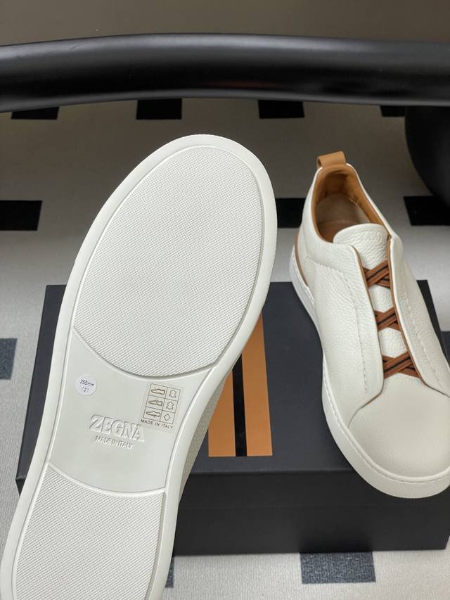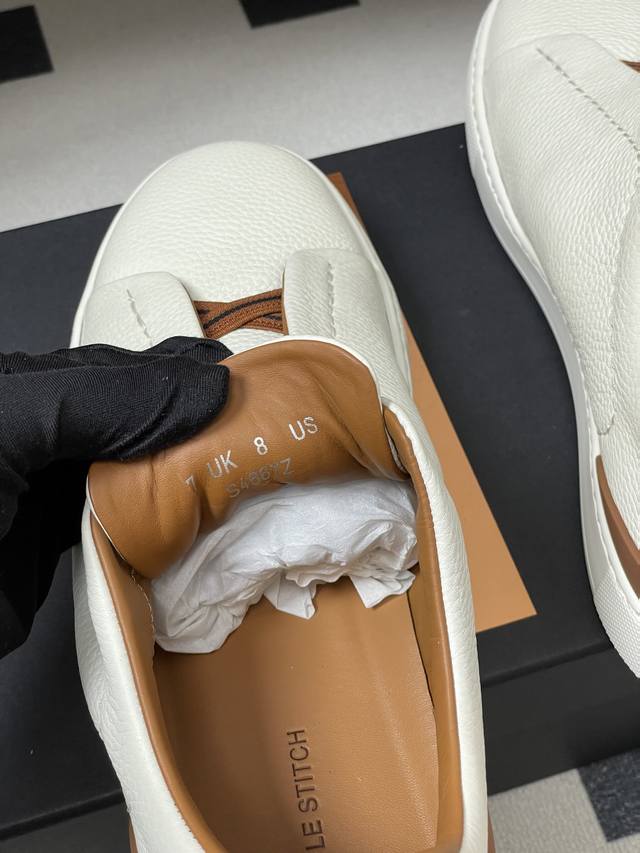 FFF 顶级品质 DDD Zegna杰尼亚 Triple Stitch运动鞋Ts-Secondskin 奢华商务休闲男鞋 DDD 这款Nero Oasi Triple Stitchtmsecondskin奢华休闲鞋以精选小牛皮制成,赋予其更胜以往的灵便之感。杰尼亚标志性三重交叉松紧细节确保穿脱灵便,同时令人联想到品牌精裁夹克的传统手工缝制工艺,致敬杰尼亚的精湛工艺传承。采用尤为柔软的轻盈鞋面,配以白色橡胶鞋底。Triple Stitchtmsecondskin奢华休闲鞋凝聚超过百年的精湛工艺,智慧传承以及