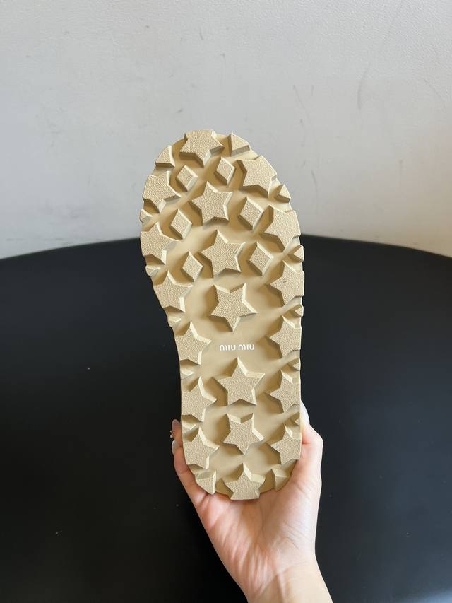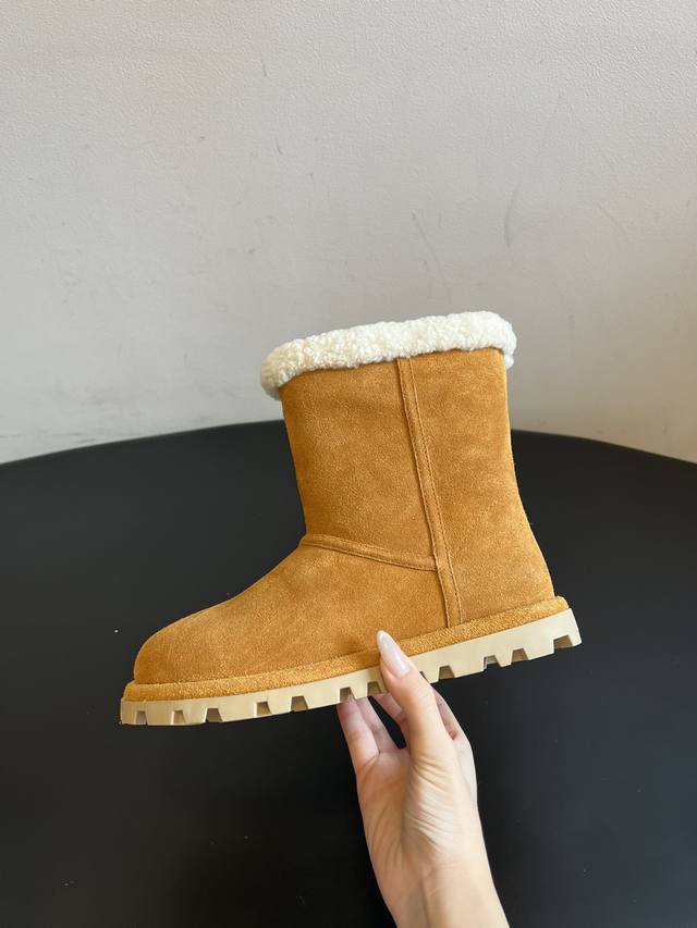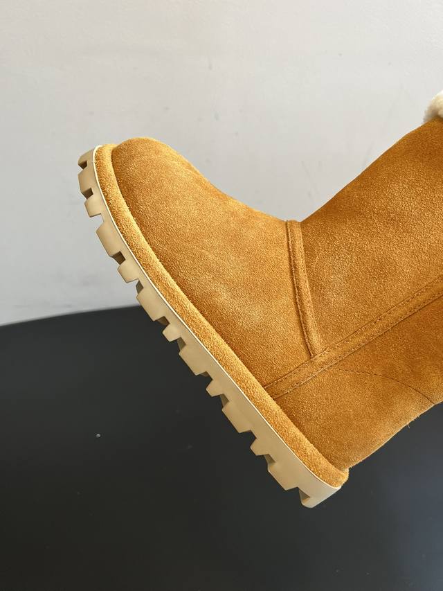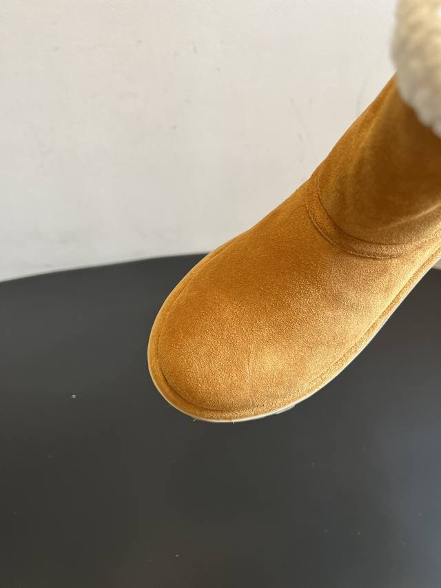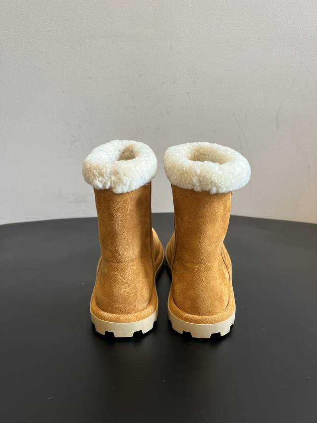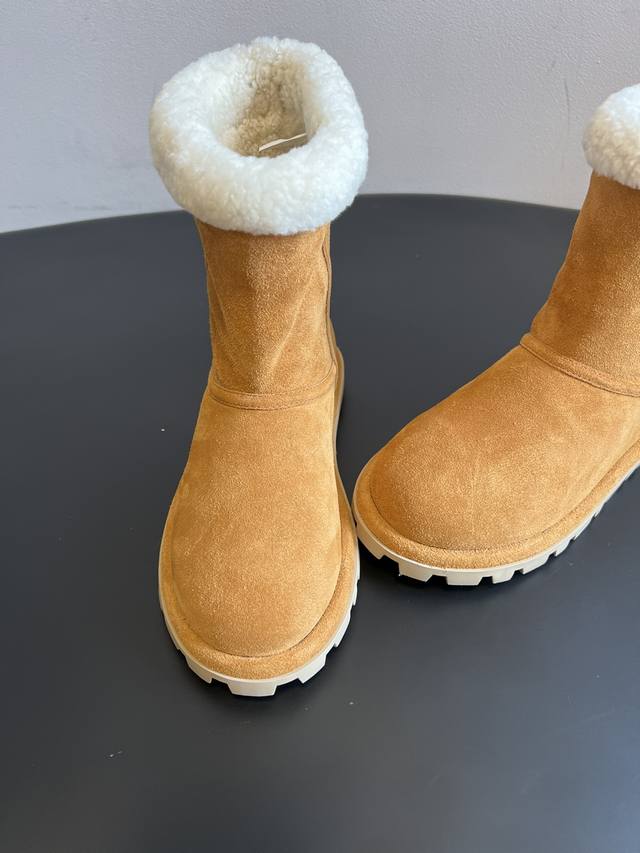 顶级品质 DDD Miu Mi* 25Ss 秋冬新款加绒短筒雪地靴 DDD 鞋面是麂皮材质,靴口和内里都加了厚毛绒,秋冬穿脚感特别暖,适合低温环境。用了齿状厚底,防滑性不错,走路稳的同时还能轻微增高。 DDD 短筒+柔和色系,既能搭休闲装,也能配温柔风穿搭,是秋冬的“懒人百搭款”。鞋型宽松不挤脚,靴筒高度刚好卡在脚踝位置,不会显得笨重。 DDD 鞋面:牛反绒 DDD 内里:羊毛 DDD 大底:橡胶大底 DDD 增高:2.5Cm DDD Size :35-40码 40码定制不退换 DDD