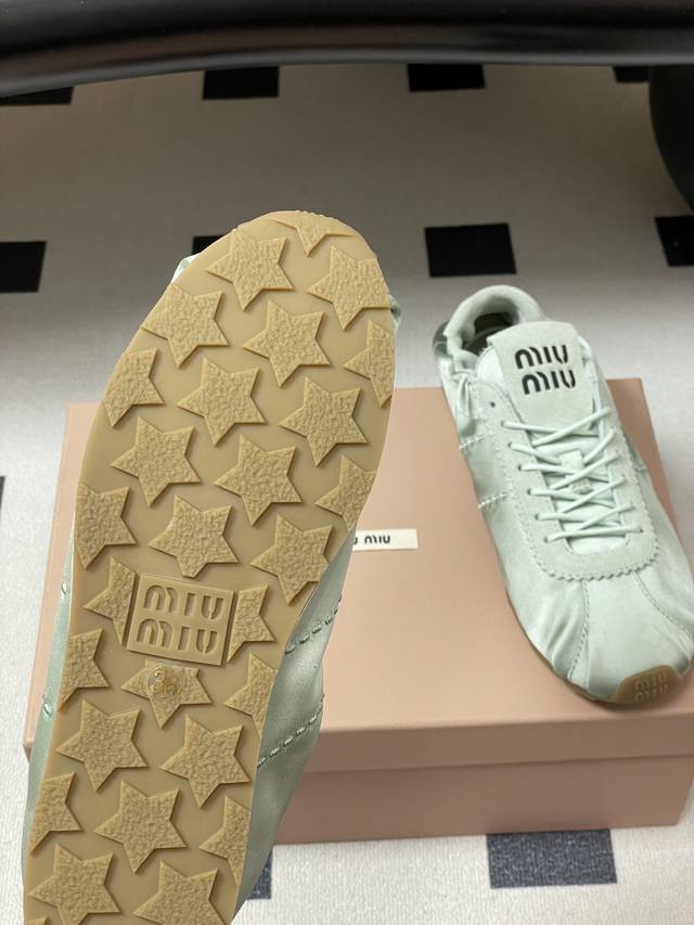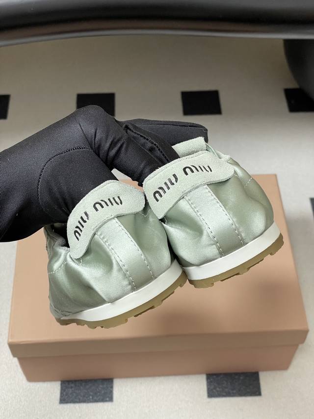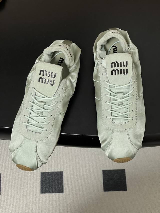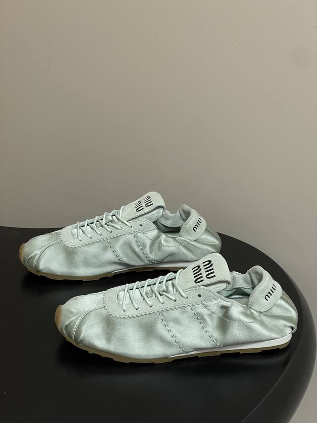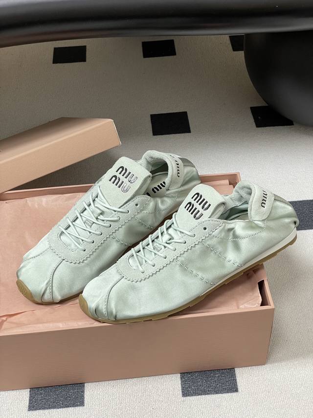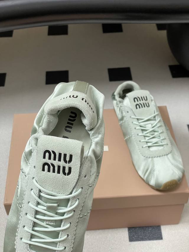 顶级品质 DDD Miumiu 缪缪 26春夏新款 plume缎面运动鞋系列薄底真丝绸缎面芭蕾德训鞋系带阿甘鞋休闲鞋 DDD 缎面芭蕾德训鞋,将德训鞋轮廓和芭蕾舞鞋优雅感融合,鞋身缎面+麂皮拼接,光泽感满满,褶皱细节超有辨识度。浅色橡胶平底,日常穿超舒适,无论裙装还是裤装都能轻松打造芭蕾风时髦感,是Miu Miu热门单品! DDD 鞋面:定制真丝缎面拼接牛反绒 DDD 内里垫脚:羊皮 DDD 鞋底:开模橡胶大底 DDD 码数:35-39 40.41定做不退换 DDD