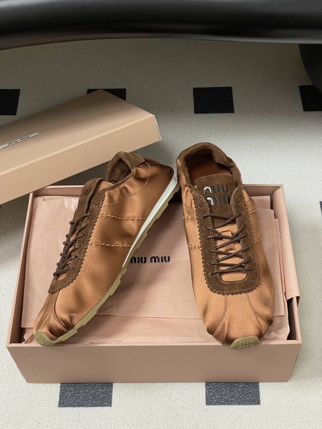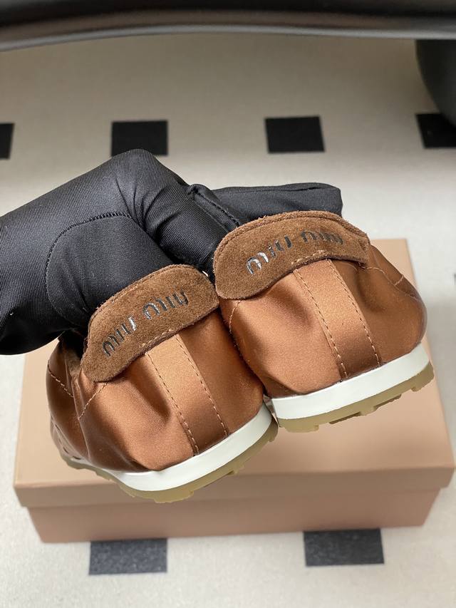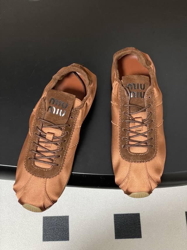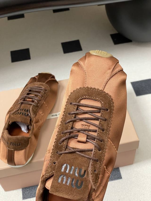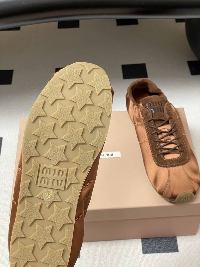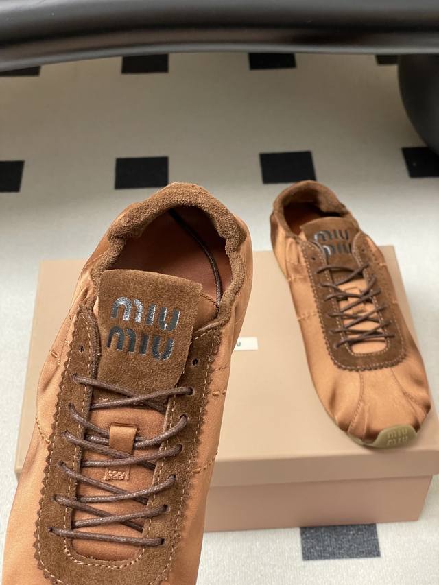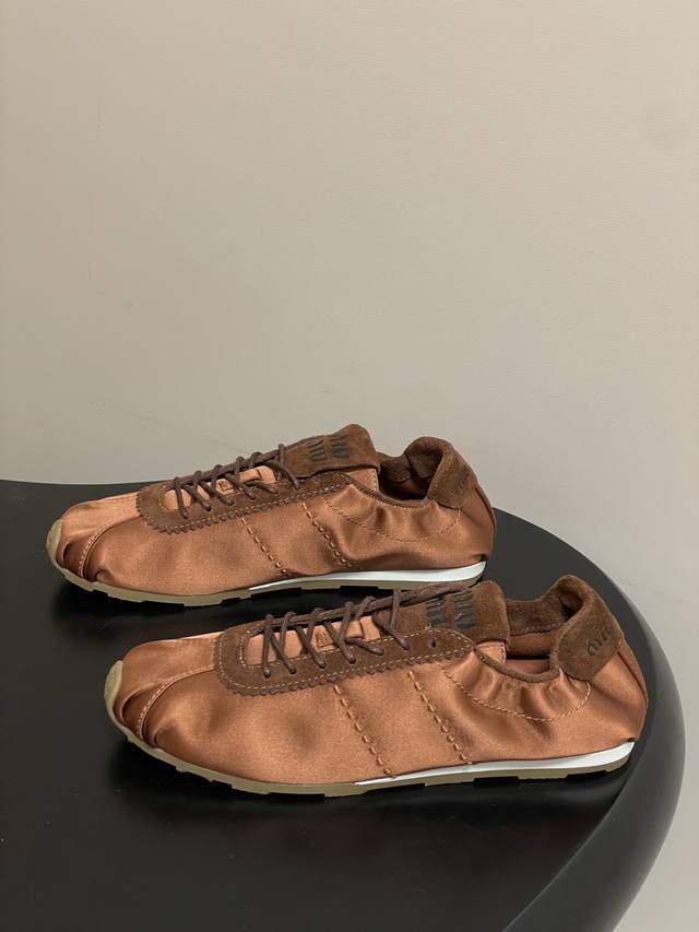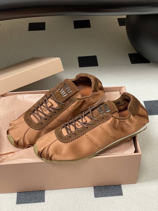 顶级品质 DDD Miumiu 缪缪 26春夏新款 plume缎面运动鞋系列薄底真丝绸缎面芭蕾德训鞋系带阿甘鞋休闲鞋 DDD 缎面芭蕾德训鞋,将德训鞋轮廓和芭蕾舞鞋优雅感融合,鞋身缎面+麂皮拼接,光泽感满满,褶皱细节超有辨识度。浅色橡胶平底,日常穿超舒适,无论裙装还是裤装都能轻松打造芭蕾风时髦感,是Miu Miu热门单品! DDD 鞋面:定制真丝缎面拼接牛反绒 DDD 内里垫脚:羊皮 DDD 鞋底:开模橡胶大底 DDD 码数:35-39 40.41定做不退换 DDD