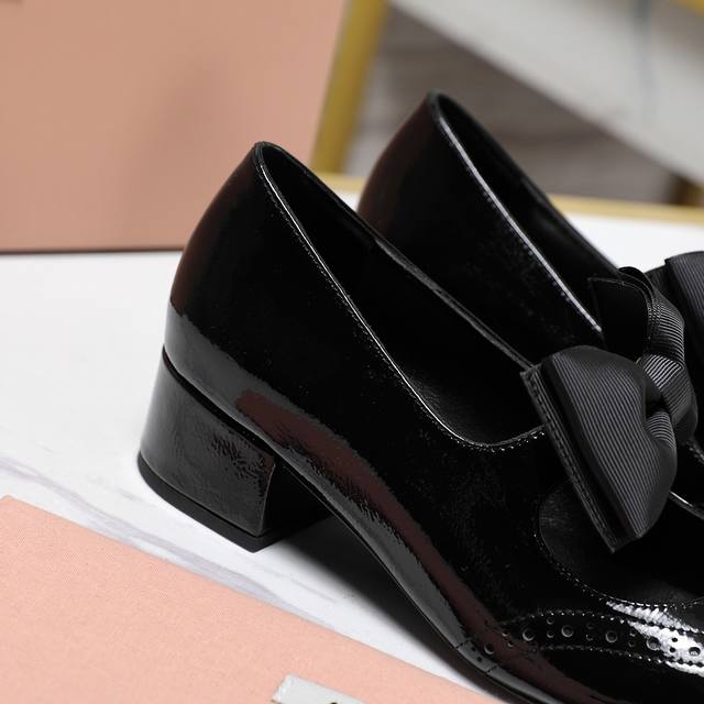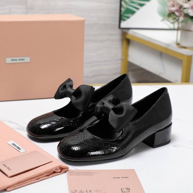 光泽牛漆皮鞋面一字带,金属Miu缪Logo饰以点缀,细节质感满满~复古时髦~