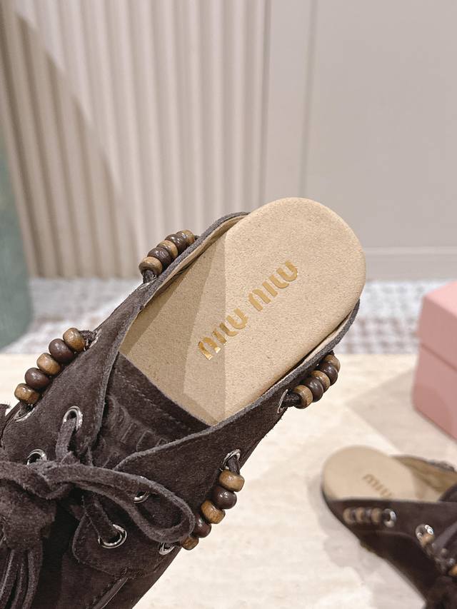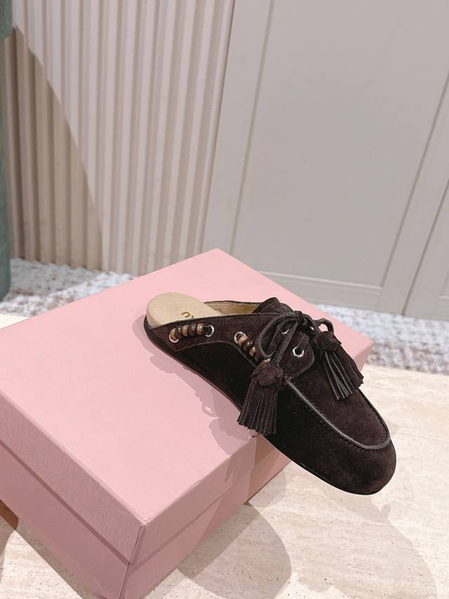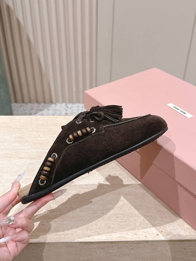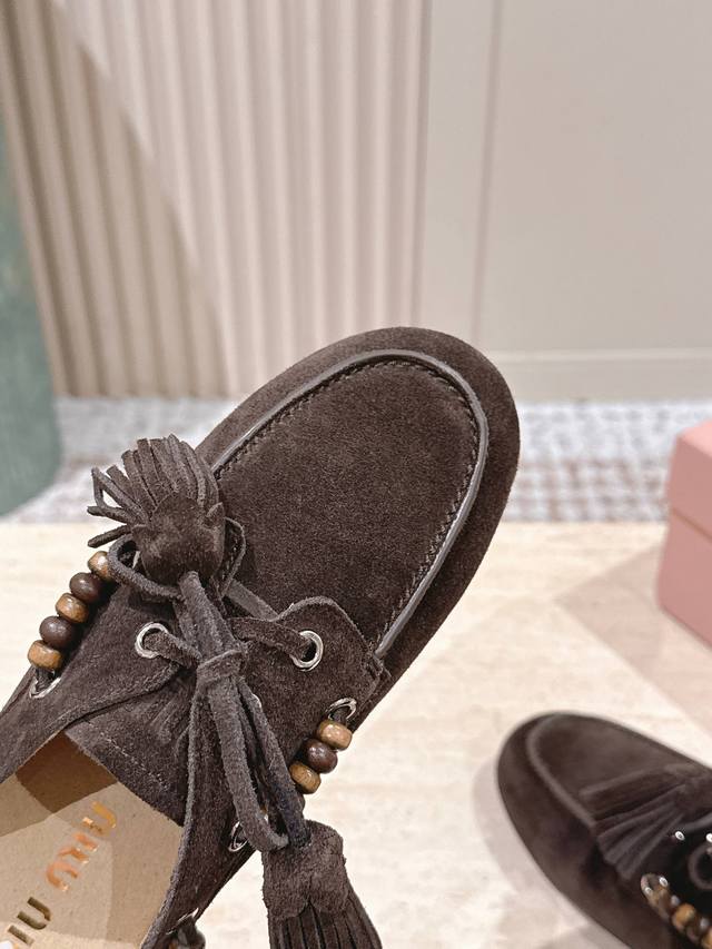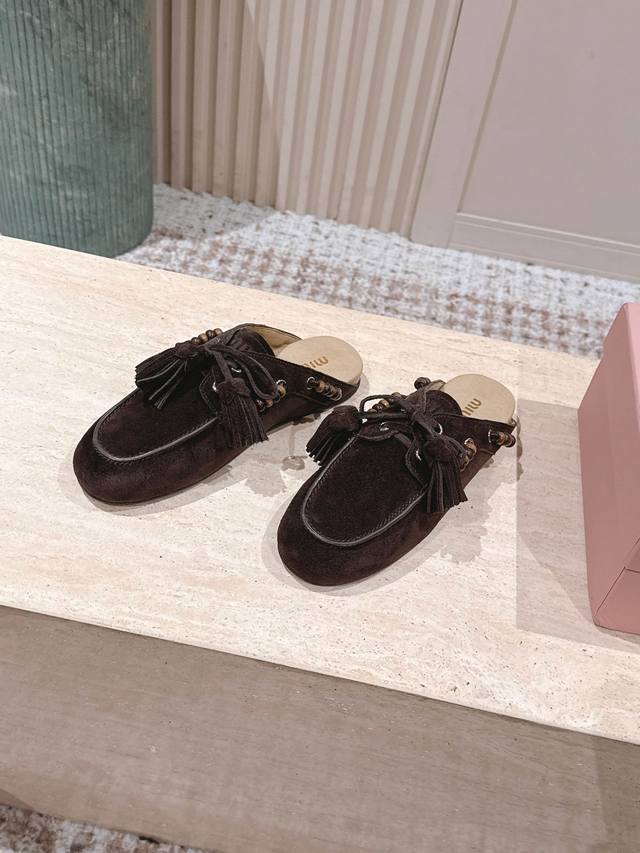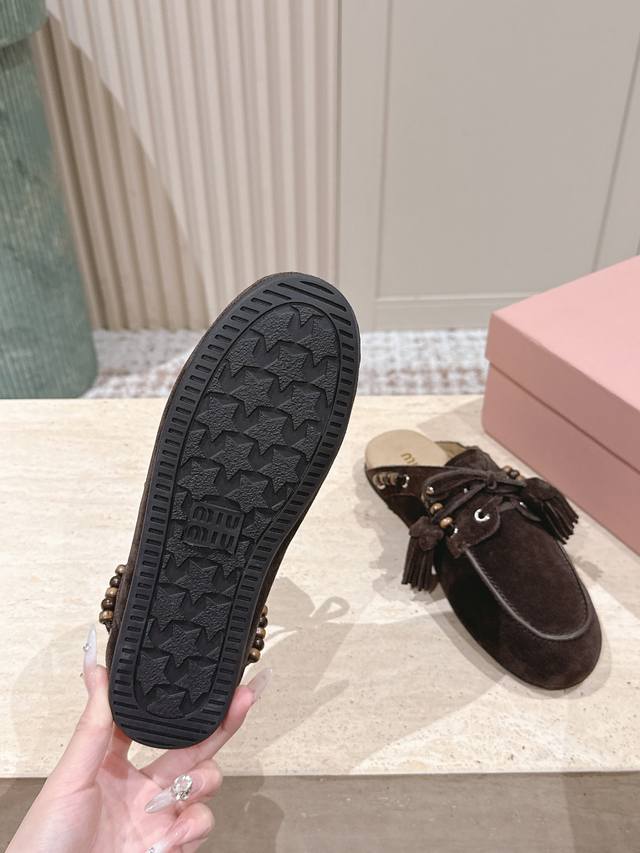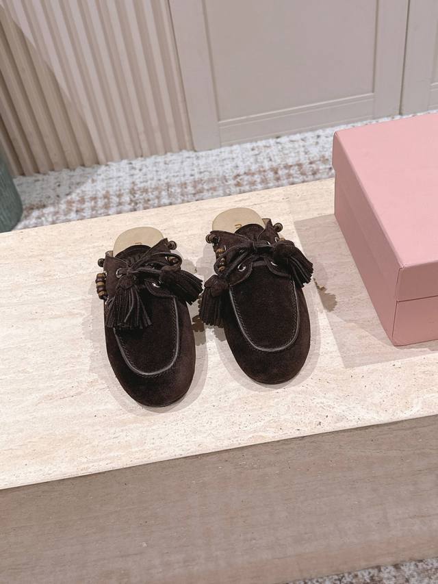 顶级版本:半拖 :满帮 :Miu Mi* 25Fw Deck Shoes 麂皮船鞋 DDD Miumiu家新款Deck Shoes也太有设计感了吧,秋冬氛围感拉满,舒适又时尚,秋冬新款麂皮一脚蹬,俏皮的系带流苏,复古的干异色系,内里磨毛的设计让穿着体验度更加高涨 DDD 面料:牛反绒 DDD 内里:双面绒 DDD 大底:橡胶大底 DDD Size:35-41 40.41定制不退换 DDD