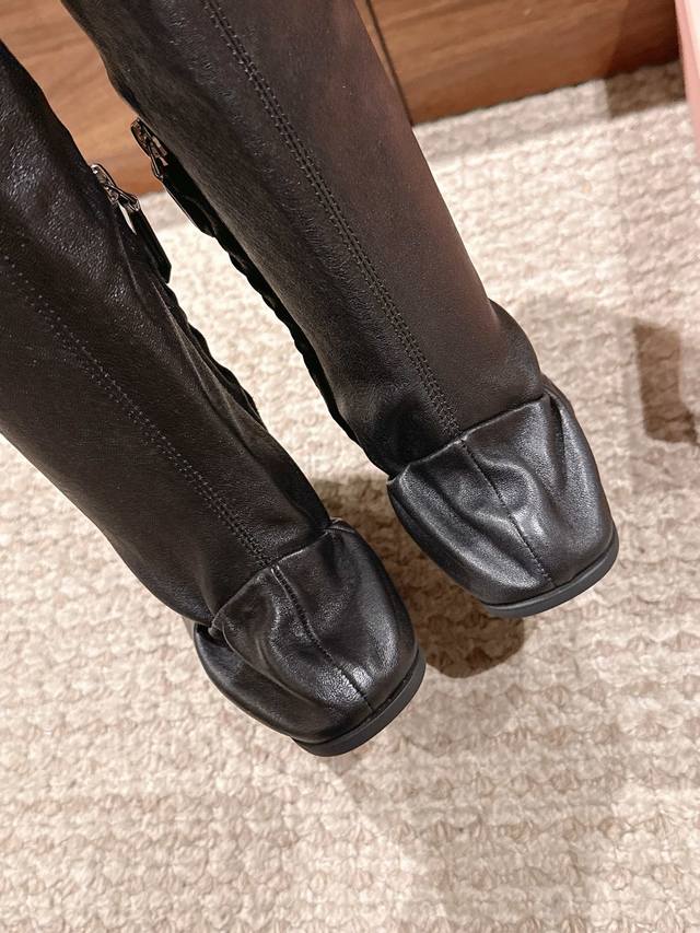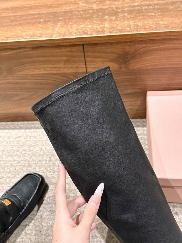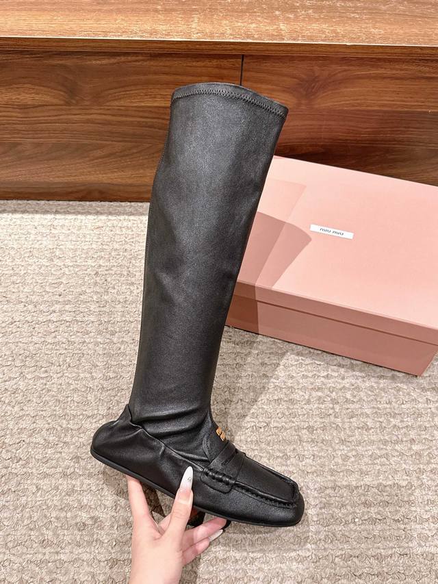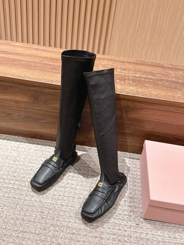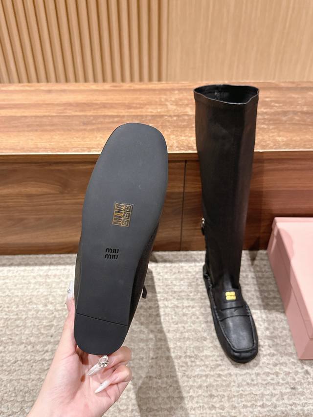 顶级版本 缪缪#Deck Shoes新款弹力长筒靴 采用羊皮材质,鞋头为方头设计,带有乐福鞋的经典元素,鞋面上有醒目的黄色“Miu Miu”品牌标识,增添了品牌辨识度。是修长的长筒款式,侧边有拉链设计,方便穿脱,皮革材质的靴筒具有一定的延展性,能够贴合腿部线条。 可搭配紧身牛仔裤或黑色打底裤,突出靴子的利落感,上身搭配短款夹克或毛衣,打造酷飒的街头风格。也能与连衣裙搭配,形成“下装失踪”的穿搭效果,展现甜酷的混搭风格,适合日常出街或时尚派对等场合。 鞋面:弹力牛皮 内里:羊皮 大底:原版开模大底 Size