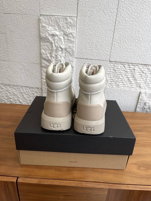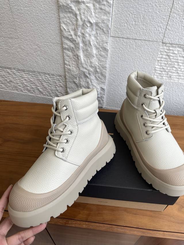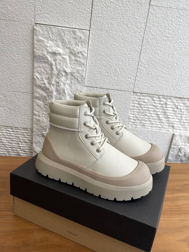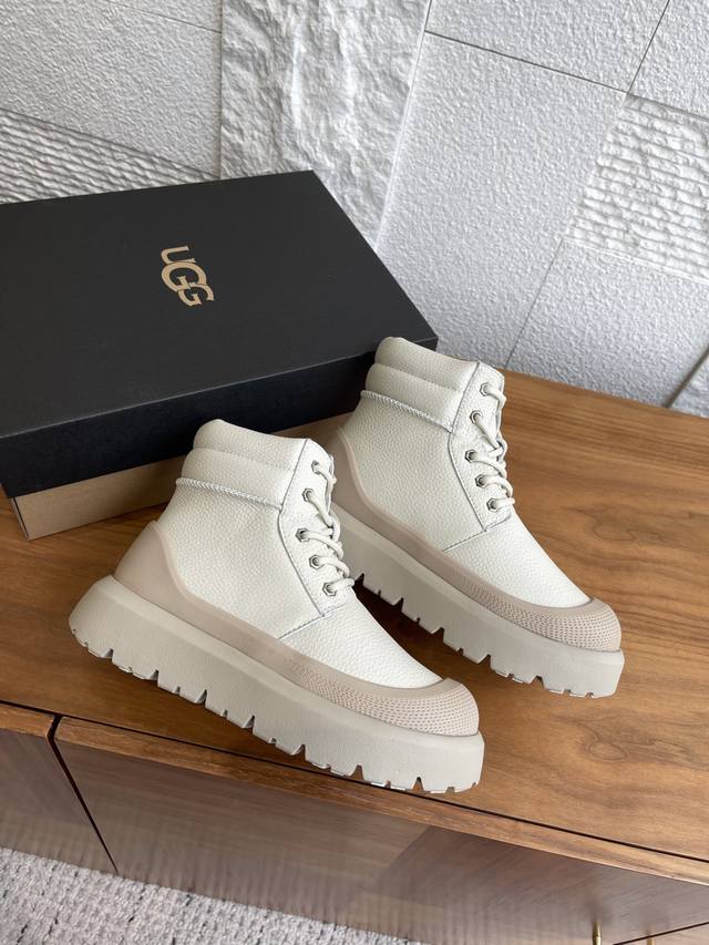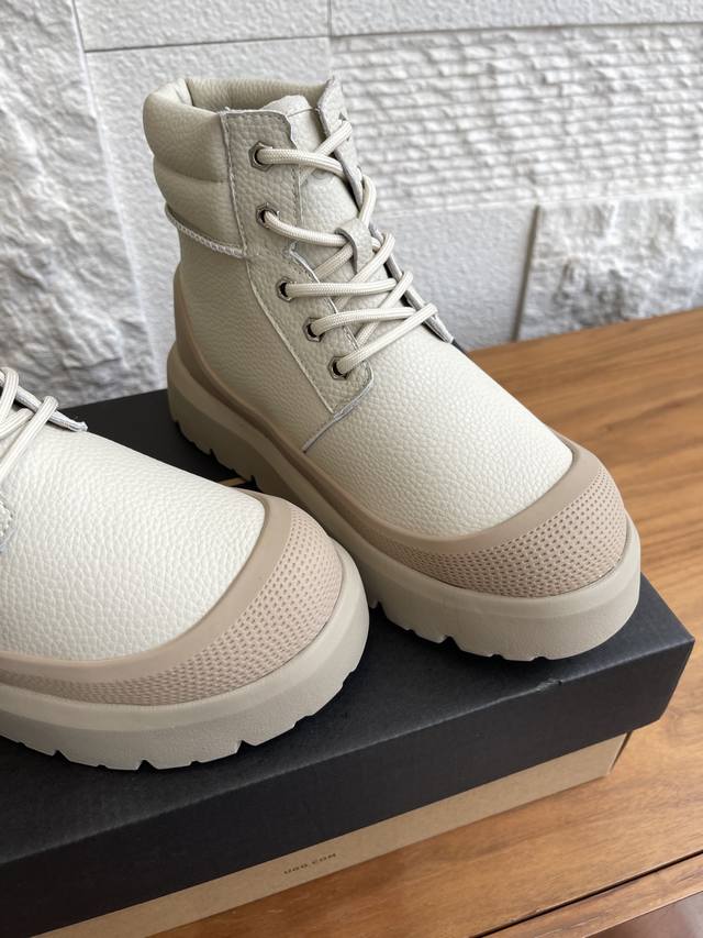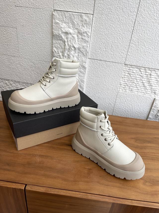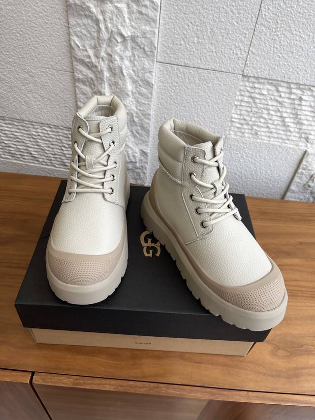 顶级版本: 莞货 Ugg 2025 秋冬新款 男女同款 Heritage 系列Neumel Weather Hybrid 纽姆 系带厚底 短靴 雪地靴 Ugg这款男女同款 Heritage 系列,Neumel Weather Hybrid 纽姆 ,经典防水混合款短靴,前卫撞色设计,搭出亮眼造型,牛剖层翻毛皮鞋面+约17毫米Uggplush里衬、鞋垫,松紧系带和栓扣,高帮靴筒,功能与保暖兼备。Eva外底防滑蛛网橡胶底,提供良好抓地力。 面料:进口荔枝纹牛皮 内里:羊皮毛一体 大底:Eva发泡大底 Size: