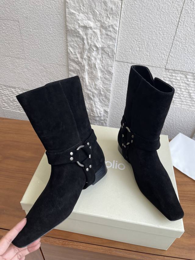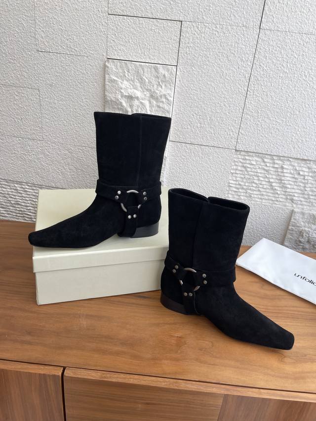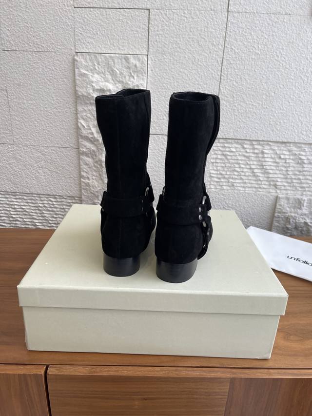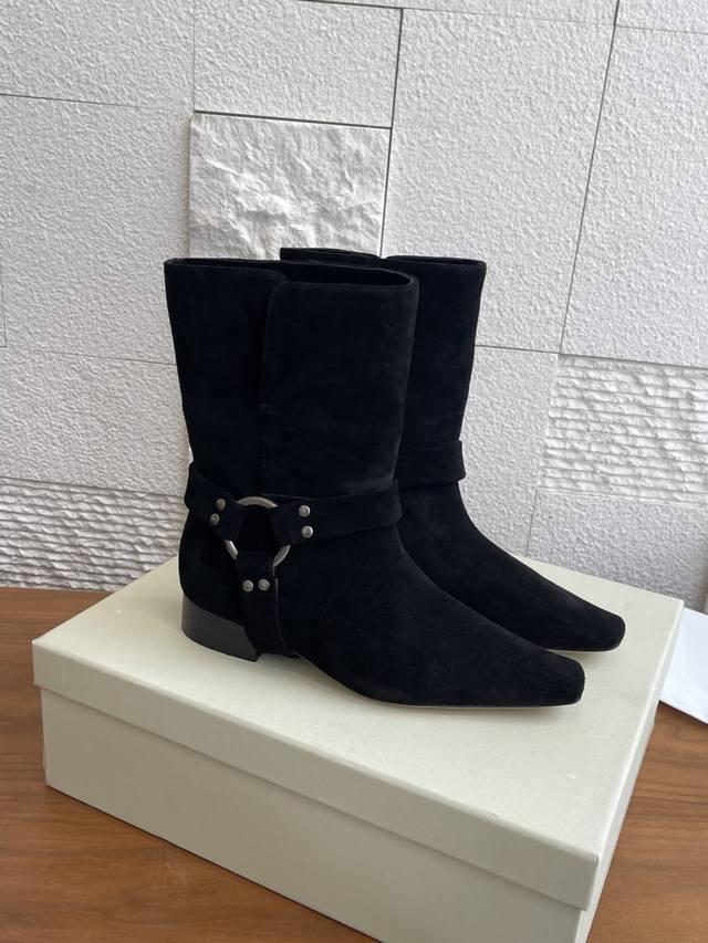 顶级版本: 韩国 Shop Weare 25Ss 小方头 金属扣 粗跟 短靴 原版购入开发1:1复刻做货。韩国Shop Weare设计师档口手工鞋。绒面皮拼接设计,银色铆钉细节 环形五金配件 饰带细节。 面料:进口高丝光麂皮 内里:进口牛皮 大底:意大利进口真皮大底 Size:35-40 40定做不退换