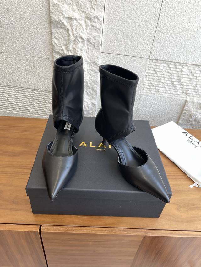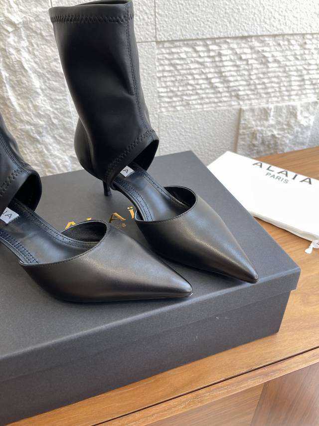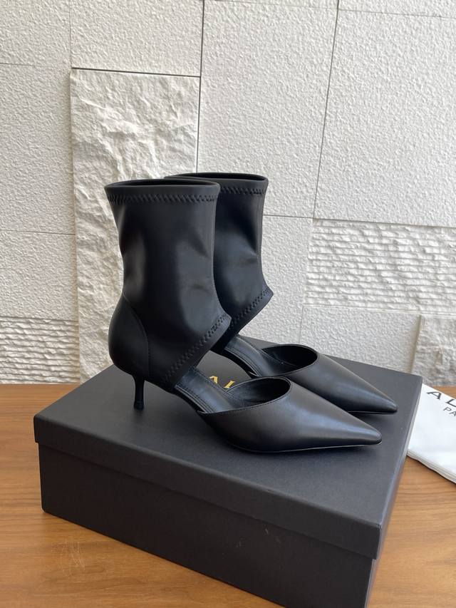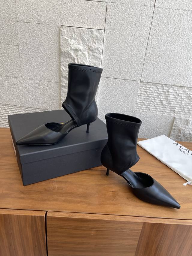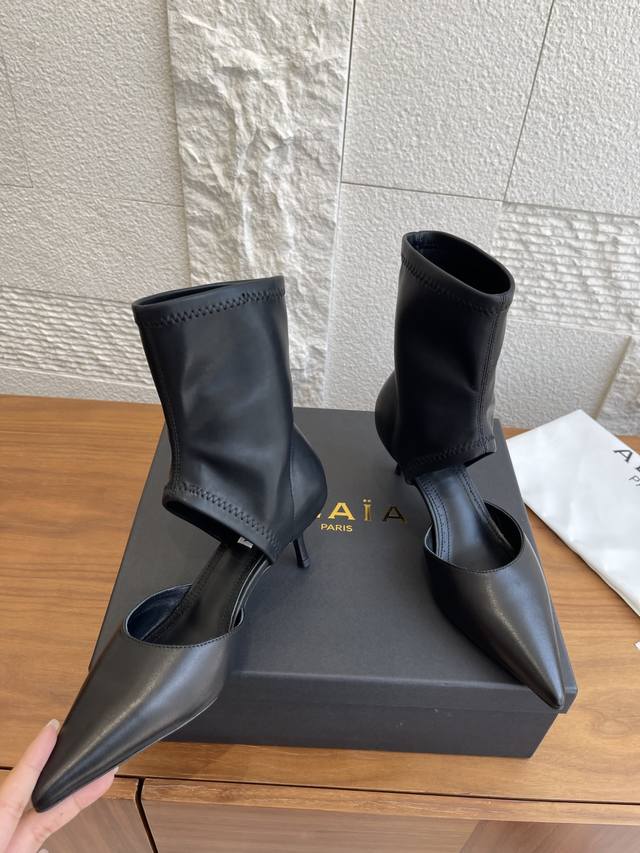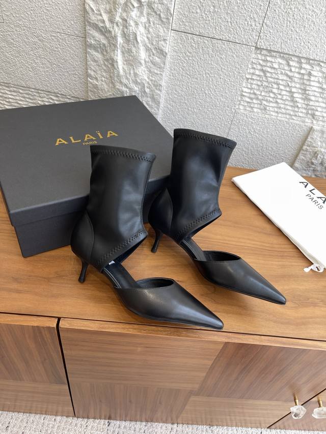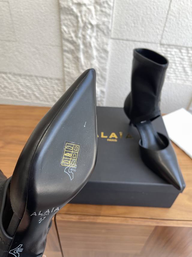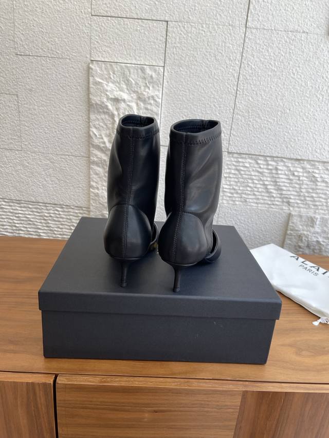 顶级版本: Alaia 阿莱亚 25Ss 秋冬新款 尖头 中空 细跟 瘦瘦靴 袜靴 短靴 Alaia这款踝靴采用柔软的麂皮和小羊皮制成,质感高级,鞋面设有颇为前卫的几何感挖剪,配有尖头和舒适的5.5Cm小猫跟。脚长作弊神器,心细高跟物理延长腿部线条,黑色系靴筒视觉瘦腿叠满让腿长多偷5Cm,做魅力圈女人。 面料:进口弹力麂绒 进口弹力小羊皮 内里:进口羊皮 大底:意大利进口真皮大底 跟高:5Cm Size:35-41 40 41定做不退换