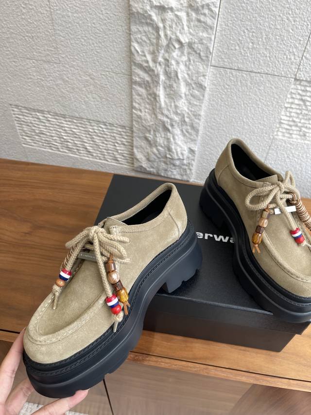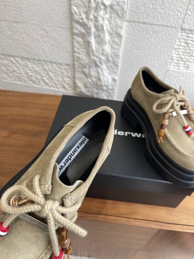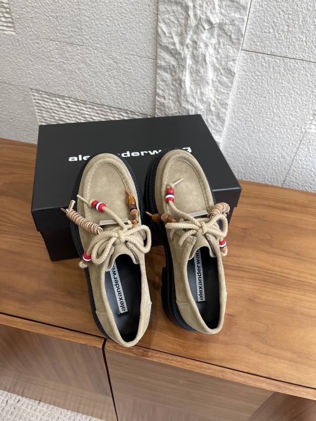 / 顶级版本: Alexander Wang 亚力山大王 25Ss 秋冬新款 复古 系带 厚底 乐福鞋 休闲鞋 Aw大王这款厚底乐福鞋采用麂皮绒制成,鞋带配金属徽标