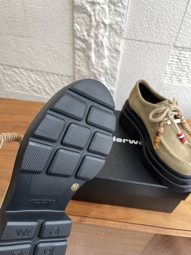 顶级版本: Alexander Wang 亚力山大王 25Ss 秋冬新款 复古 系带 厚底 乐福鞋 休闲鞋 Aw大王这款厚底乐福鞋采用麂皮绒制成,鞋带配金属徽标