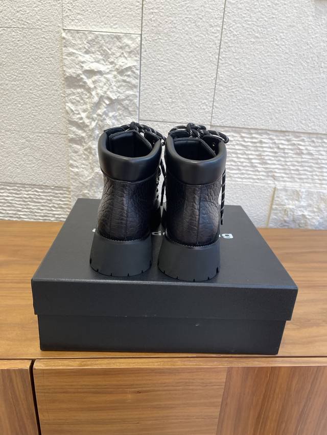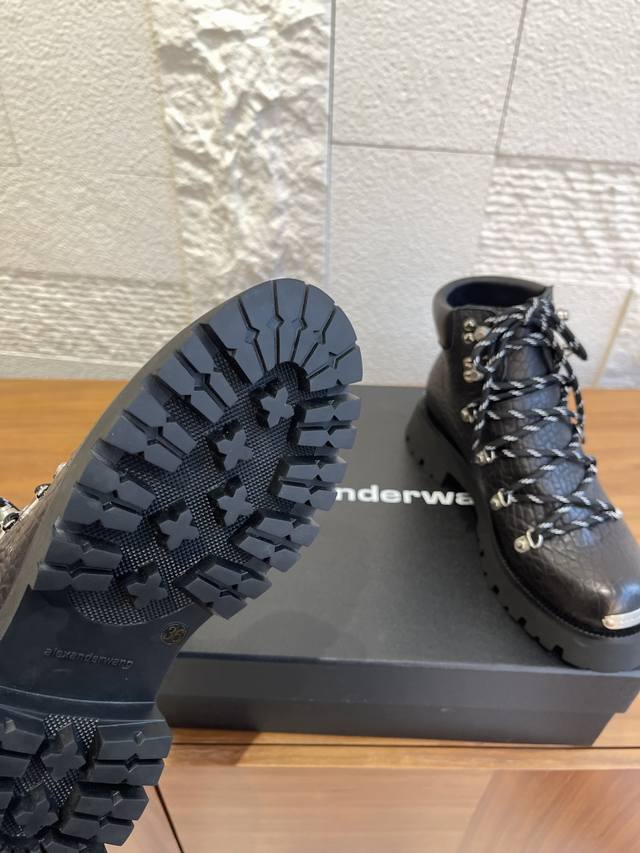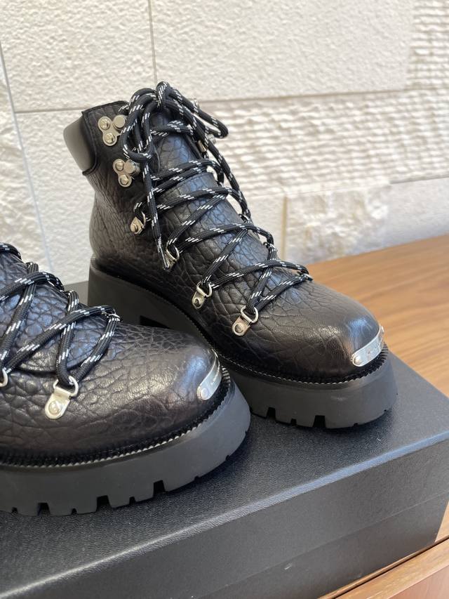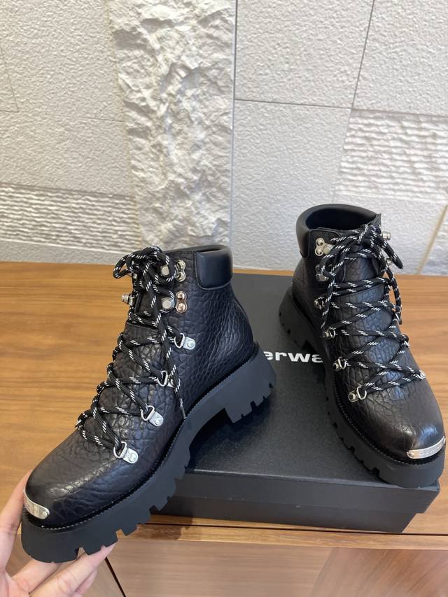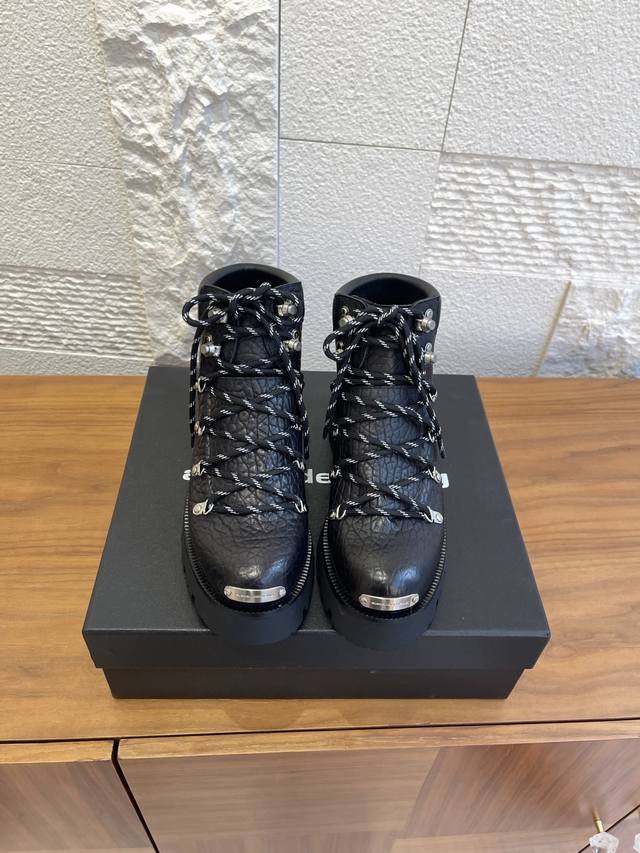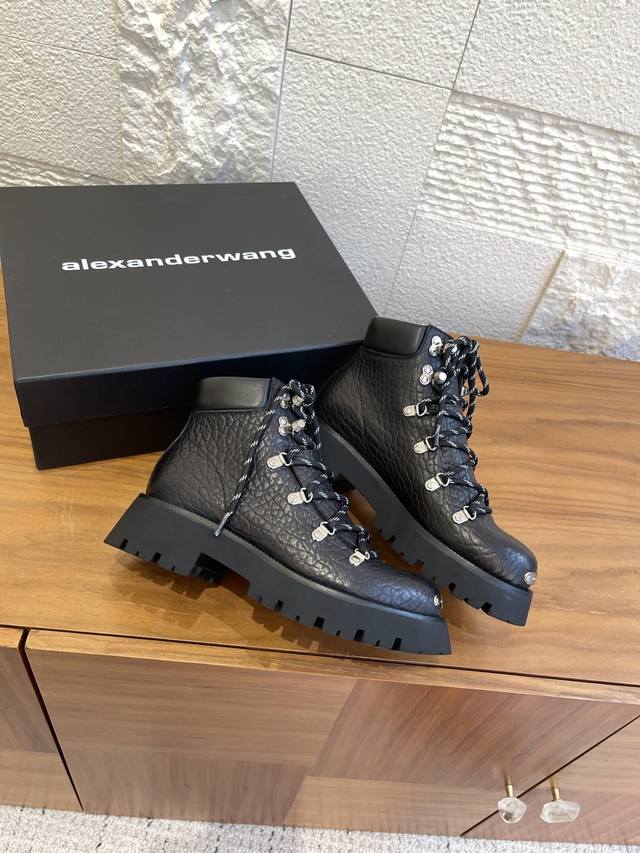 顶级版本: Alexander Wang 亚力山大王 25Ss 秋冬新款 复古 系带 厚底 短靴 马丁靴 Alexander Wang这款系带厚底短靴,细节感满满!金属鞋带孔+绑带设计,复古又现代,7Cm厚底显高显瘦,腿长神器Getv。橡胶鞋底耐磨防滑,秋冬穿搭超百搭,无论牛仔裤还是裙装都能轻松驾驭,通勤休闲都Ok,时尚实用两不误。 面料:原版定制进口牛皮 荔枝纹牛皮 内里 垫脚:进口羊皮 大底:原版开模橡胶发泡大底 底厚:7Cm Size:35-40 40定做不退换