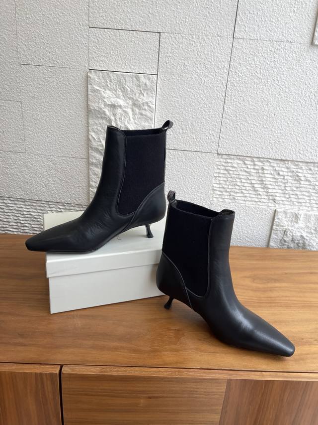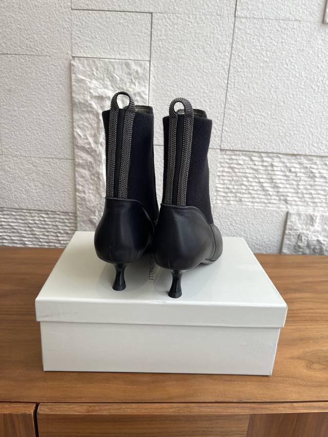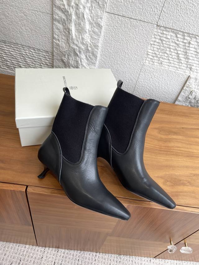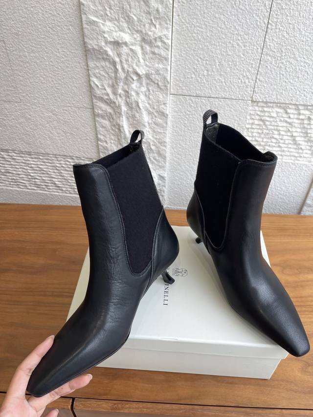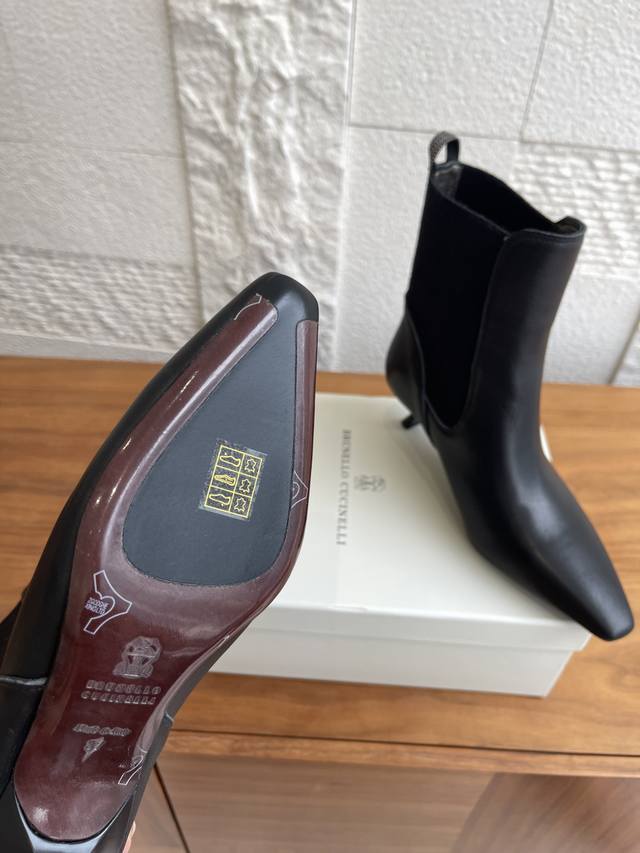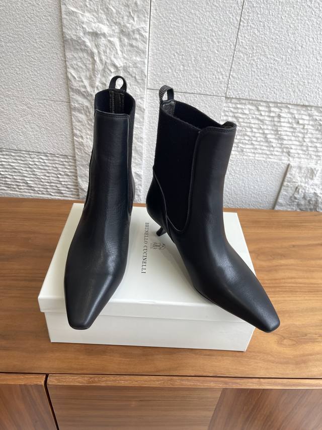 顶级版本: Brunello Cucinelli 2025 秋冬新款 方头 细跟 镶珠装饰 短靴 Brunello Cucinelli 推出这款精致的切尔西靴,5厘米斜跟设计更显高挑。这款靴子采用柔软的绒面革于意大利精制而成,配有舒适的弹力拼接,并采用窄方头设计。绒面皮革质地上散发着若隐若现的朦胧光泽,后部的双环扣饰以Brunello Cucinelli的标志性璀璨镶珠刺绣点缀,为整体造型系上一缕浪漫韵味。 面料:原版定制进口特级高丝光麂皮 小牛皮 内里 垫脚:进口牛皮 大底:意大利进口真皮大底+Tpu橡