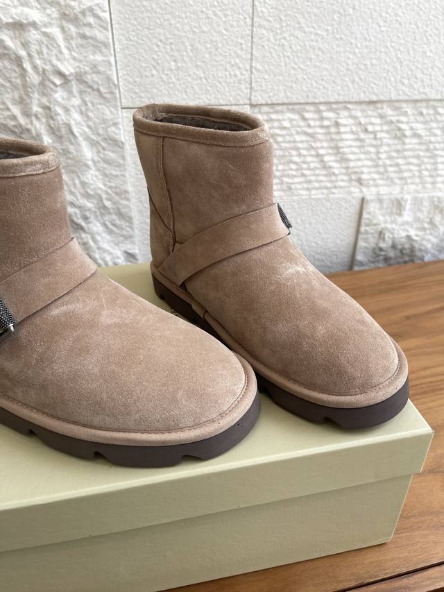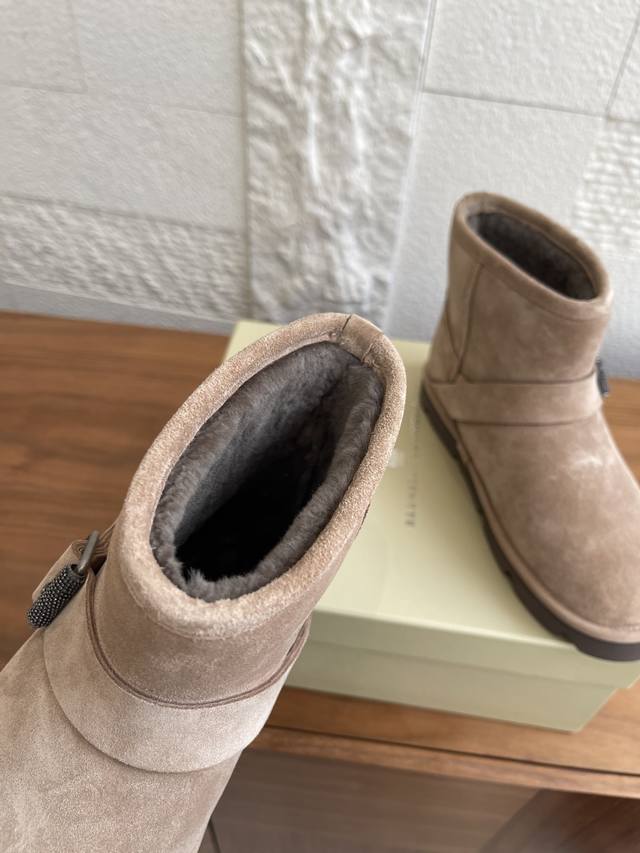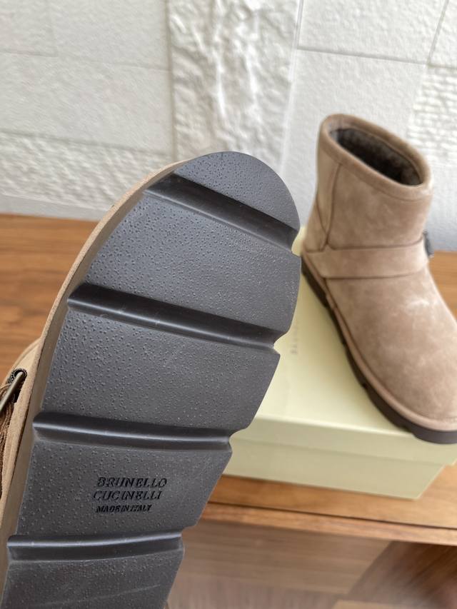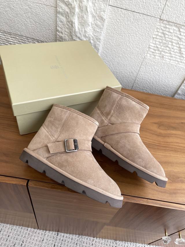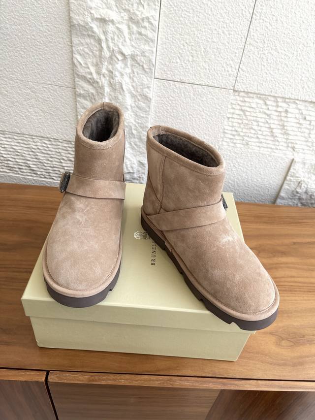 顶级版本: Brunello Cucinelli 2025 秋冬新款 时尚休闲 搭扣带 短靴 雪地靴 十分显明的冬季外观与Brunello Cucinelli的珍贵细节组合,在这款麂皮短靴上共舞唯美风格。内侧的剪毛绵羊皮鞋衬,提升整体包裹感与温暖感。宽幅搭扣带搭配璀璨镶珠,以标志细节赋予鞋子柔和光泽。微孔材料制成的轻盈鞋外底弹性减震,进一步提升穿着舒适度。 面料:原版定制进口特级高丝光麂皮 内里 垫脚:进口羊羔毛 大底:原版开模橡胶发泡大底 Size:35-42 41 42定做不退换
