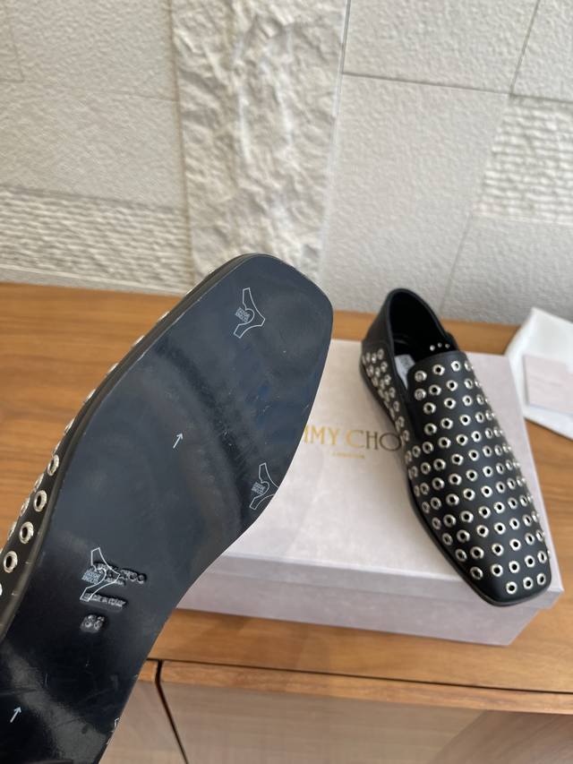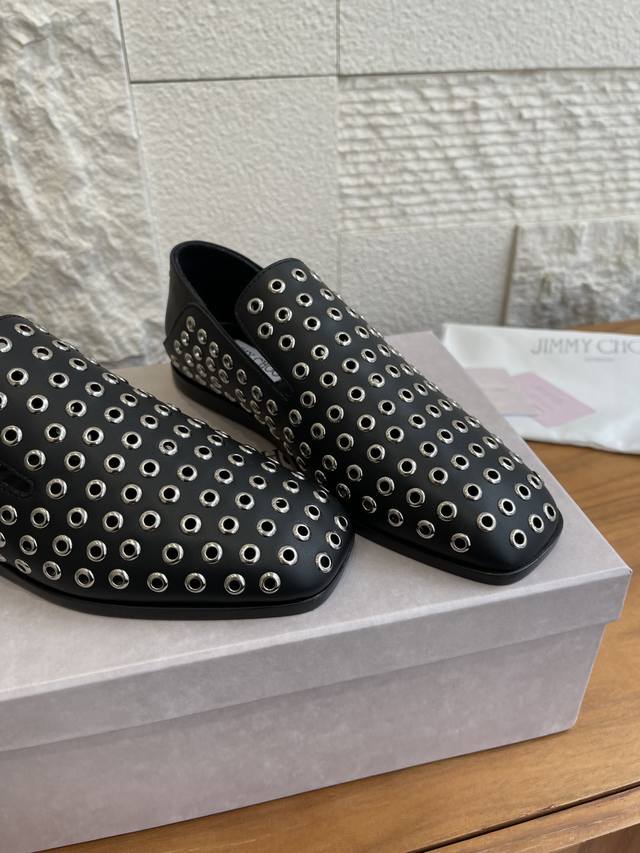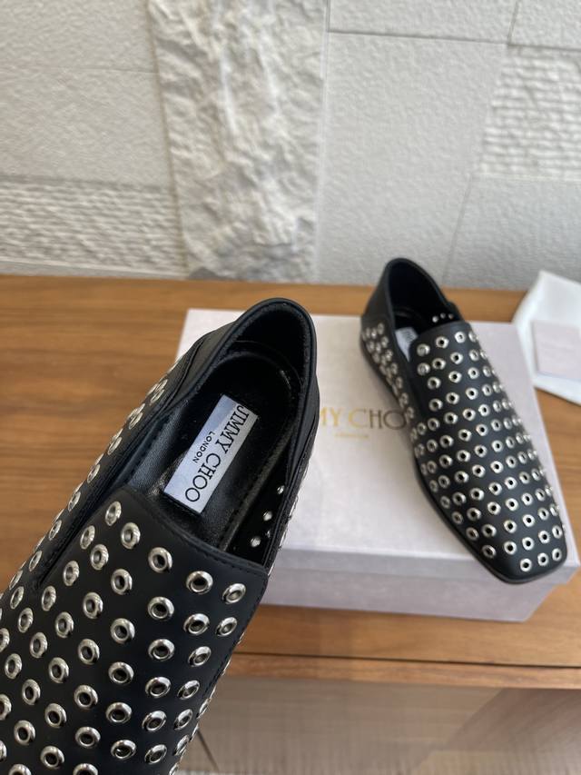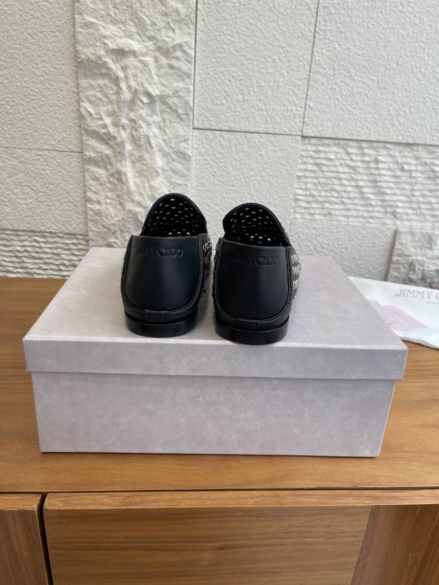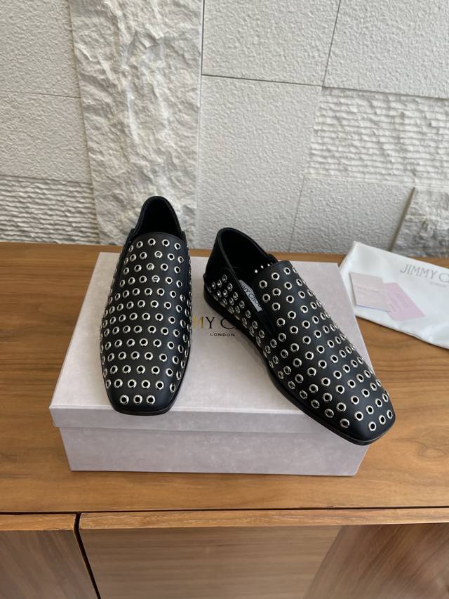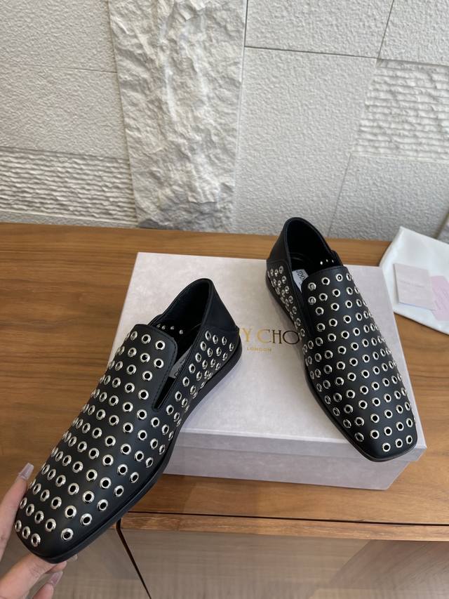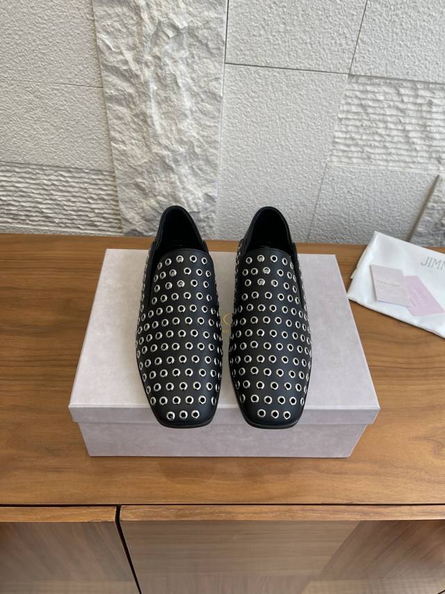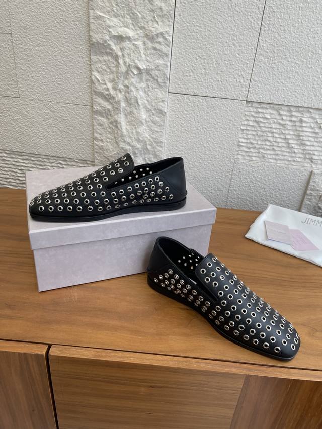 顶级版本: DDD Jimmy Choo吉米周 2025 王一博同款 Eliot Slipper 平底 中跟 单鞋 DDD Jimmy Choo吉米周 Eliot 系列便鞋,金属感皮革材质打造,点缀约272颗抛光银质鞋眼,别致设计尤为吸睛,是经典便鞋的现代焕新演绎。时尚方头鞋型和V型鞋面,搭配带有柔软填充物的光滑皮革内衬,带来如枕头般柔软的包裹感。可折叠后跟设计,配以平鞋底,将实用性与舒适感巧妙融合,轻便灵活又时髦个性,尽享舒适穿着。 DDD 面料:进口头层小牛皮 DDD 内里 垫脚:进口羊皮 DDD 大