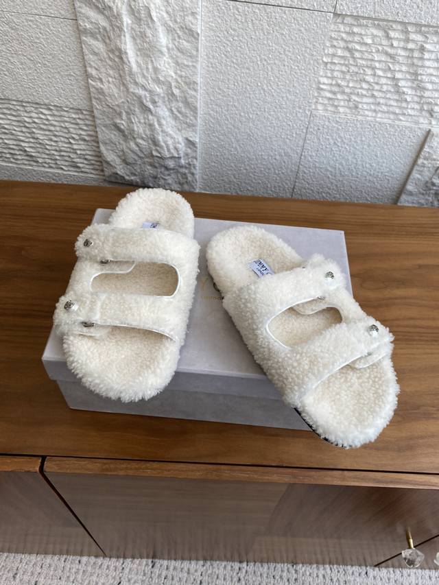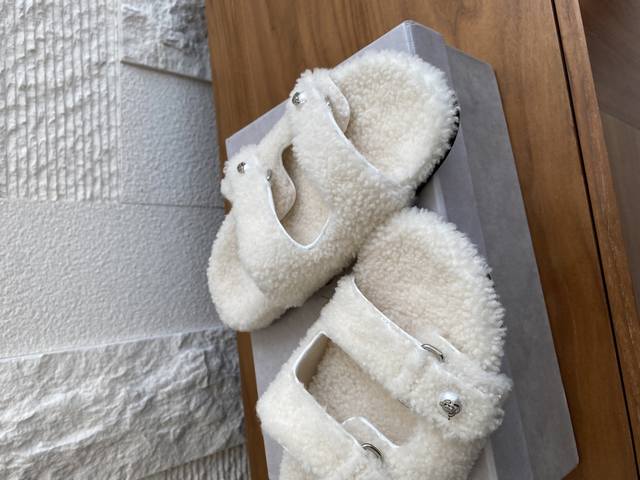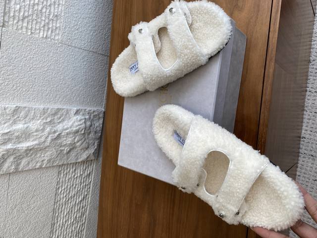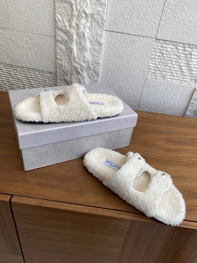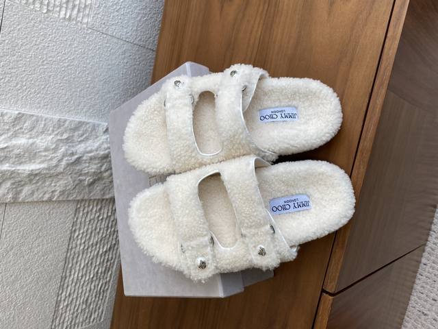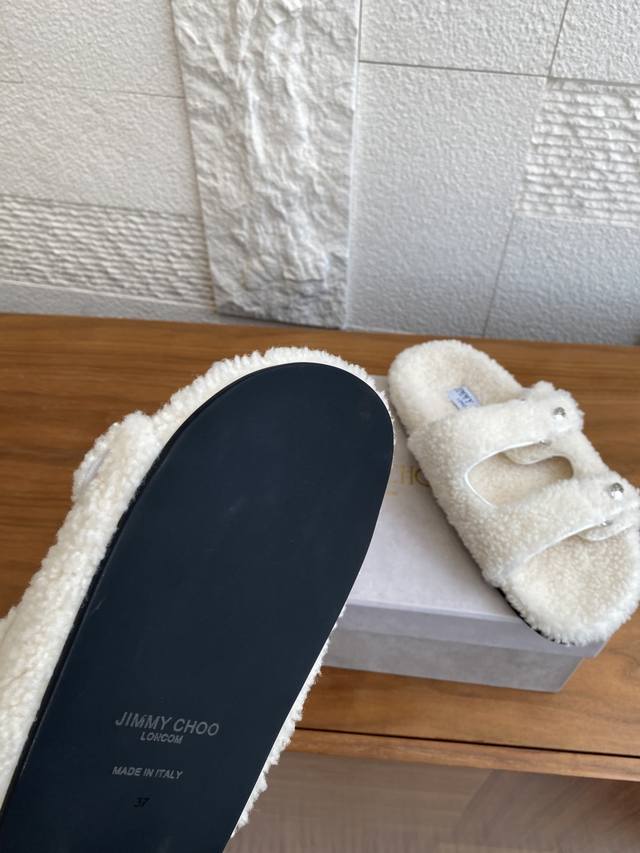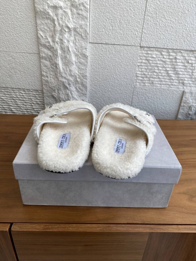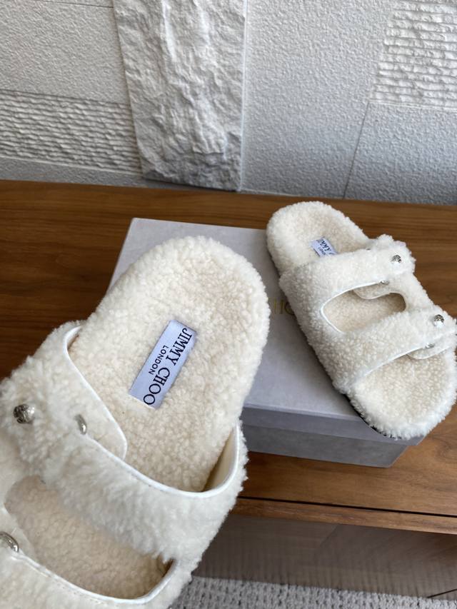 / 顶级版本: Jimmy Choo 吉米周 25Ss 秋季新品 一脚蹬 毛毛拖 珍珠扣 平底 毛拖鞋 Jc这款慵懒一脚蹬毛拖,毛茸茸的羊毛是选用欧洲进口A级羊毛,