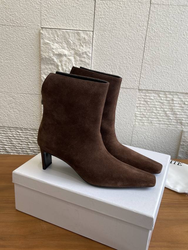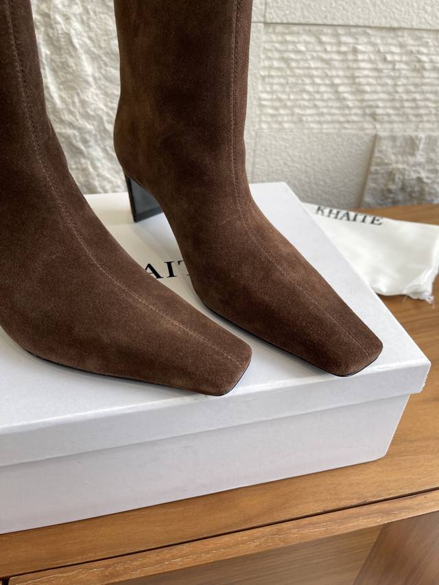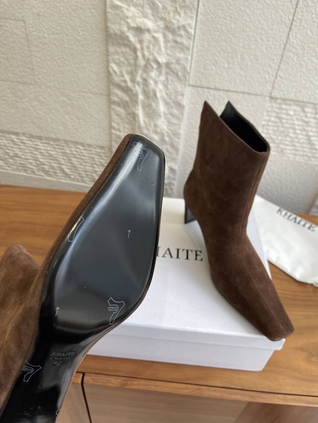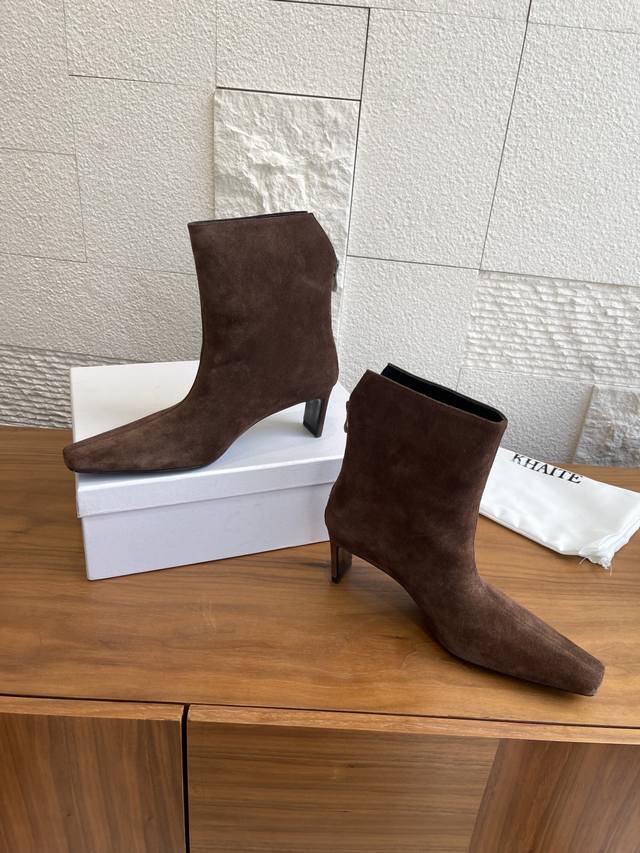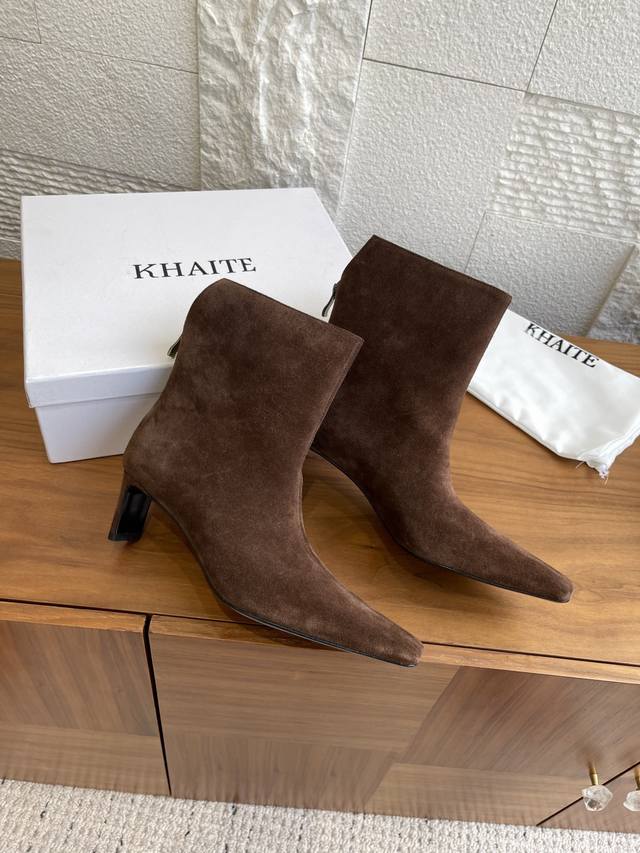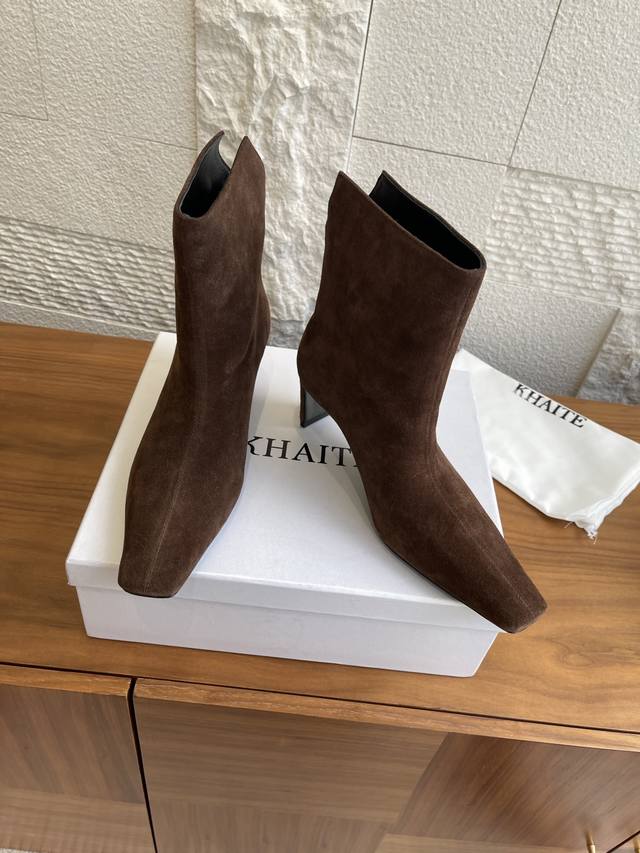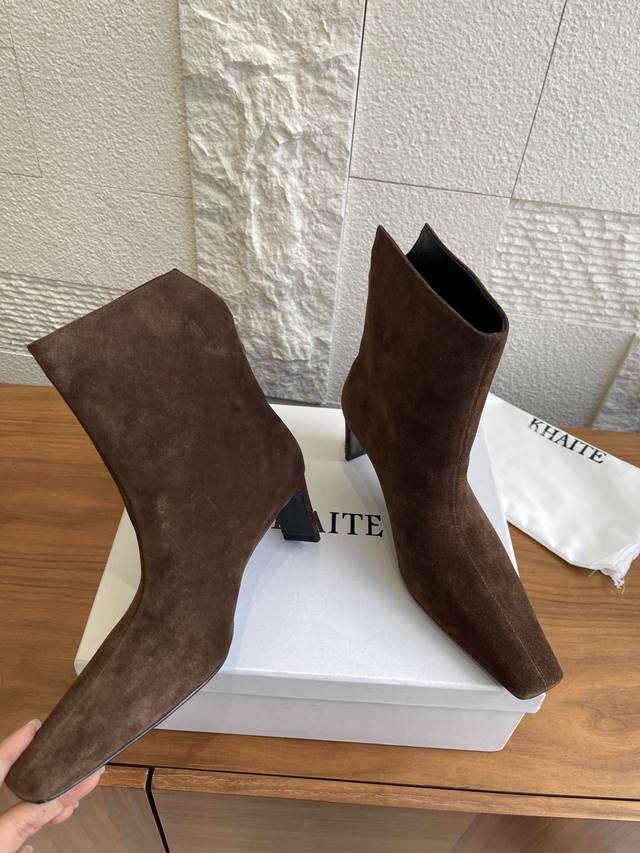 / 顶级版本: Khaite 2025 秋冬新款 方头 后拉链 高跟 Ona踝靴 Khaite这款Ona踝靴独特的缺口后背设计,增强了这款绒面皮革的方头踝靴的穿脱便