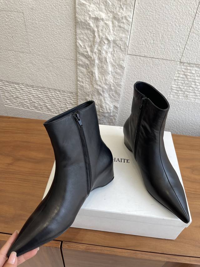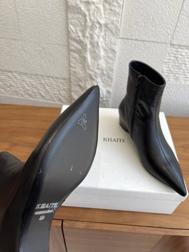 顶级版本: Khaite 25Ss 秋冬新款 尖头 粗跟 Sybil踝靴 侧拉链 短靴 Khaite 这款“Sybil” 踝靴采用植鞣亮面皮革悉心打造,皮料会随