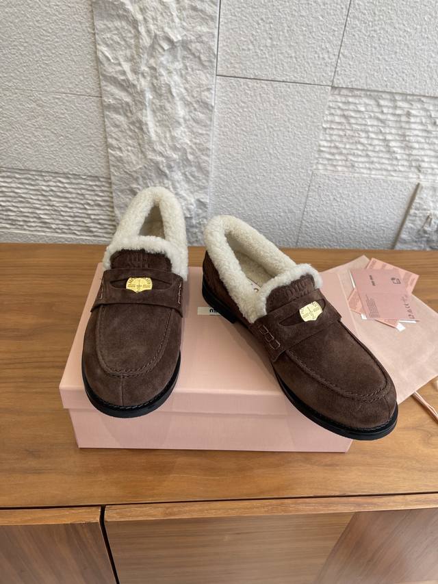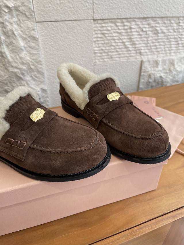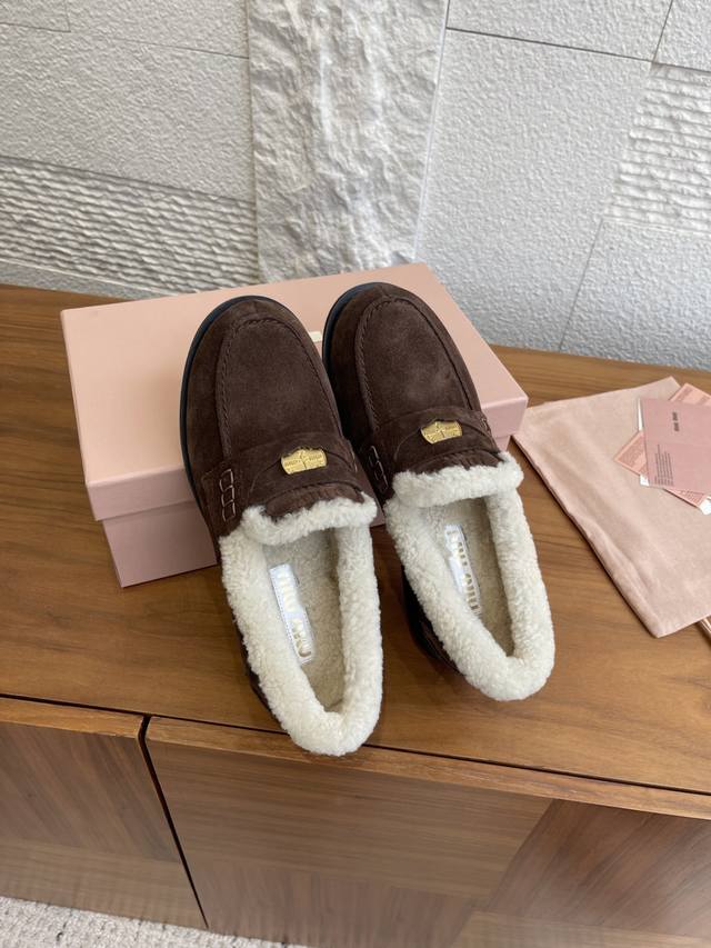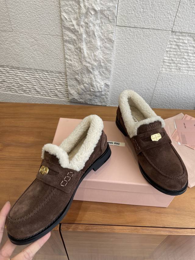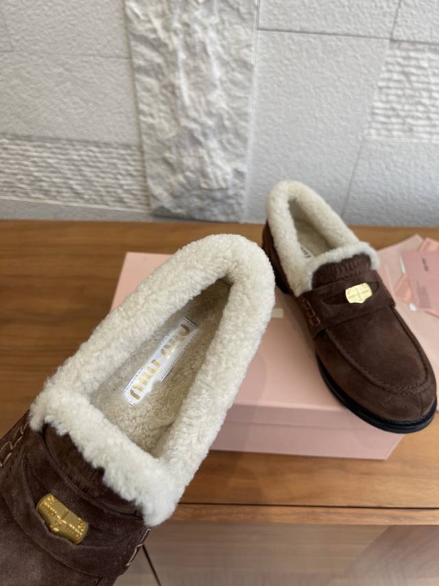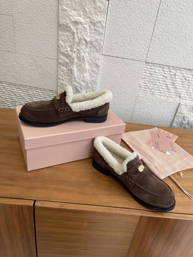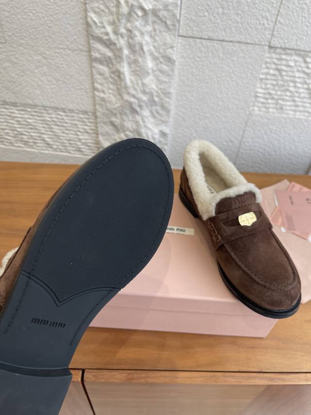 顶级版本: DDD Miu Miu缪缪 2025 秋冬新款 金币 羊毛内衬 乐福鞋 DDD 这款Miu Miu秋冬钱币毛毛乐福鞋,高丝光牛皮+真羊毛内里,柔软又保暖,秋冬穿着超舒服。鞋面有经典“小钱币”装饰,细节满分。圆头+一脚蹬设计,复古又百搭,通勤休闲都能Hold住。防滑鞋底,走路更安心。搭配袜子学院风,配大衣毛衣氛围感直接拉满,是秋冬穿搭必备单品! DDD 面料:进口牛皮 高丝光牛反绒 开边珠 DDD 内里:羊毛 DDD 大底:原版开模橡胶大底 DDD Size:35-40 40定做不退换 DDD