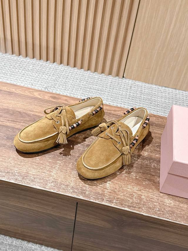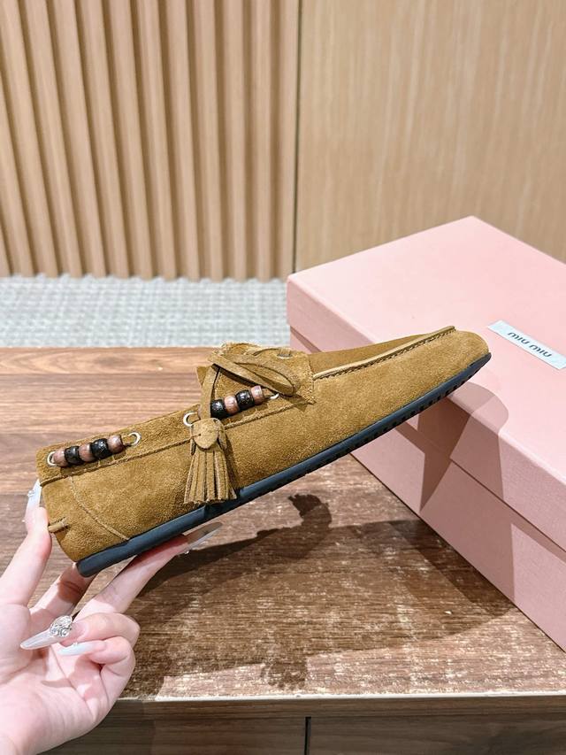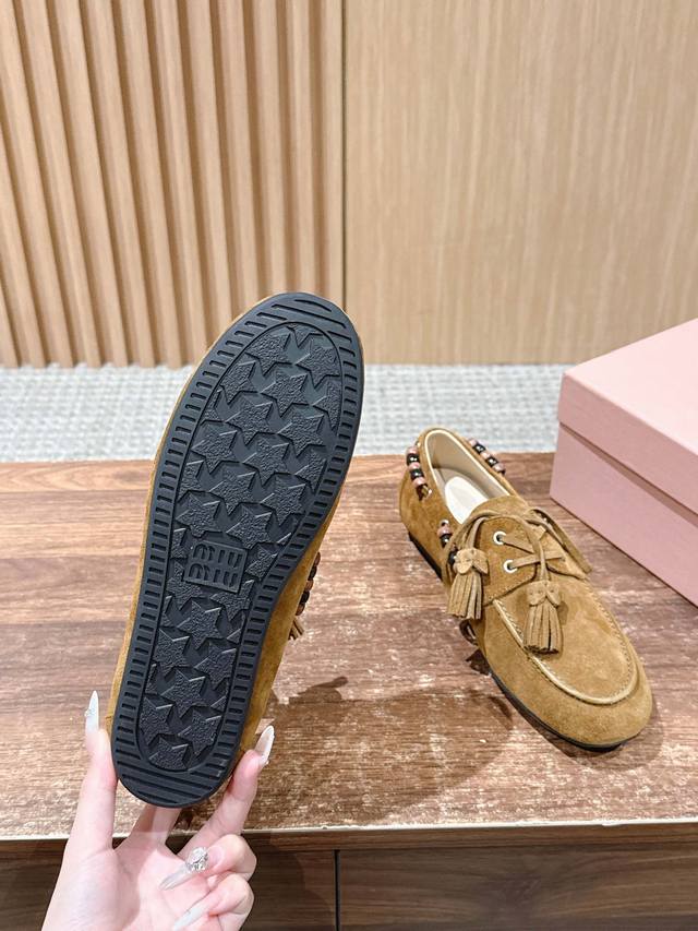 顶级版本 Miu Miu 缪缪秋冬新款Deck Shoes麂皮船鞋平底鞋 一脚蹬 复古鞋~ 俏皮的系带流苏,复古的干异色系,内里磨毛的 设计让穿着体验度更加高涨 非常舒适又洋气 也太有设计感了吧,秋冬氛围感拉满,舒适又时尚 牛反绒材质 双面绒内里 原版开模橡胶大底 Size:35-39 40定制不退换