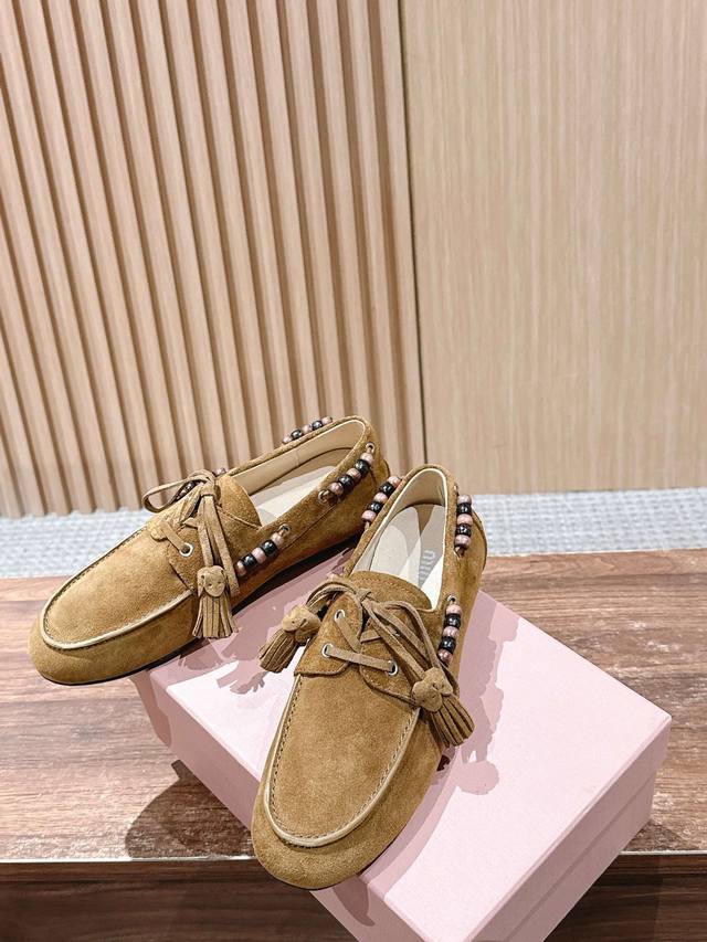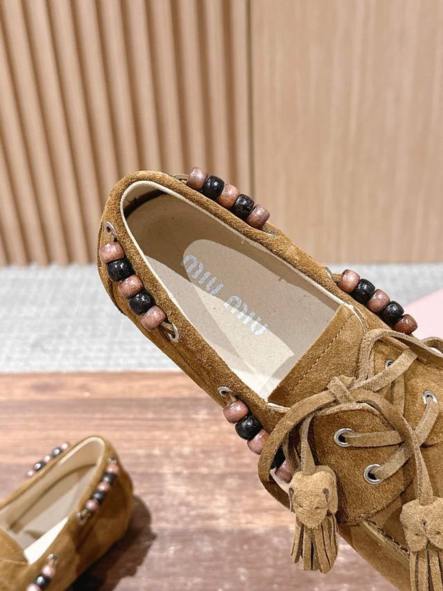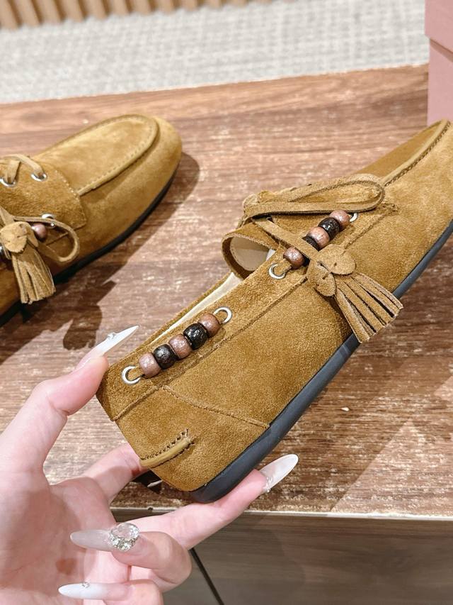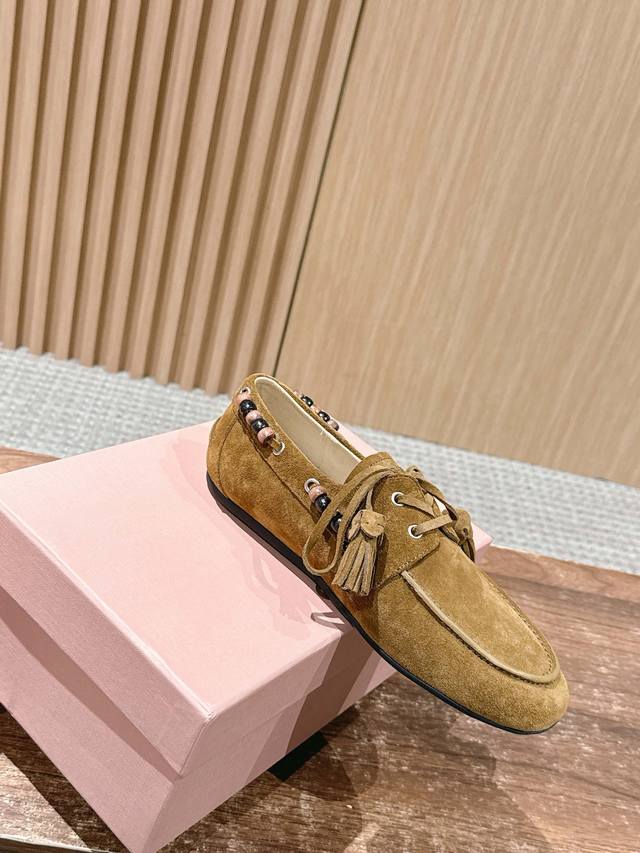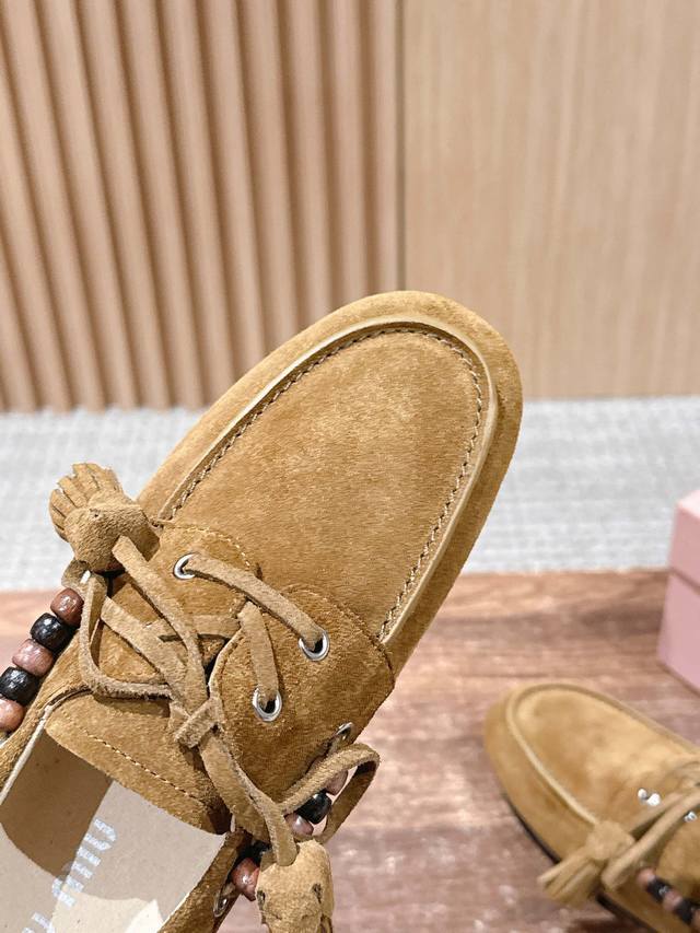 顶级版本 Miu Miu 缪缪秋冬新款Deck Shoes麂皮船鞋平底鞋 一脚蹬 复古鞋~ 俏皮的系带流苏,复古的干异色系,内里磨毛的 设计让穿着体验度更加高涨